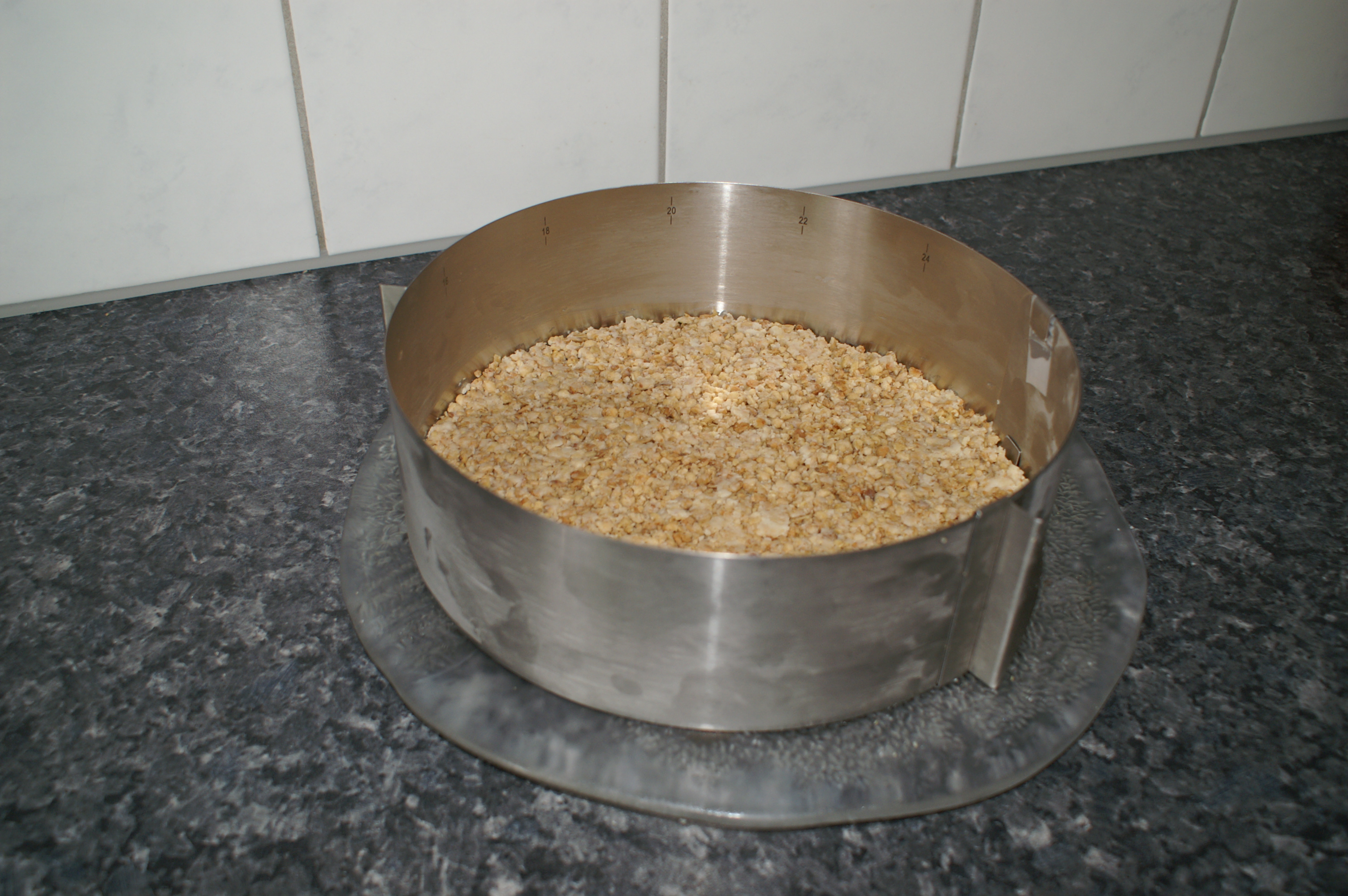 Für den Tortenboden muss die weisse Couverture in einem Wasserbad geschmolzen werden. Es geht schneller, wenn man sie zuvor in grobe Stücke zerkleinert. Nun das Müsli in einen Beutel geben und mit einer Teigrolle hacken. Danach zu der geschmolzenen Couverture geben und als Boden in den Tortenring füllen. Die Mischung sollte mit einem Löffel oder mit den Händen gut festgedrückt werden. Den Boden ca. 1 Stunde trocknen lassen.
