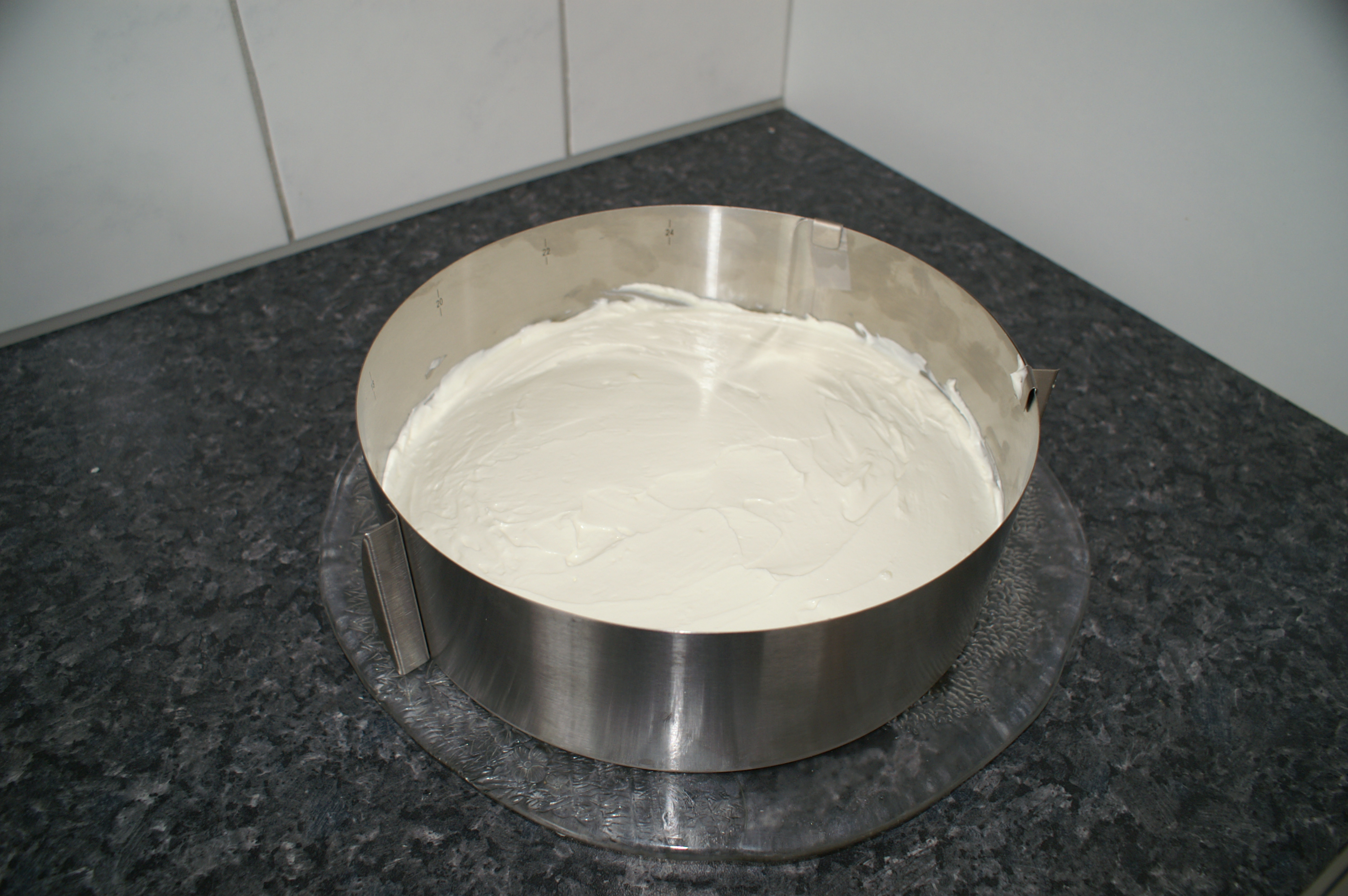 Jetzt die Quarkmischung auf den Tortenboden streichen und für mindestens 1 Stunde in den Kühlschrank stellen.