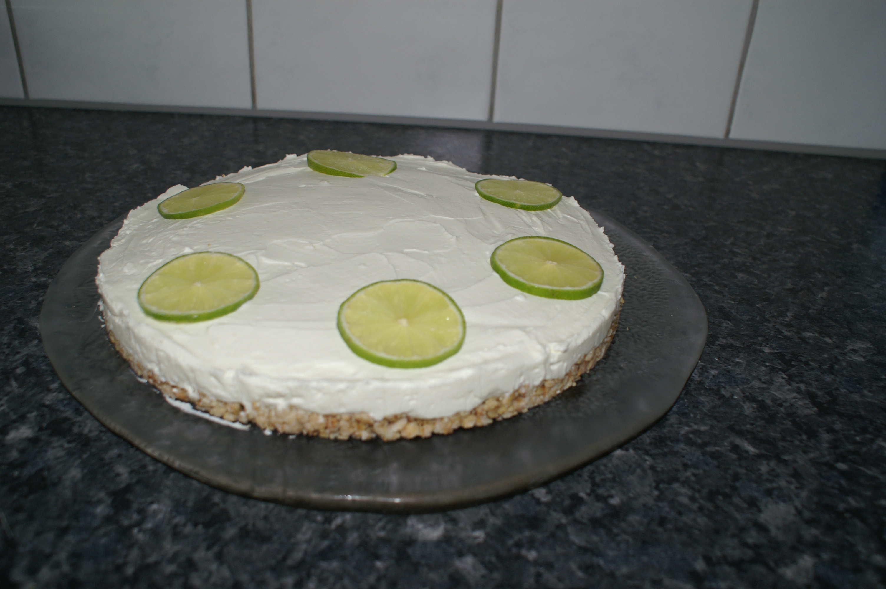 Die Limetten waschen und in dünne Scheiben schneiden. Die Torte mit den Scheiben verzieren.
