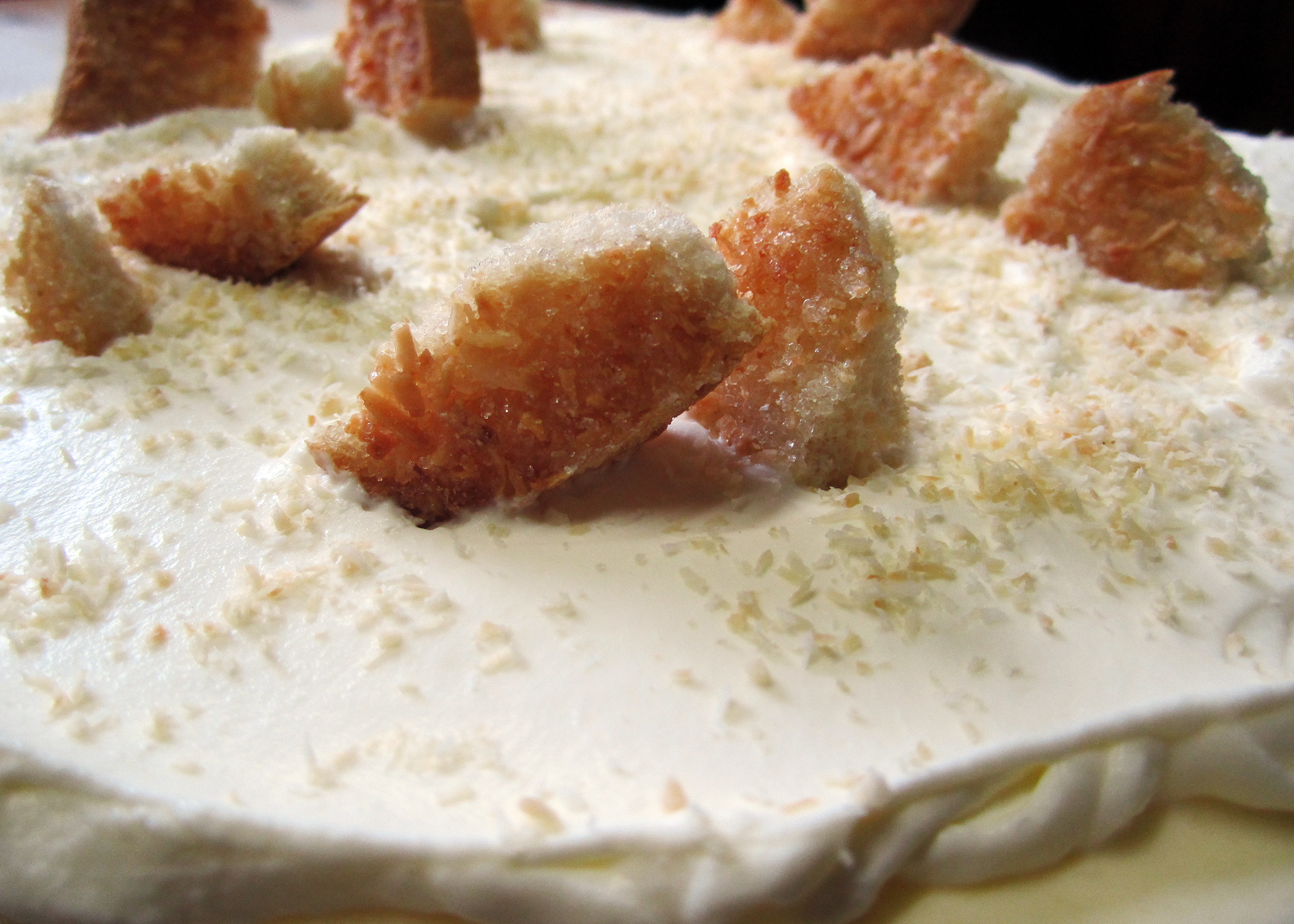 Für die Deko die Kokosraspeln in einer Bratpfanne bei mittlerer Hitze anrösten, sodass sie goldbräunlich werden. 200g Rahm steif schlagen und auf die Torte streichen. Die ausgekühlten Kokosraspel darüberstreuen und mit ein paar zerbrochenen Kokoszwiebäcken dekorieren.