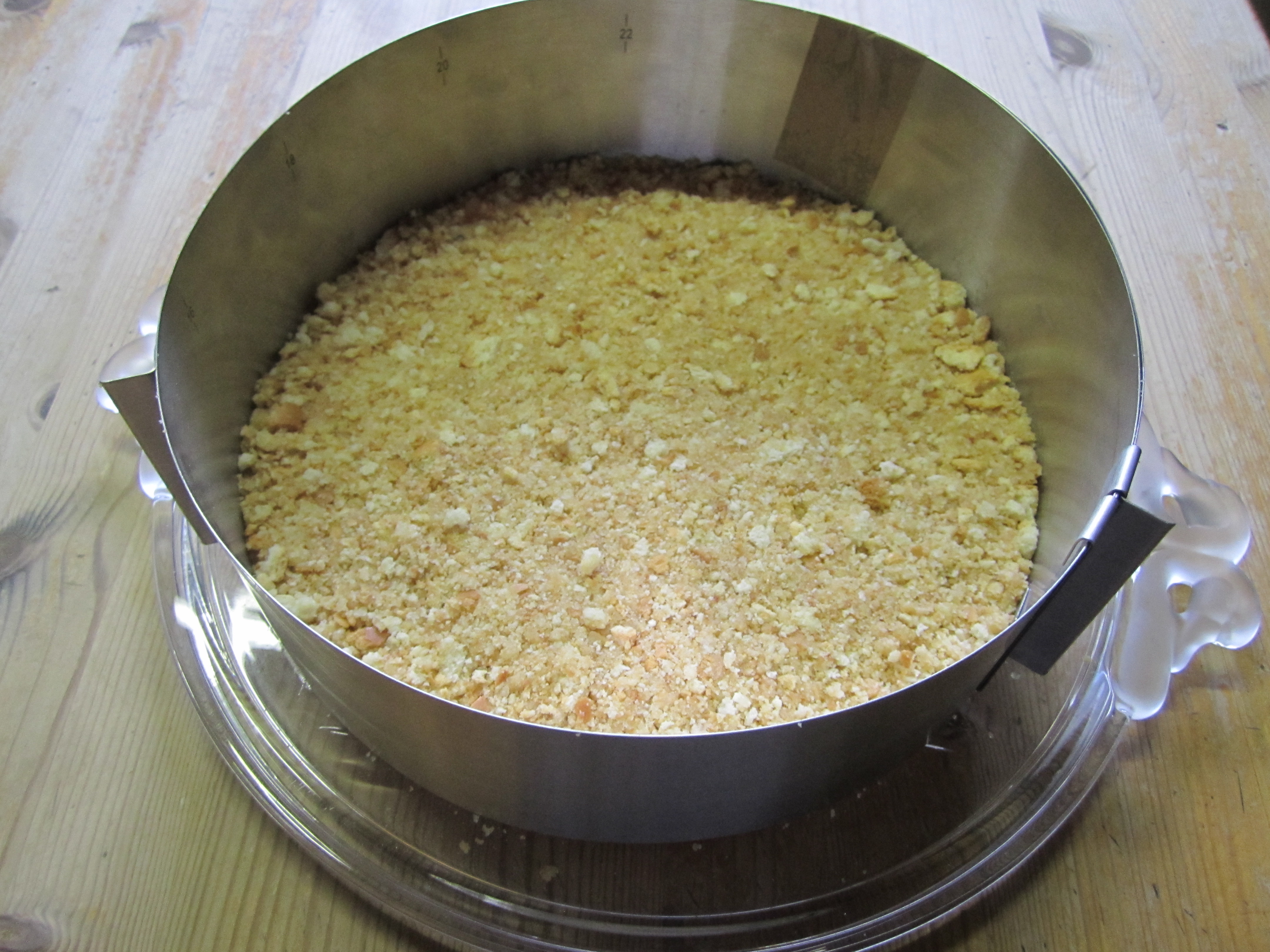 Einen Tortenring(Ø26cm) auf einen Tortenplatte legen und die Platte mit etwas Öl bestreichen, damit sich der Kuchen später gut lösen lässt. Die Butter in einer Pfanne schmelzen und sobald sie flüssig ist, sämtliche Brösel dazugeben und gut mischen. Die Masse in den Ring einfüllen und sehr gut auf die Platte drücken. Etwa 45min kühl stellen.