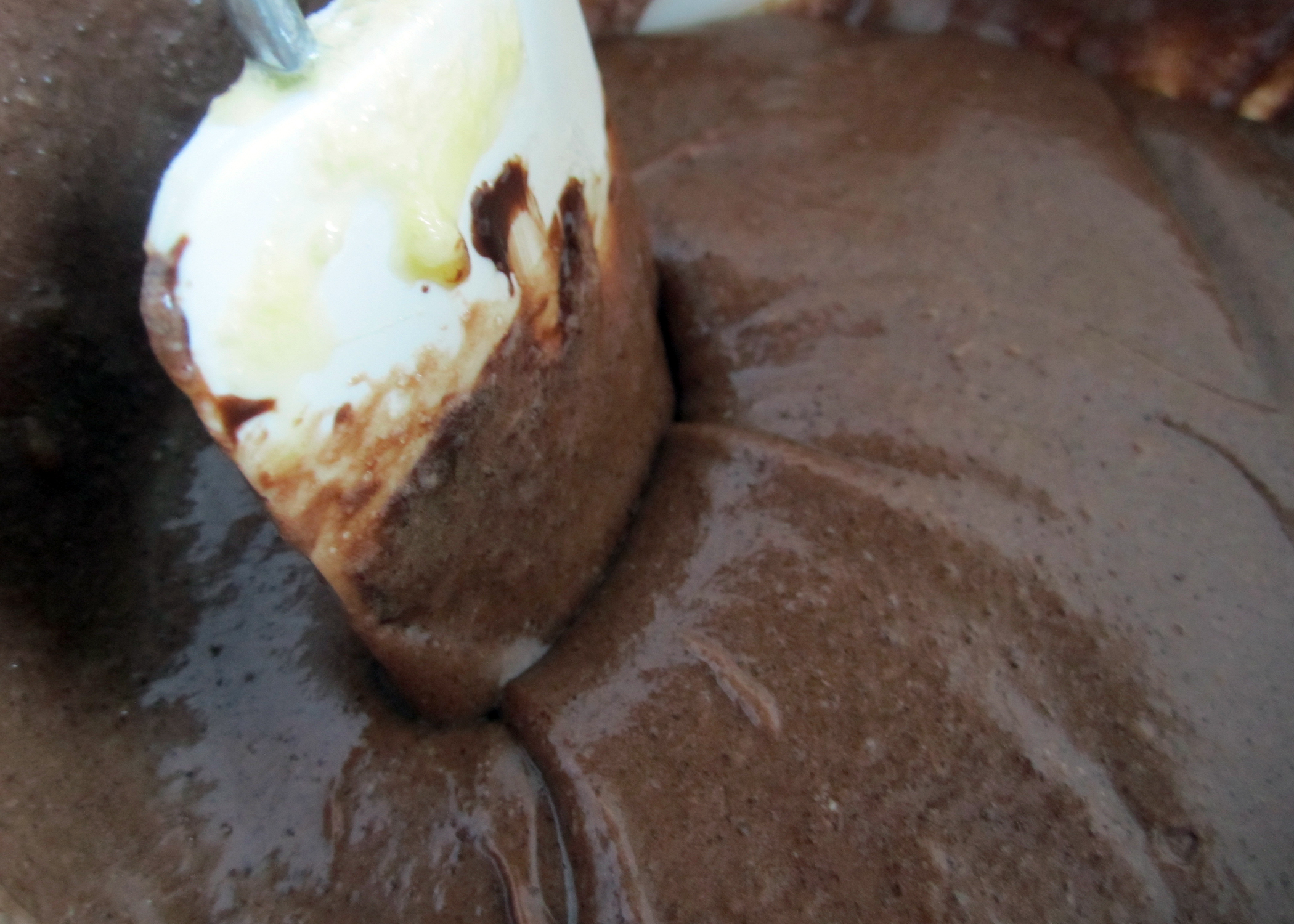 Die Schokolade im Wasserbad schmelzen und mit der Buttermasse vermischen. Mehl und Backpulver mischen und nach und nach unter die Masse ziehen.
