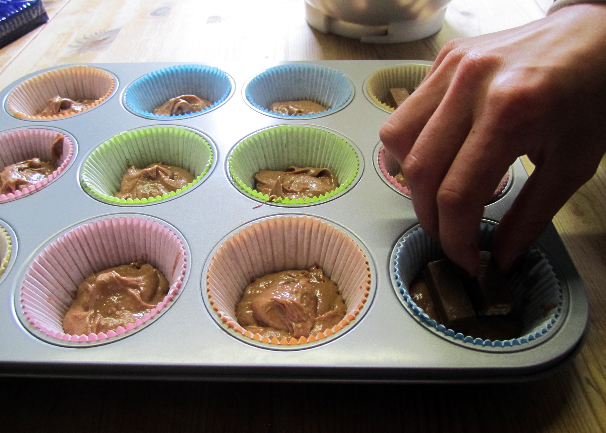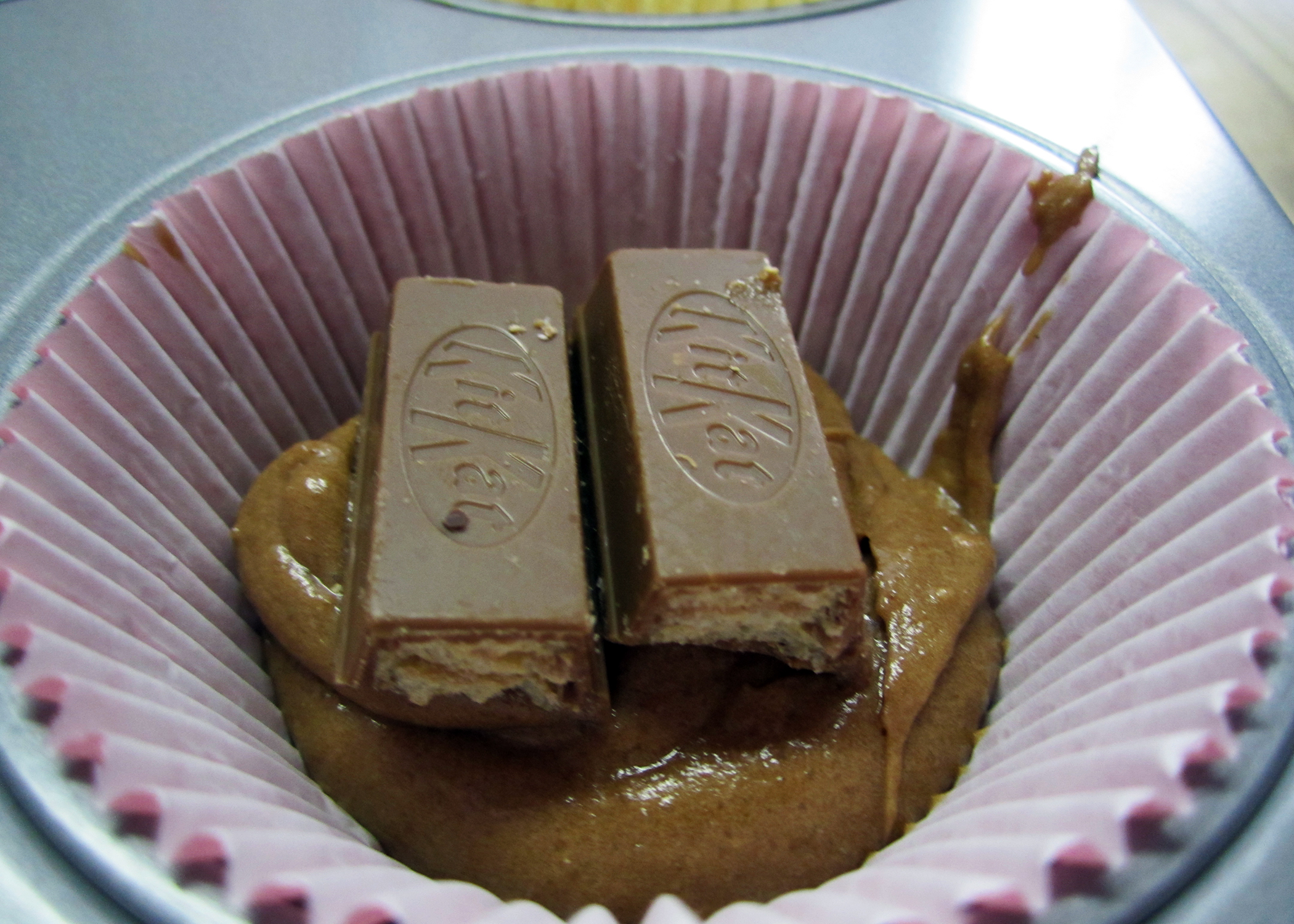 Nun ca. ein Esslöffel Teig in jedes Förmchen geben, damit der Boden ausreichend bedeckt ist. Jeweils zwei Stückchen KitKat darauflegen und den restlichen Teig auf die Förmchen verteilen. Ca. 20min backen und auskühlen lassen.
