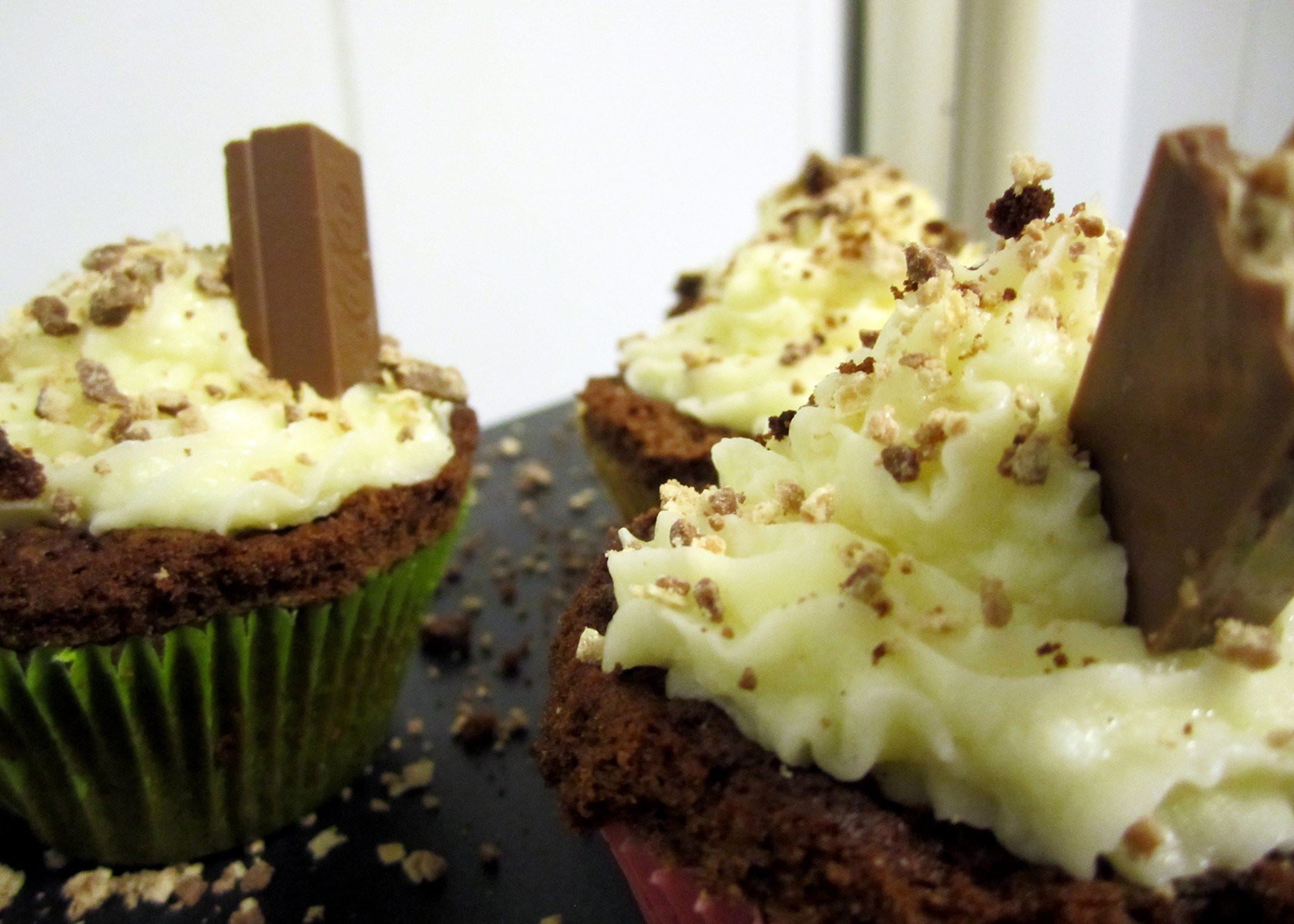 Die Masse in einen Spritzsack füllen und auf die ausgekühlten Cakes spritzen. Ein paar KitKats zerbröseln und die Cupcakes mit Brösel und KitKat-Stücken dekorieren.