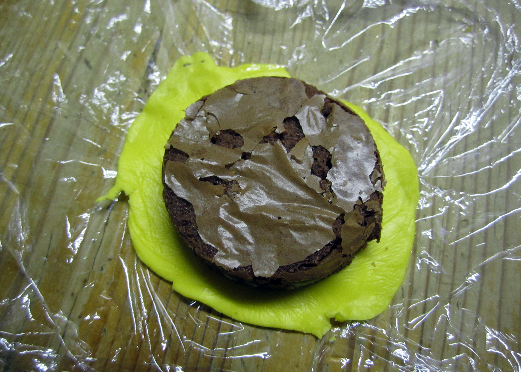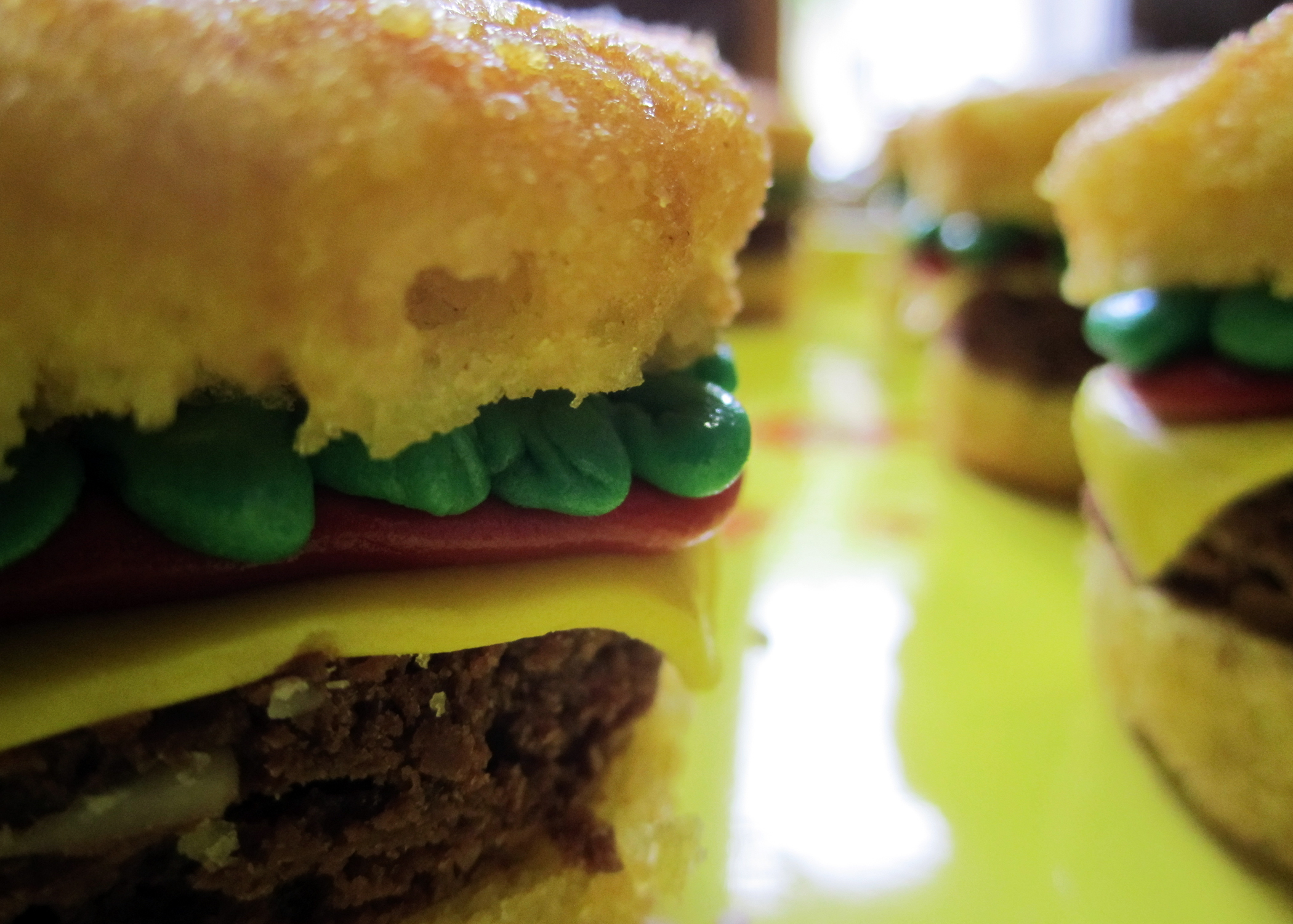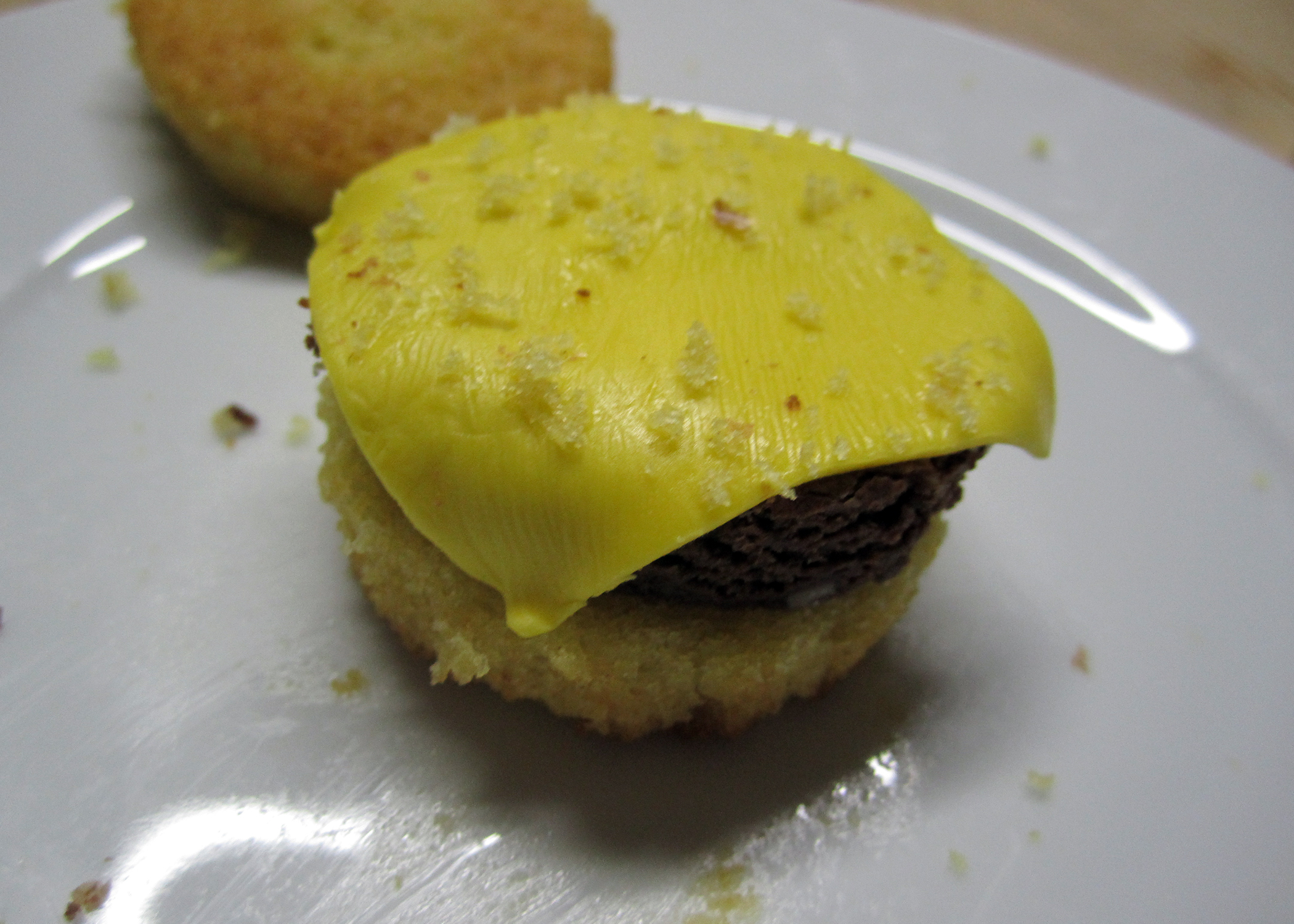 Für das Zusammensetzen der Burger jeweils ein Cake halbieren, sodass zwei gleichdicke Hälften entstehen.Dann etwas gelbes Icing zwischen zwei Frischhaltefolien möglichst dünn auswallen und ein Brownie darauflegen. Um das Brownie herum ein Quadrat ausschneiden und das Brownie samt „Käse“ auf die untere Cakehälfte legen.