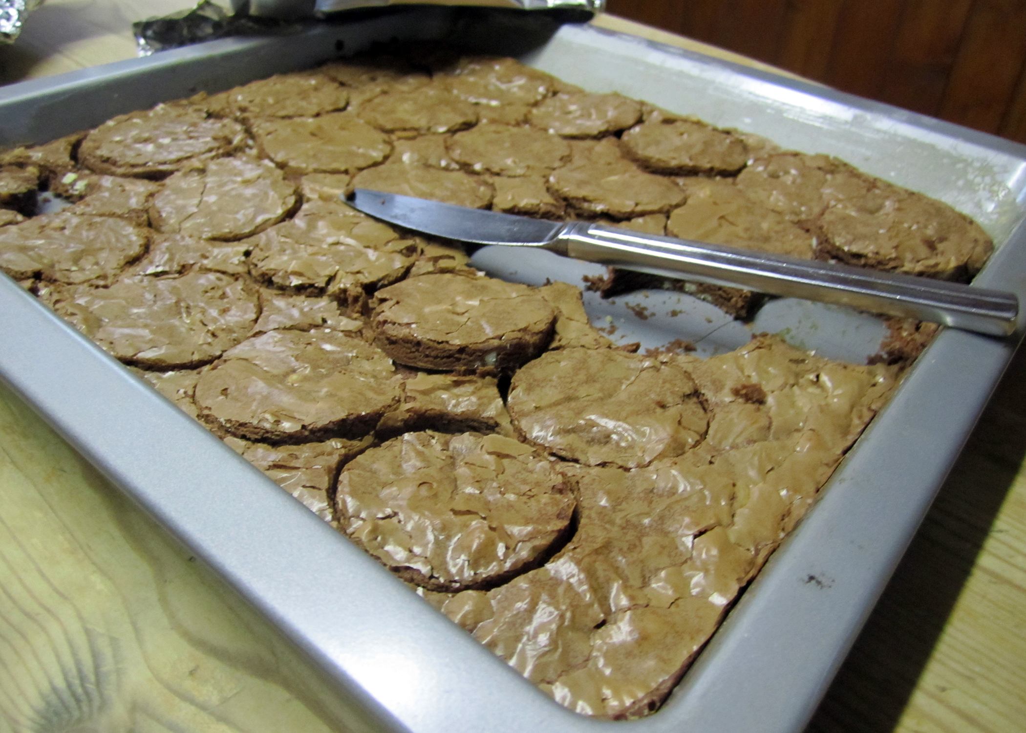 Die Schokolade dazugeben und mischen. Als letztes das Mehl und die Mandelstäbe unterrühren und die Masse auf das Blech geben und glattstreichen. Ca. 15-20min backen. (sollen innen noch feucht sein). Die Brownies ca. 10min auskühlen lassen und mit einem Ausstecher ø5cm 11 Kreise ausstechen. Die Reste kann man in Quadrate schneiden für verspeisen oder verschenken.