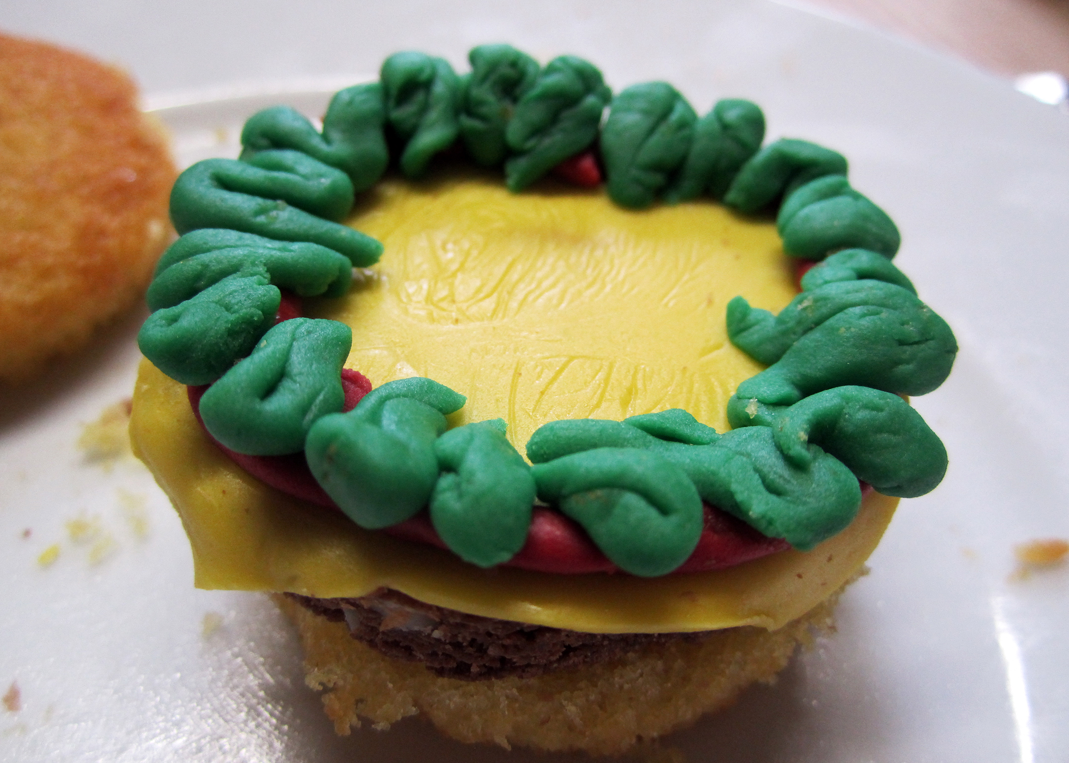 Nun aus wenig rotem Icing von Hand eine dünne Rolle formen und als Ketchup auf den Käse legen. Mit etwas grünem Icing ebenfalls eine etwas längere Rolle formen und wellenförmig(siehe Bild) auf das Ketchup legen.