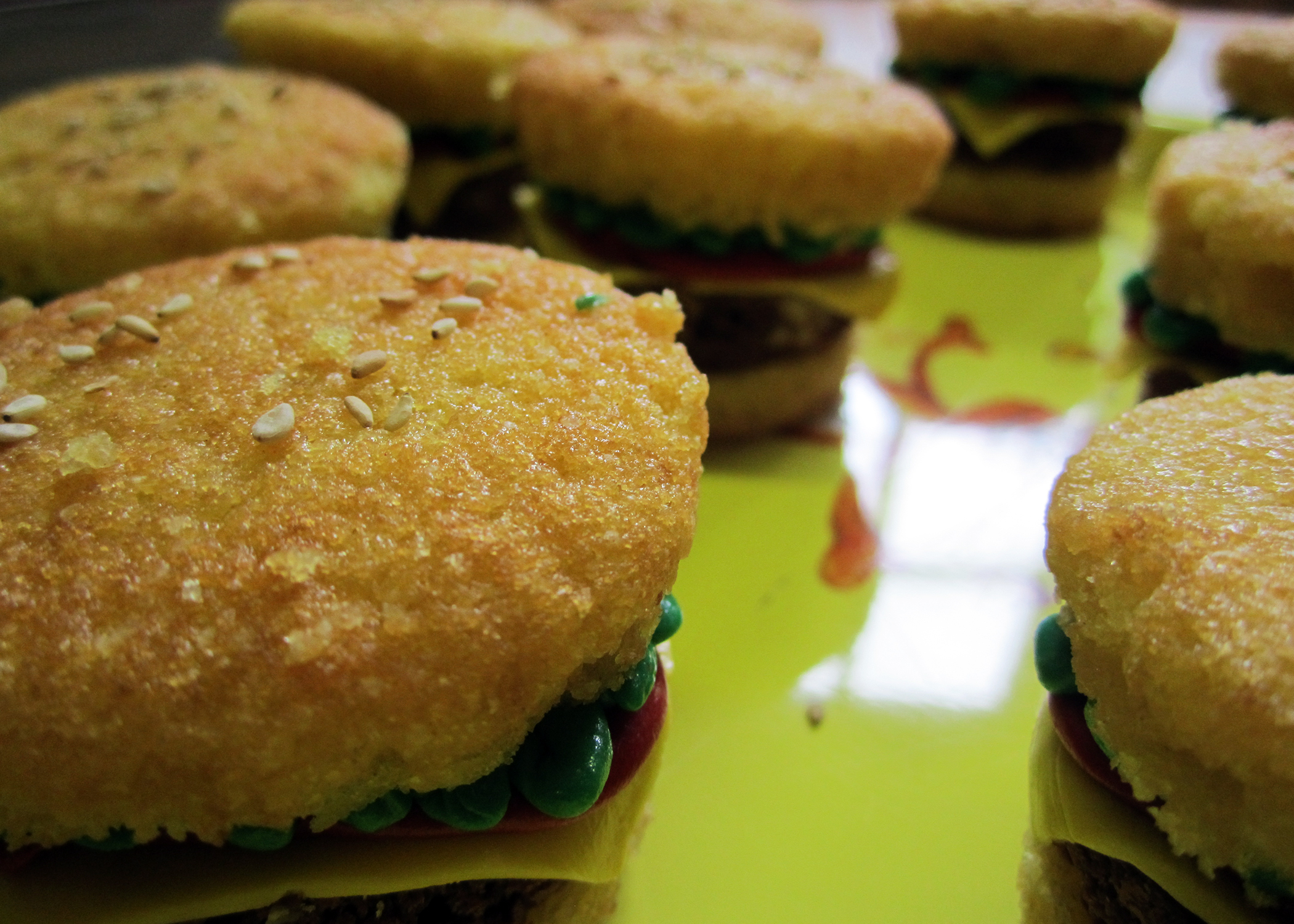 Die zweite Cakehälfte darauflegen und für die Restlichen 10 Stücke wiederholen. Zum Schluss sämtliche Burger mit wenig Sesam bestreuen.