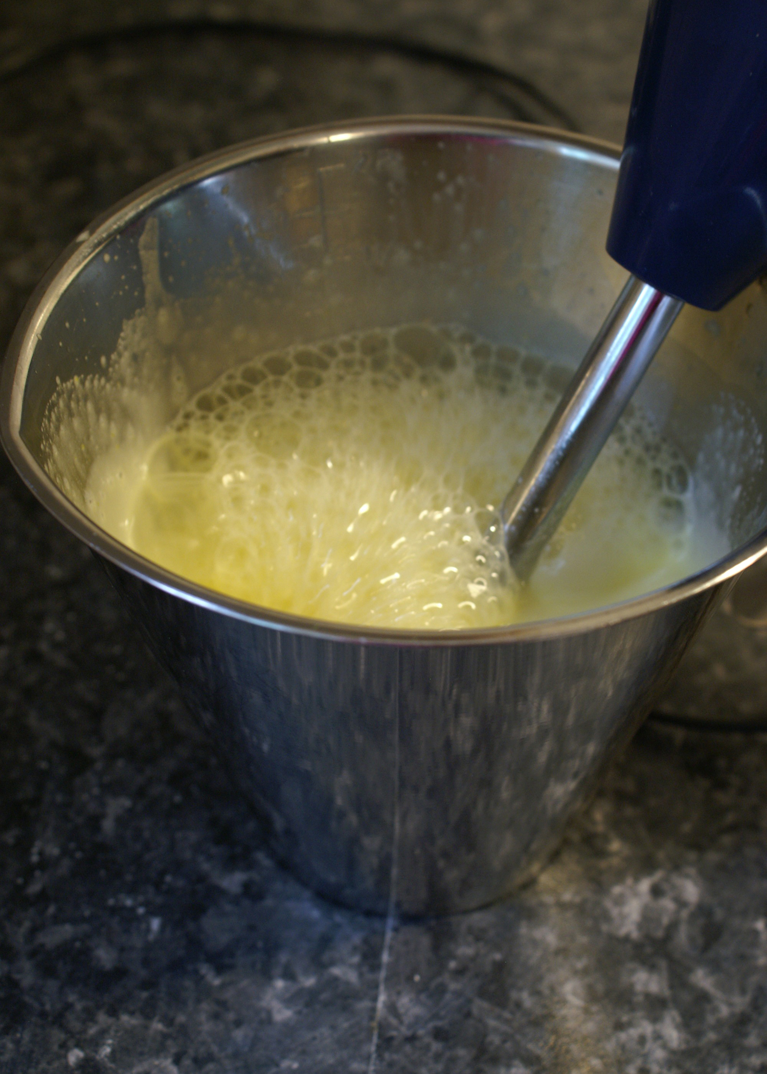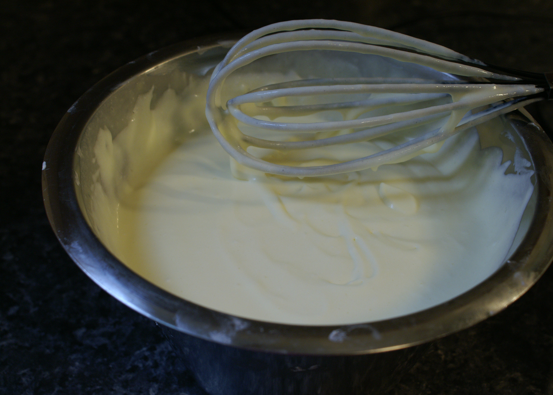 Nun kommt der etwas schwierigere Schritt, bei dem die Gelatine zum Einsatz kommt. Dazu die eingeweichte Gelatine ausdrücken und in einer kleinen Pfanne zum schmelzen bringen. Wenn sie sich vollständig aufgelöst hat, kann man sie unter die Creme rühren. Beim Hinzugeben der Gelatine durchgehend mit einem Schwingbesen rühren. Am besten führt man diesen Schritt zu zweit aus. Wichtig ist es, dass schnell gearbeitet wird, sonst bilden sich Gelatinefäden in der Creme, die im Kuchen alles andere als gut aussehen und dazu auch nicht lecker schmecken! Die Masse kurz kühl stellen, bis zu gelieren beginnt.