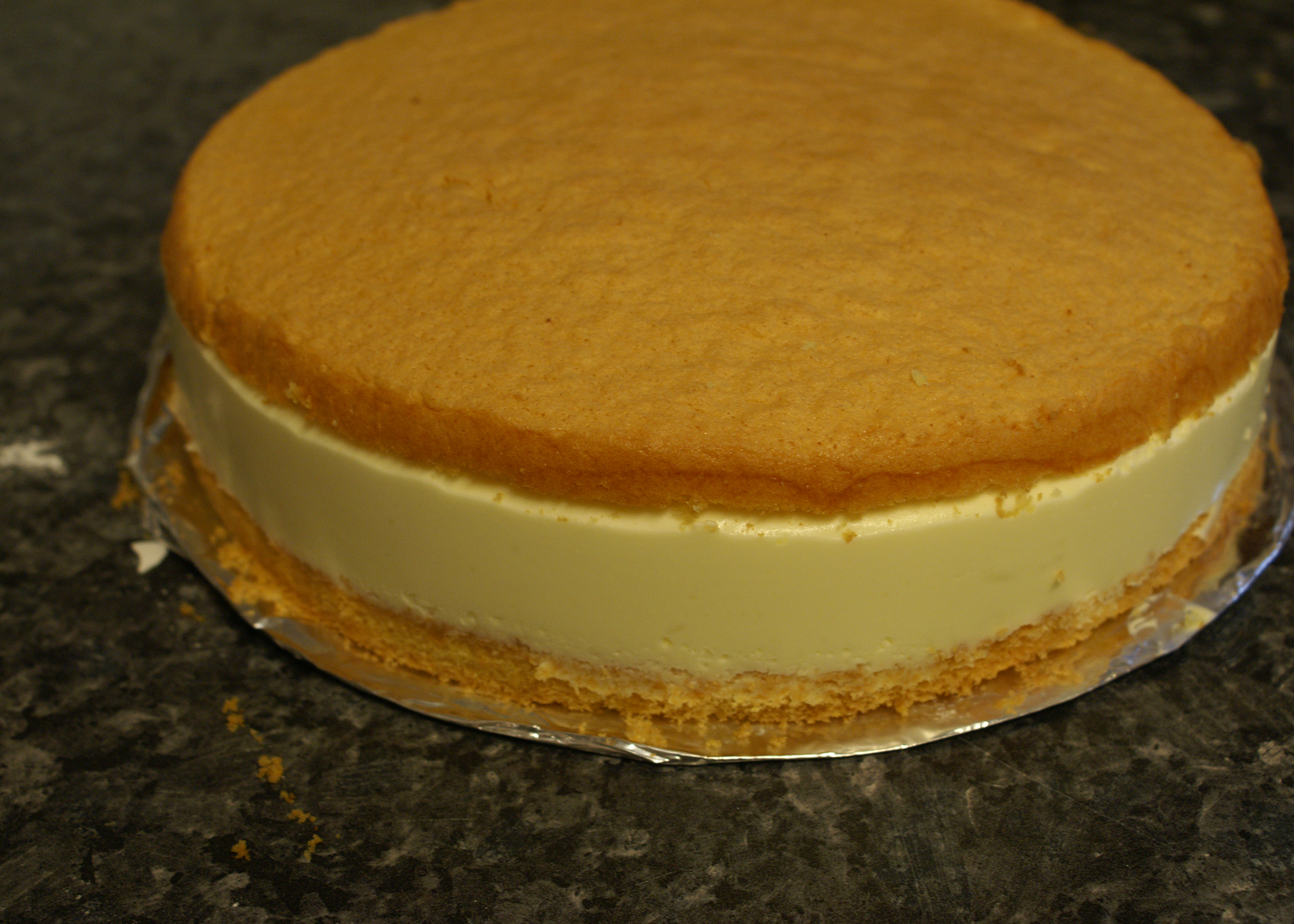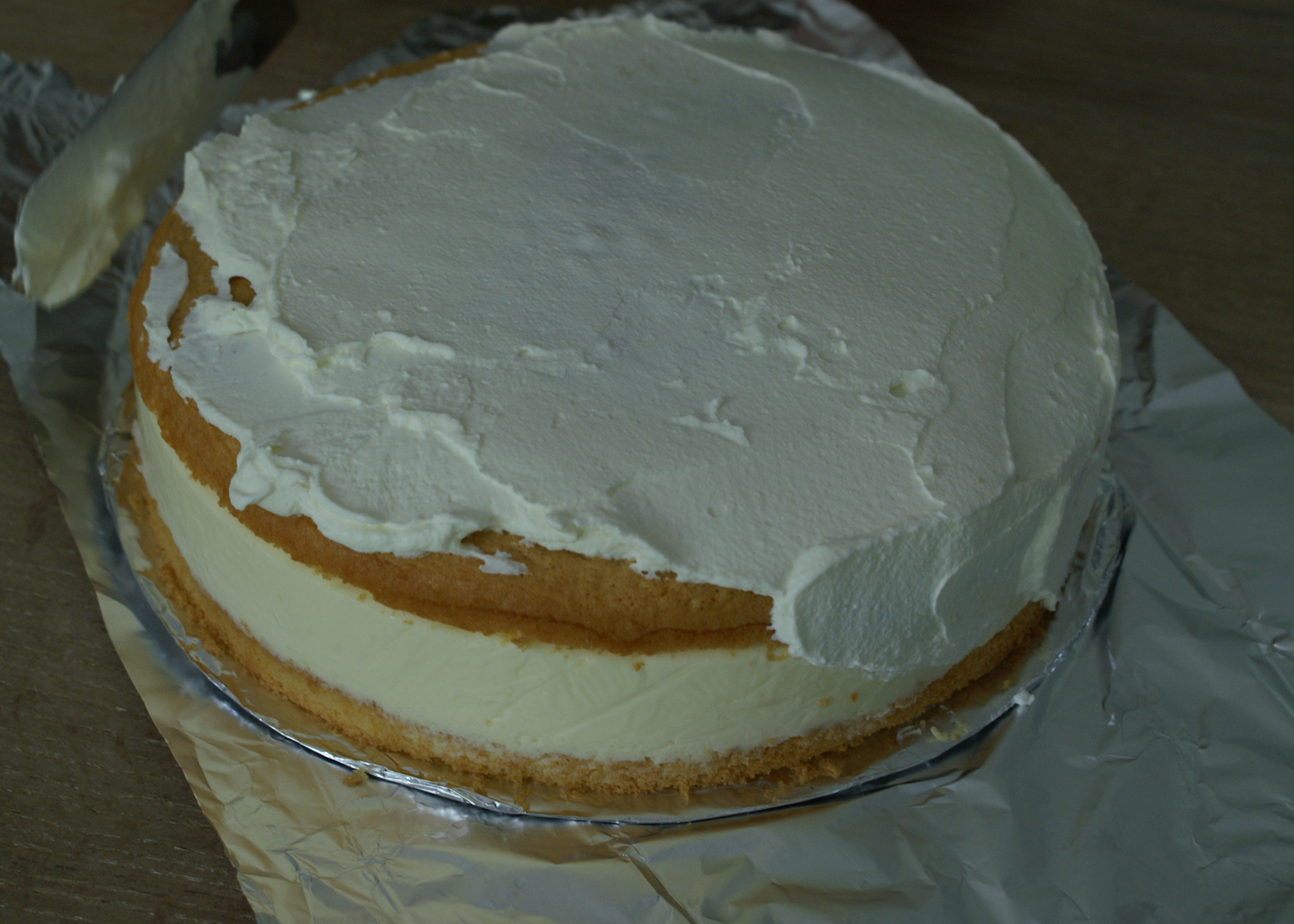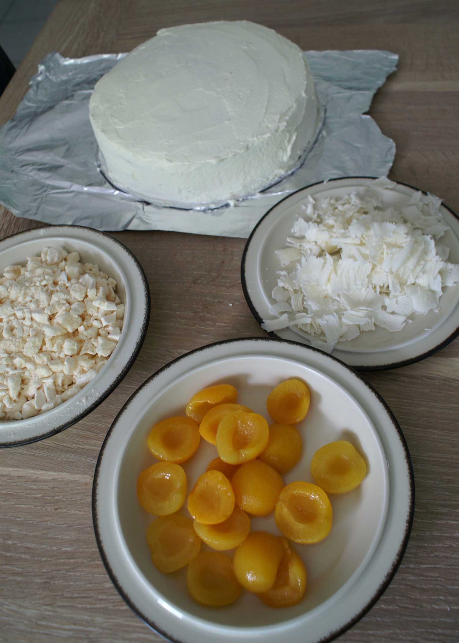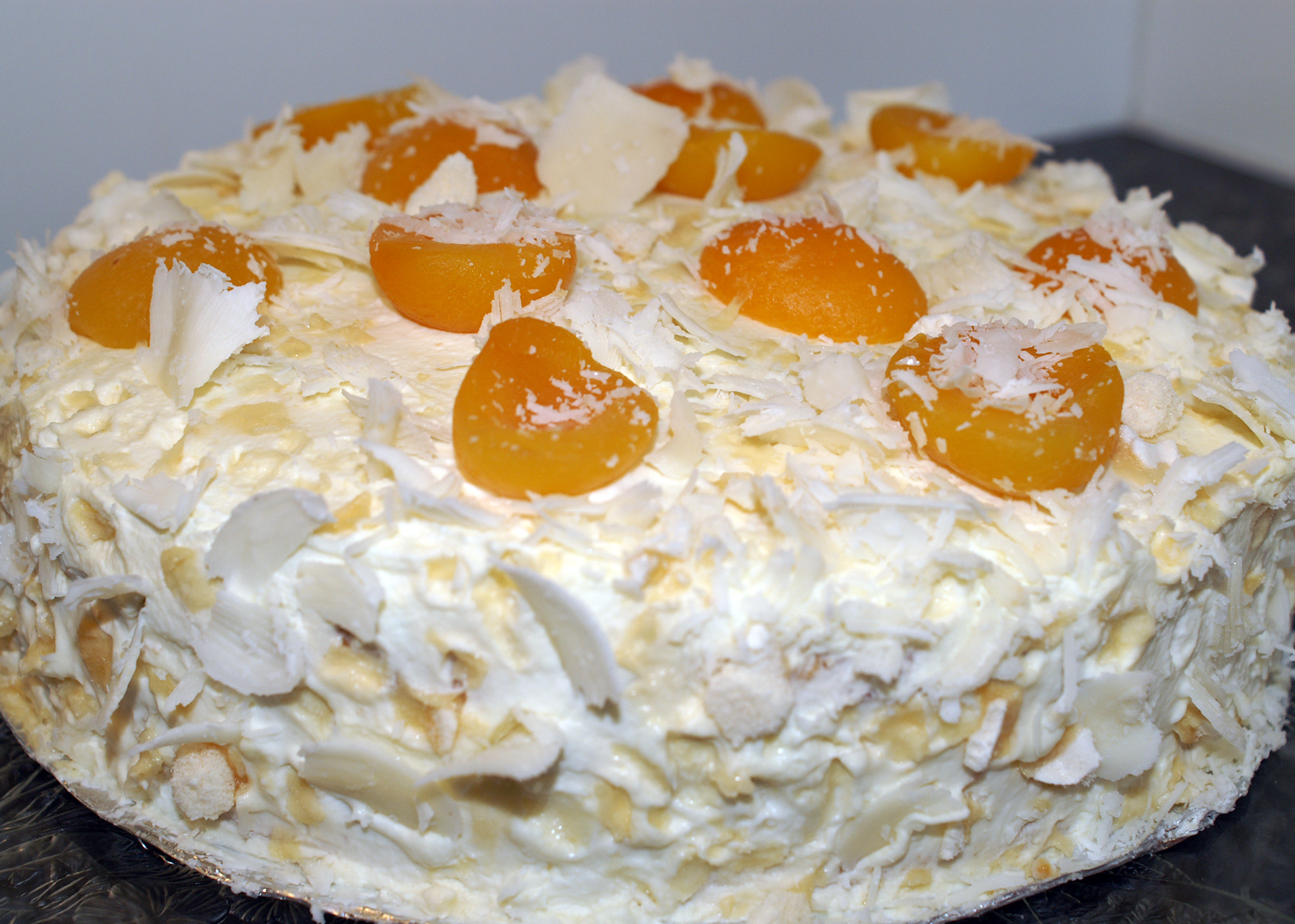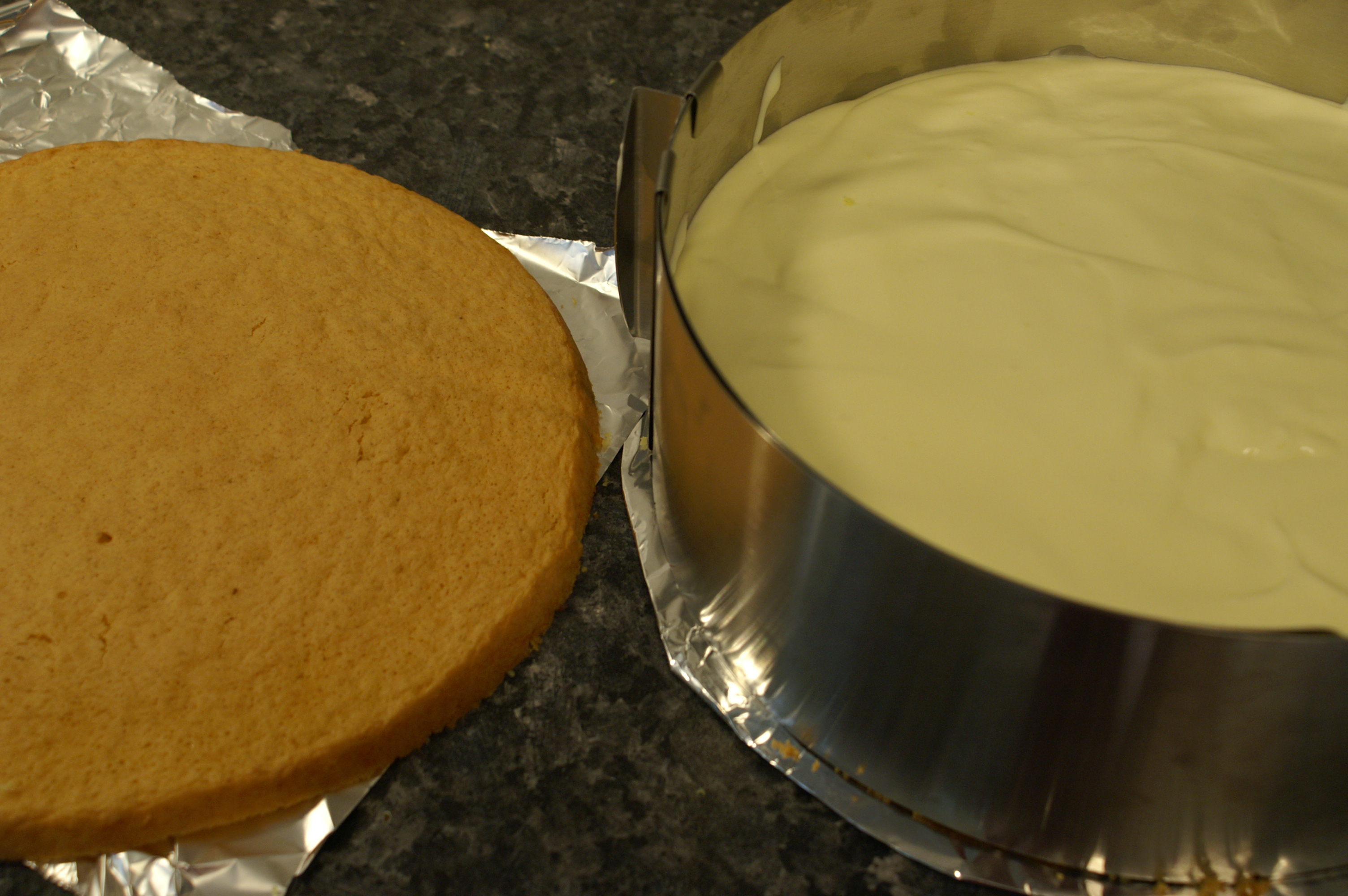 Nun einen Tortenring um den Biskuitboden schliessen. Die Gelatinecreme auf den Boden mit dem Aprikosen streichen. Den Biskuitdeckel darauf legen und den Kuchen für mindestens 5 Stunden kalt stellen.