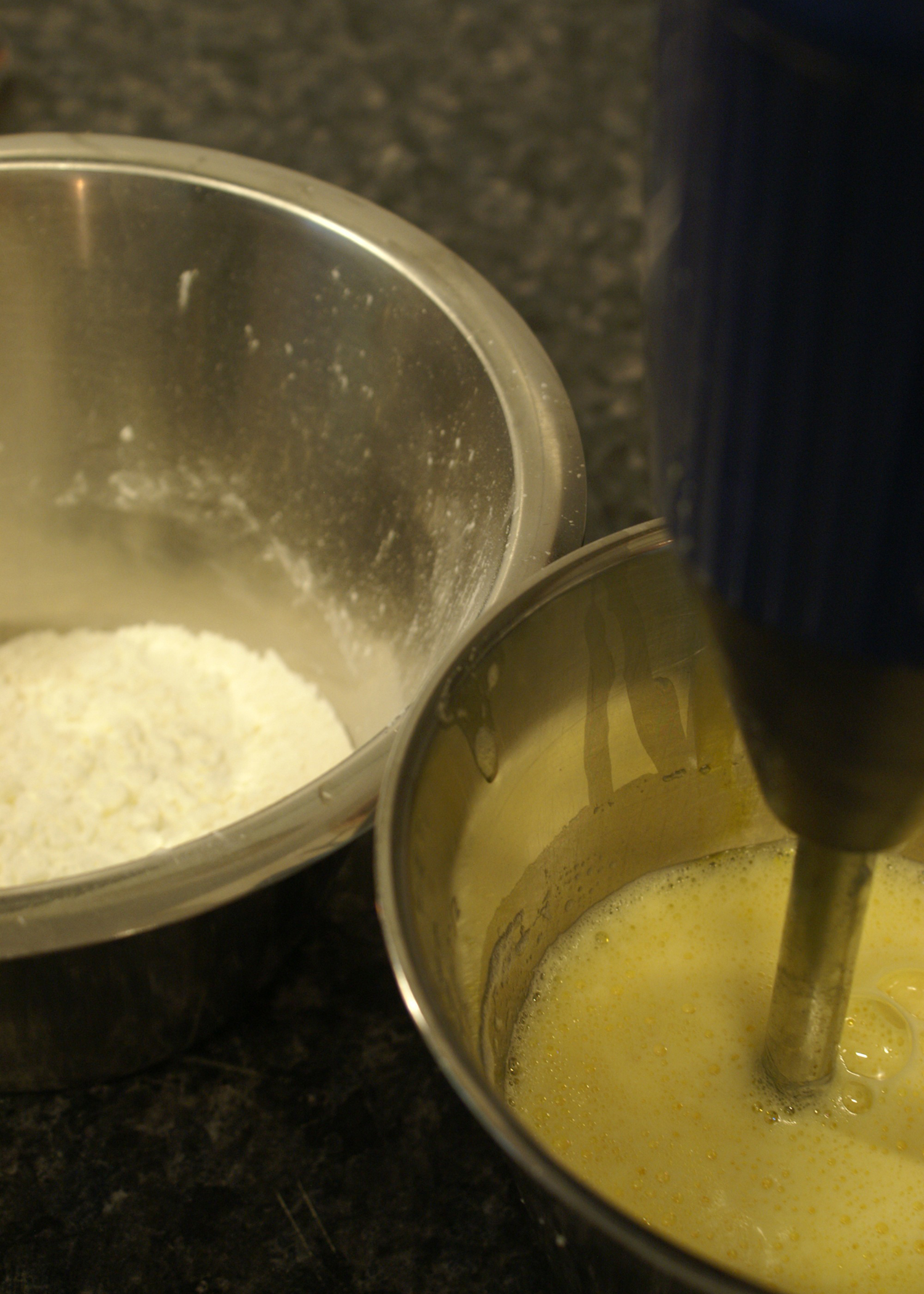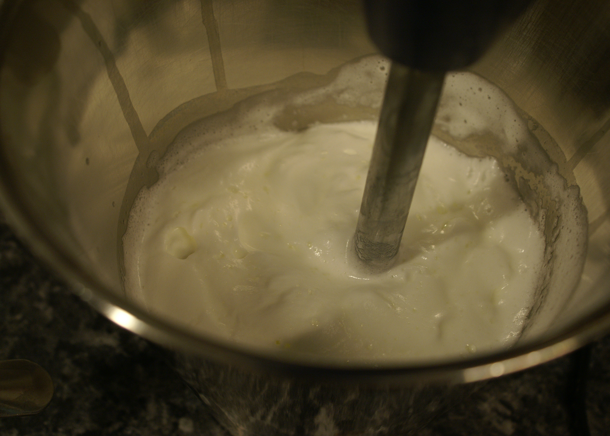 Jetzt kann wieder etwas entspannter gearbeitet werden. In zwei separaten Schüsseln das Eiweiss und 4dl Vollrahm steif schlagen.