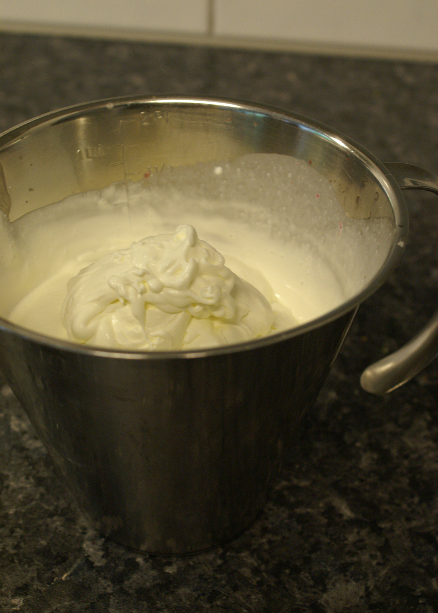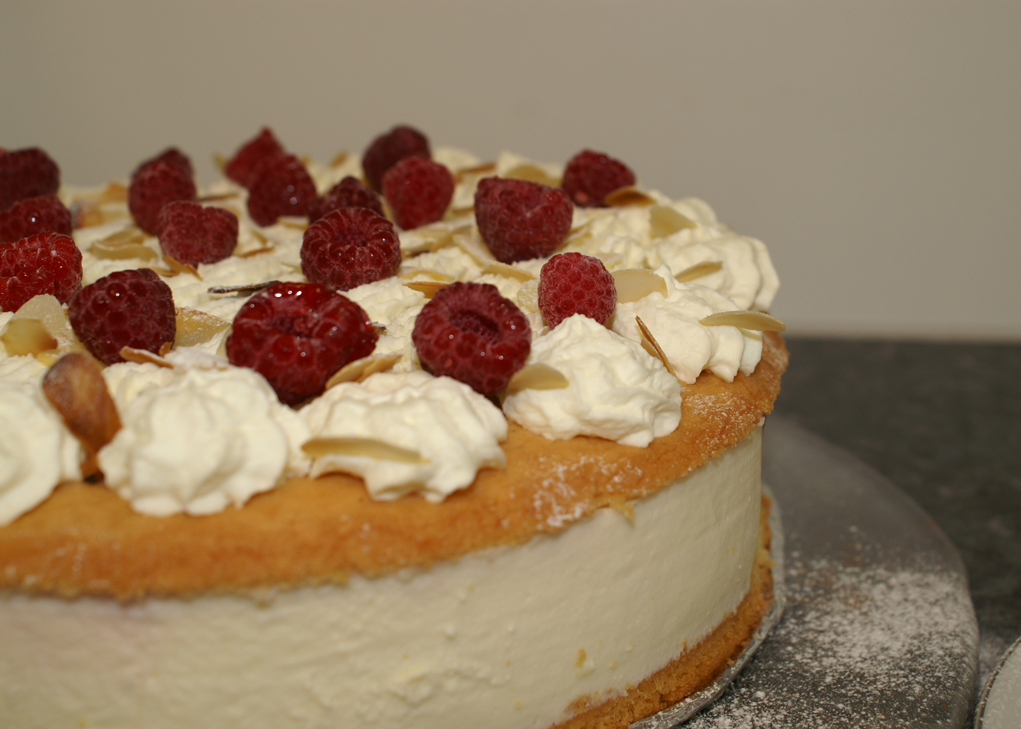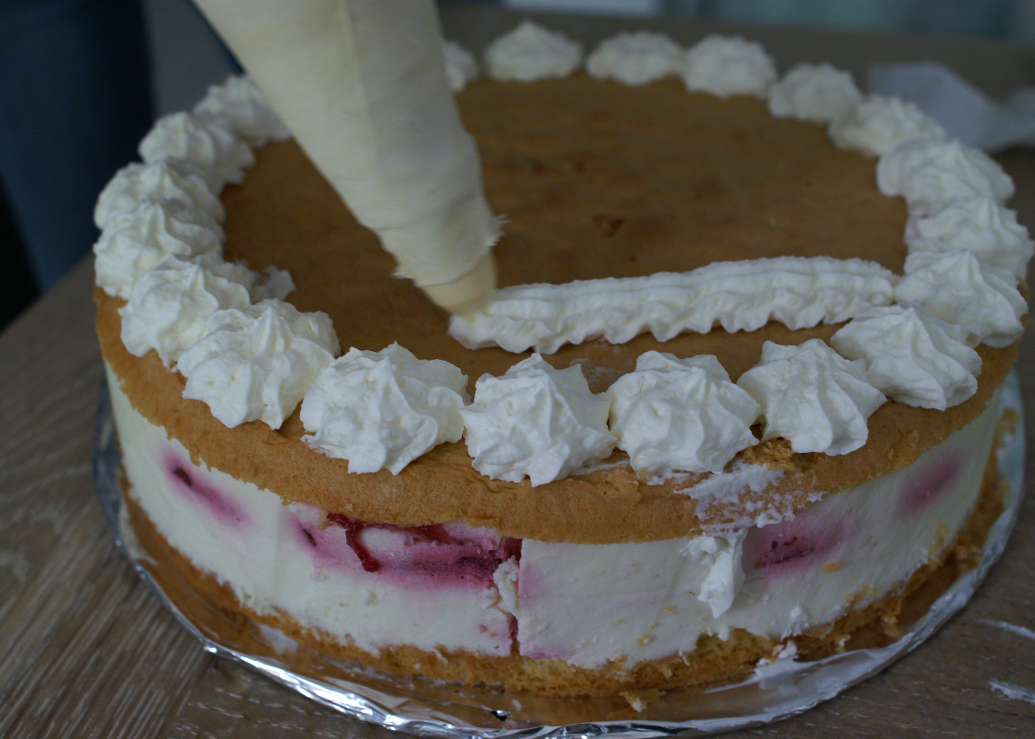 Für die weisse Masse Quark, Zitronensaft und 150g Zucker verrühren und Vollrahm steifschlagen. Die restlichen eingeweichten Blatt Gelatine ausdrücken und ebenfalls bei schwacher Hitze auflösen. Zuerst 3EL und anschliessend den Rest der Quarkmischung einrühren. Zum Schluss den geschlagenen Rahm unterheben.