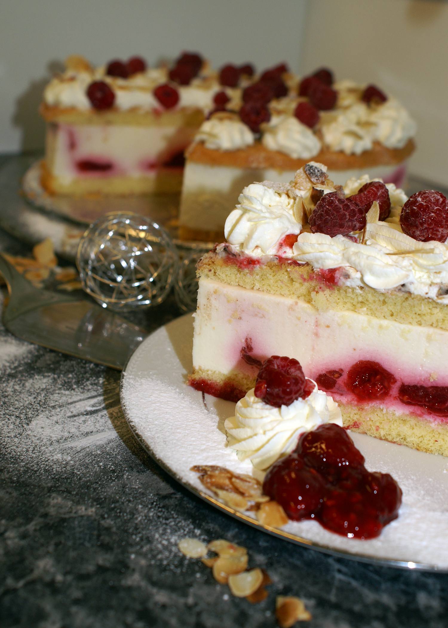 Zwei und zehn Blatt Gelatine in zwei separaten Gefässen in kaltem Wasser einweichen. 200g Himbeeren pürieren, eventuell durch ein Sieb streichen, und mit 25g Zucker verrühren. Nun die zwei Blatt Gelatine bei schwacher Hitze in einer Pfanne auflösen und sofort ca. 3EL Himbeerpüree darunterrühren. Anschliessend das restliche Püree unterrühren und 50g Beeren vorsichtig unterziehen. Nun ca. 15min in den Kühlschrank stellen, sodass es zu gelieren beginnt.