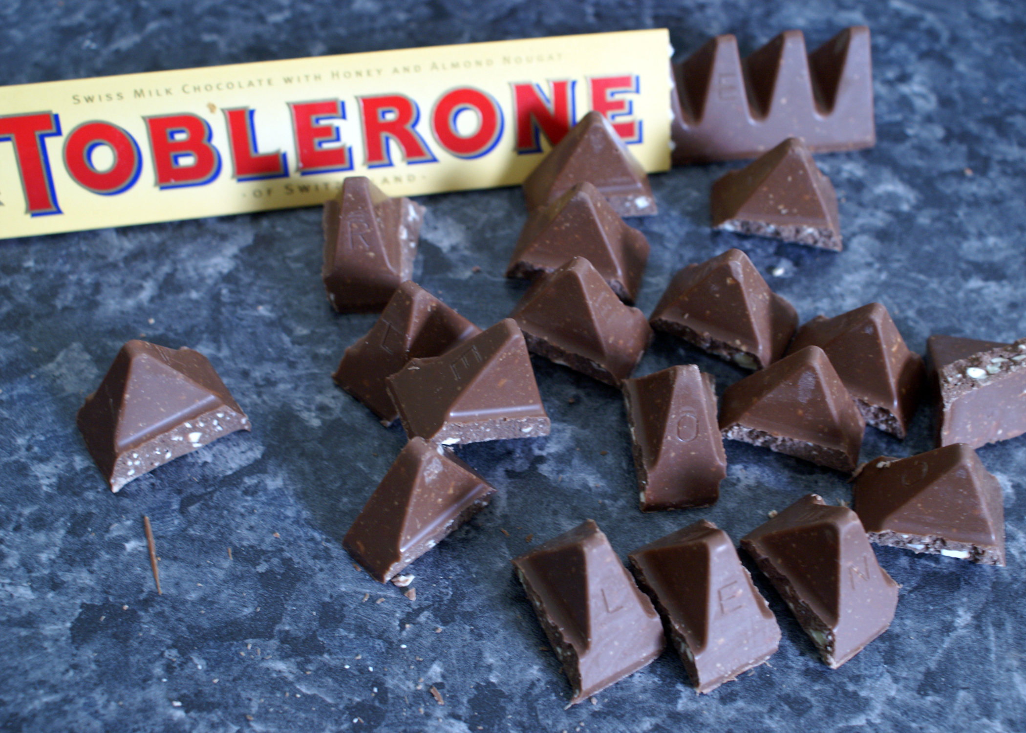 Den Backofen als erstes auf 180°C vorheizen. Die Papierförmchen in das Muffinblech geben. Die Toblerone in Dreiecke brechen. 12 davon auf die Seite legen.