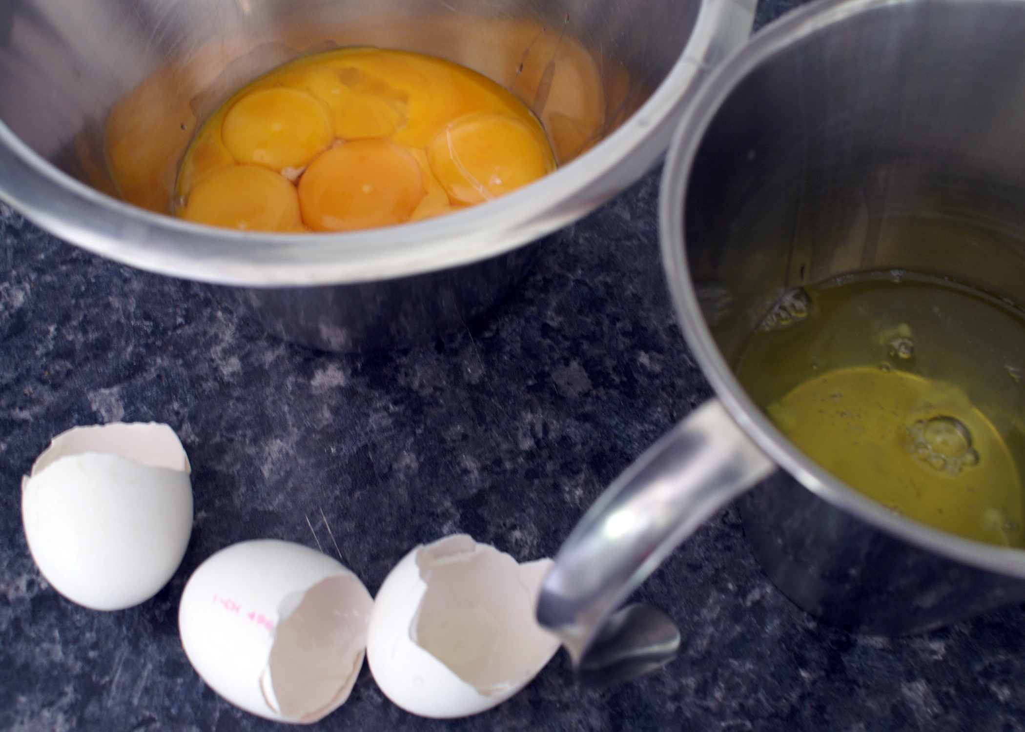 Das Eigelb vom Eiweiss trennen. Das Zucker mit dem Eigelb schaumig rühren. Danach die Schokolade-Butter-Masse dazugeben.