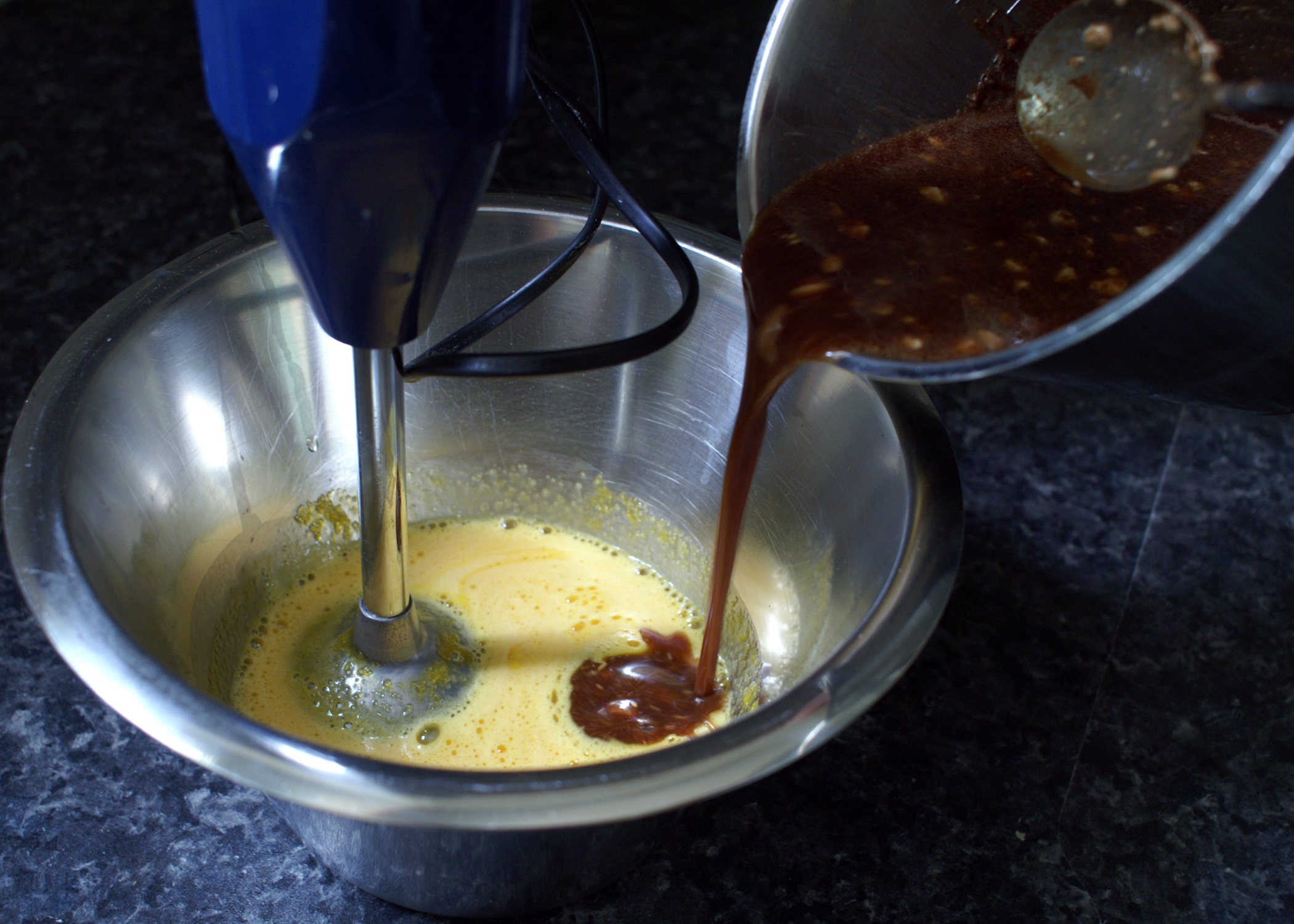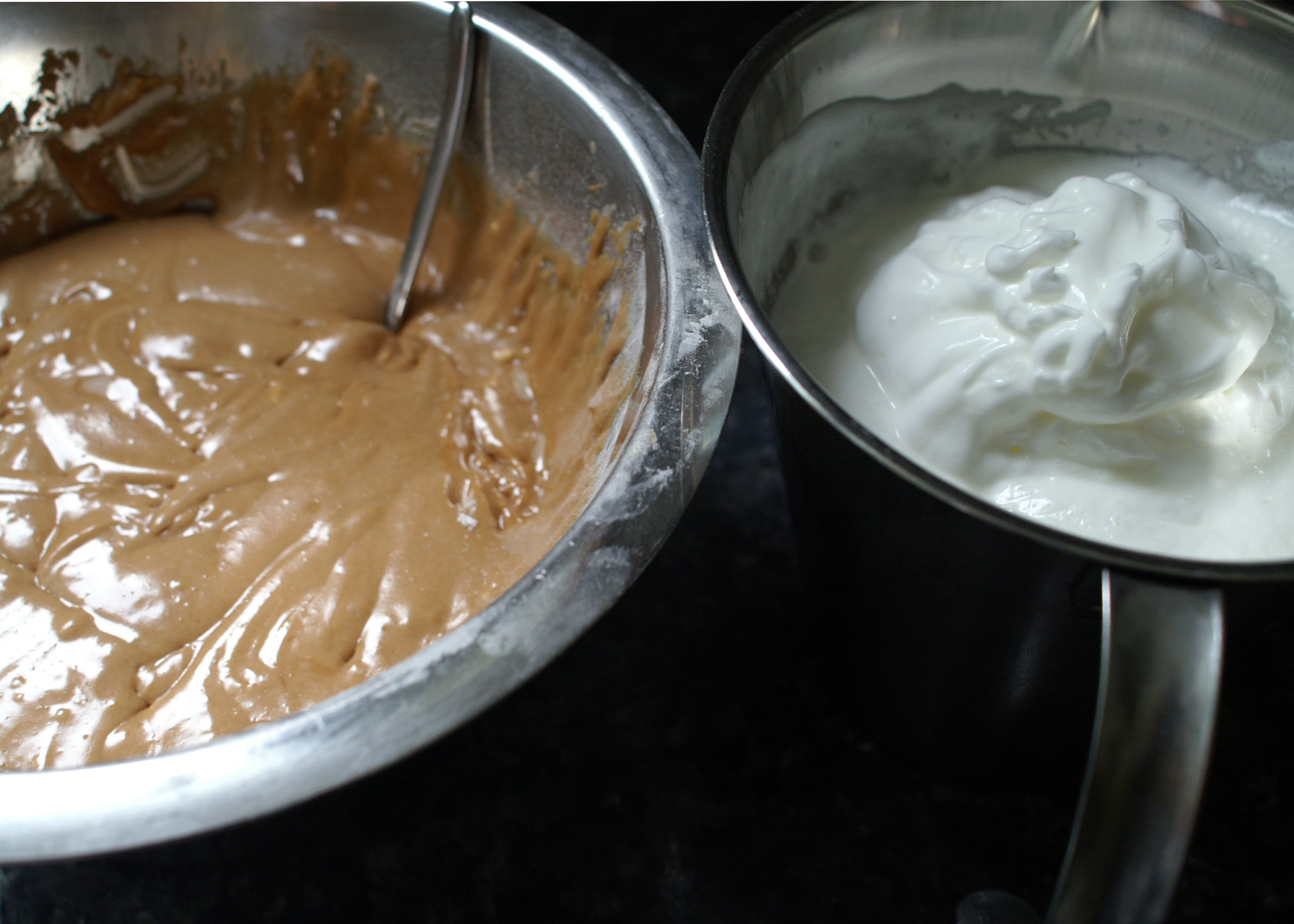 Das Eiweiss steif schlagen. Danach vorsichtig unter die Schokoladenmasse rühren.