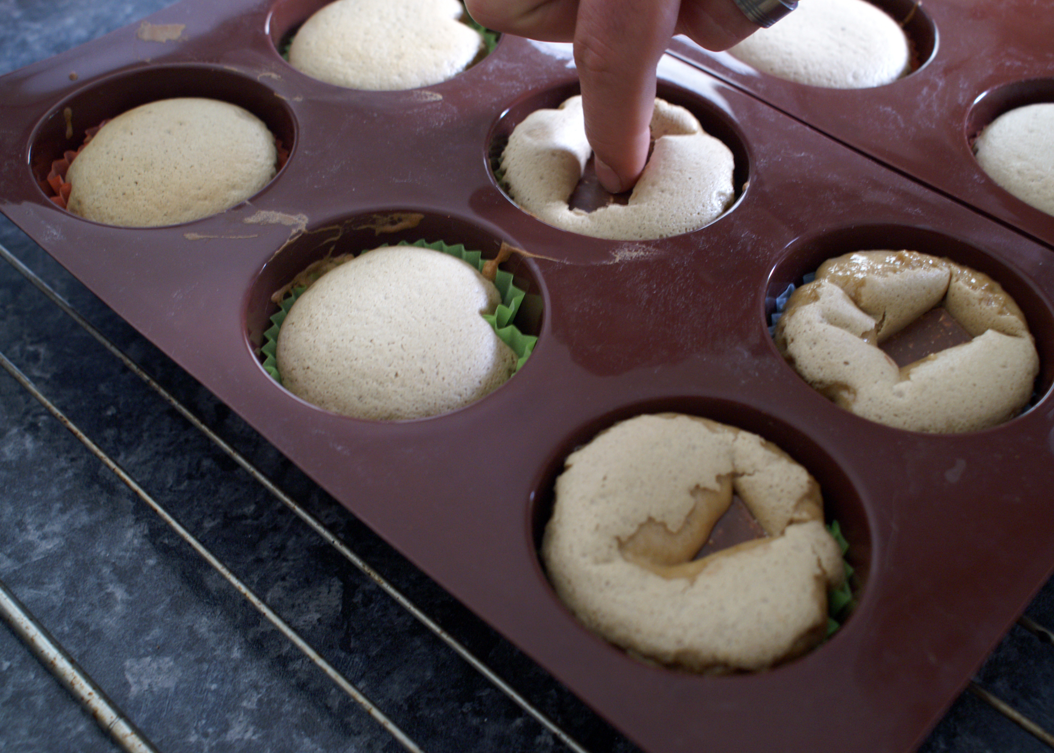 Nach 8 Minuten das heisse Muffinblech mit Topfhandschuhen aus dem Ofen nehmen. Jetzt in jedes einzelne Muffin eines der 12 restlichen Tobleronestücke geben. Dabei sollte darauf geachtet werden, dass diese mit dem Teig bedeckt werden. Die Muffins danach für 12 weitere Minuten backen.