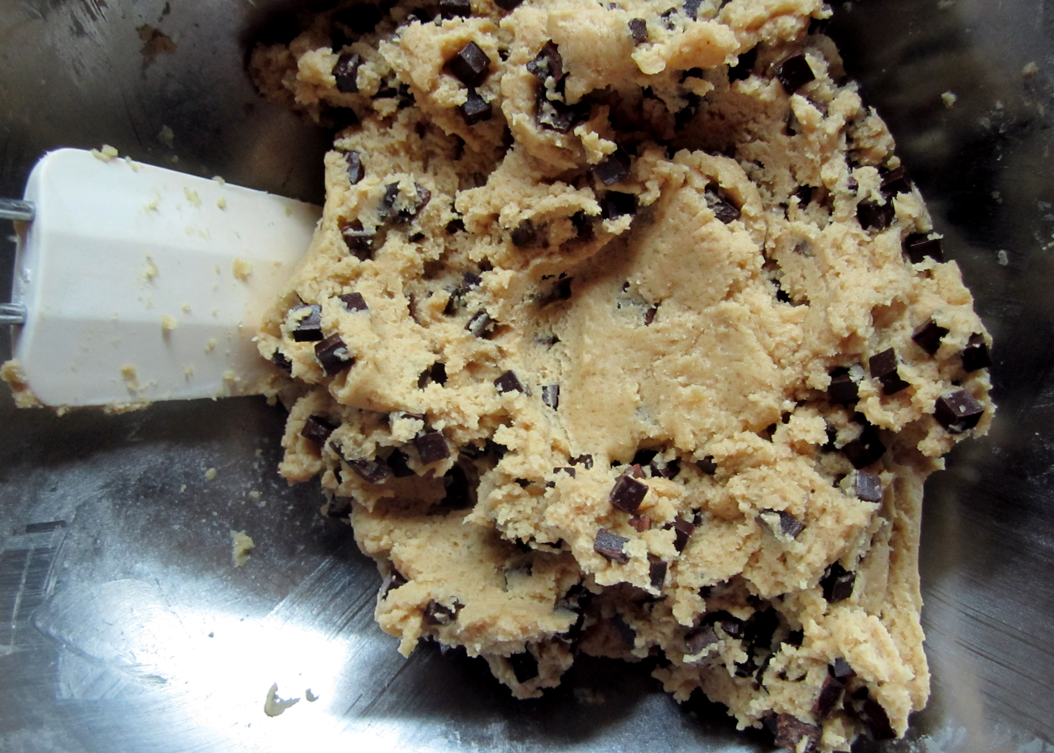 Zum Schluss die Schokoladenwürfelchen von Hand unter den Teig ziehen.