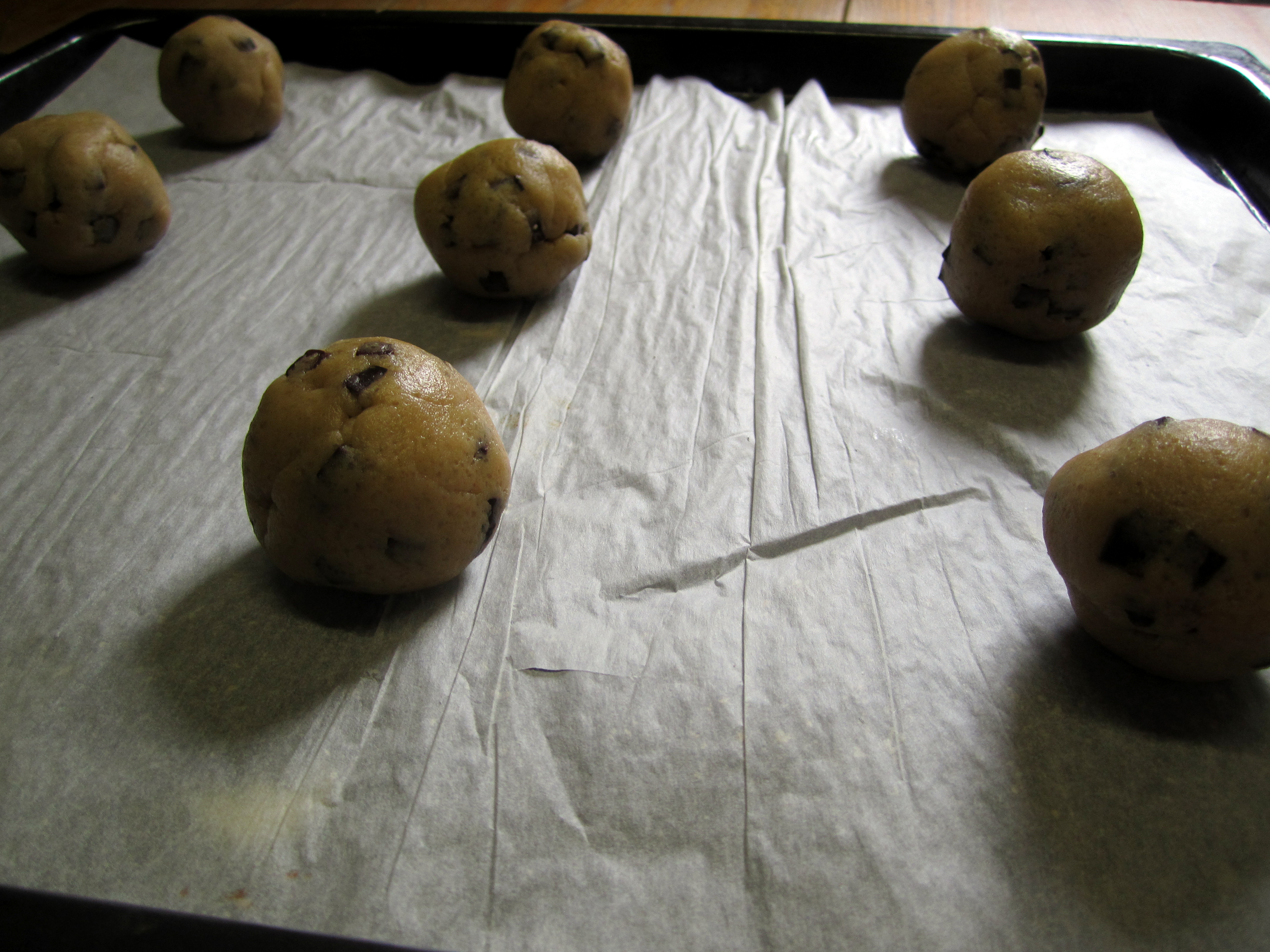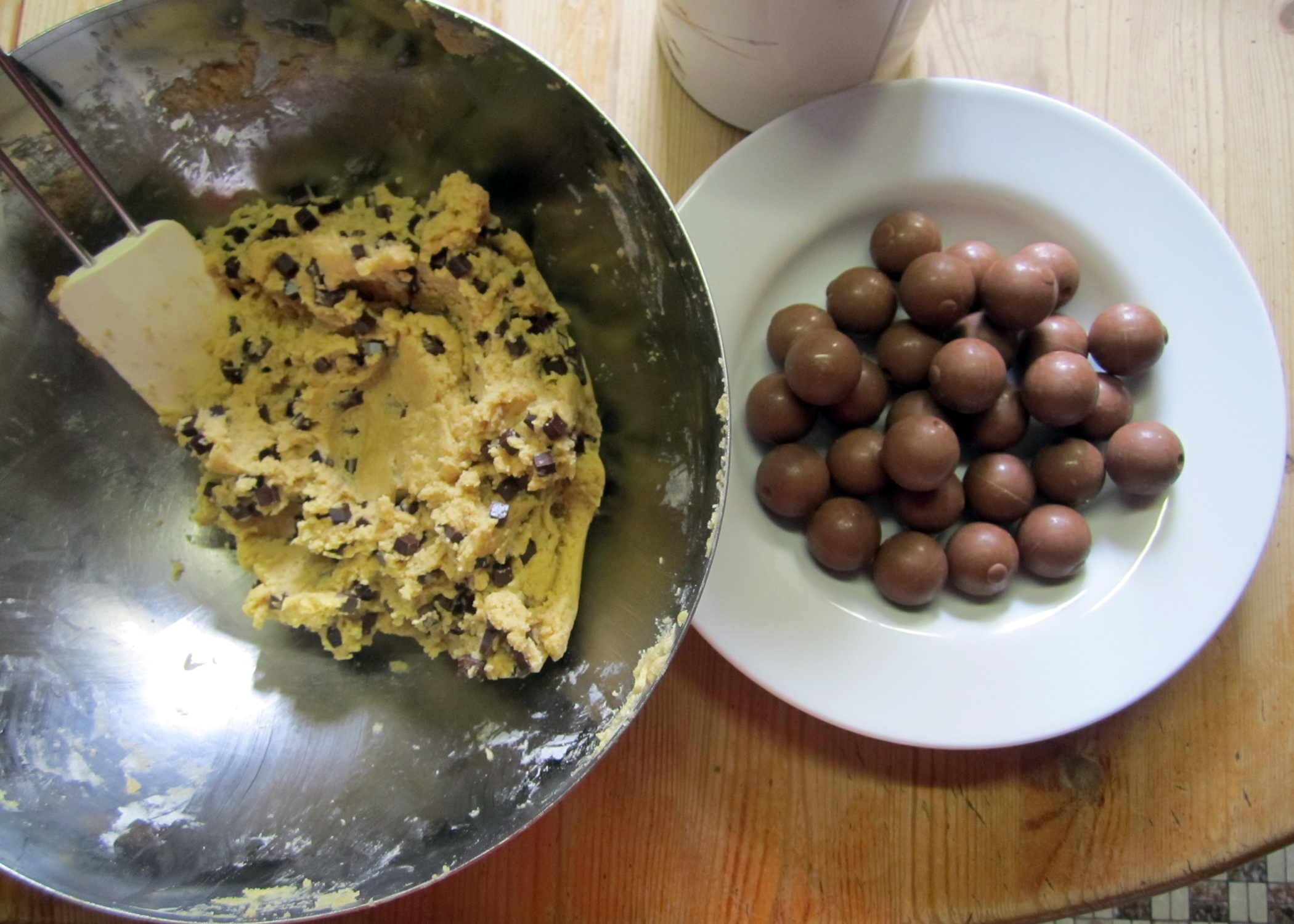 Die fertigen Cookiebälle in grossen Abständen auf das Blech legen (max 9 Cookies pro Blech) und in der Mitte des Ofens 12-15 Minuten backen.