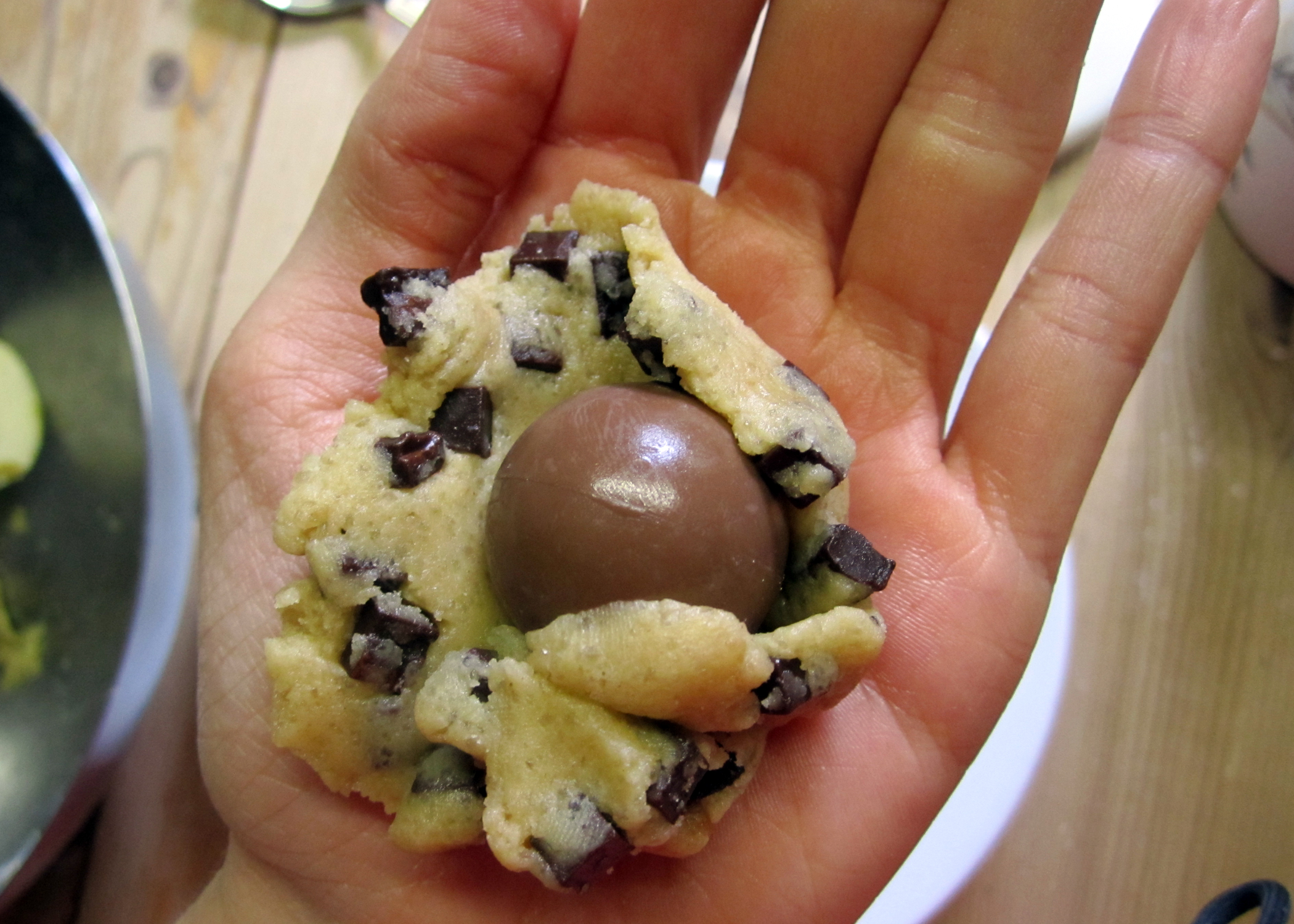 Um die Cookies zu formen, etwas Teig in die Hand nehmen und auf der Handfläche flachdrücken. Anschliessend eine Lindorkugel darauflegen und den Teig rundherum legen. Kurz zwischen beiden Handflächen rollen, sodass ein gleichmässiger Cookieball entsteht. Beim Backen wird dieser etwas zerlaufen und flach werden.