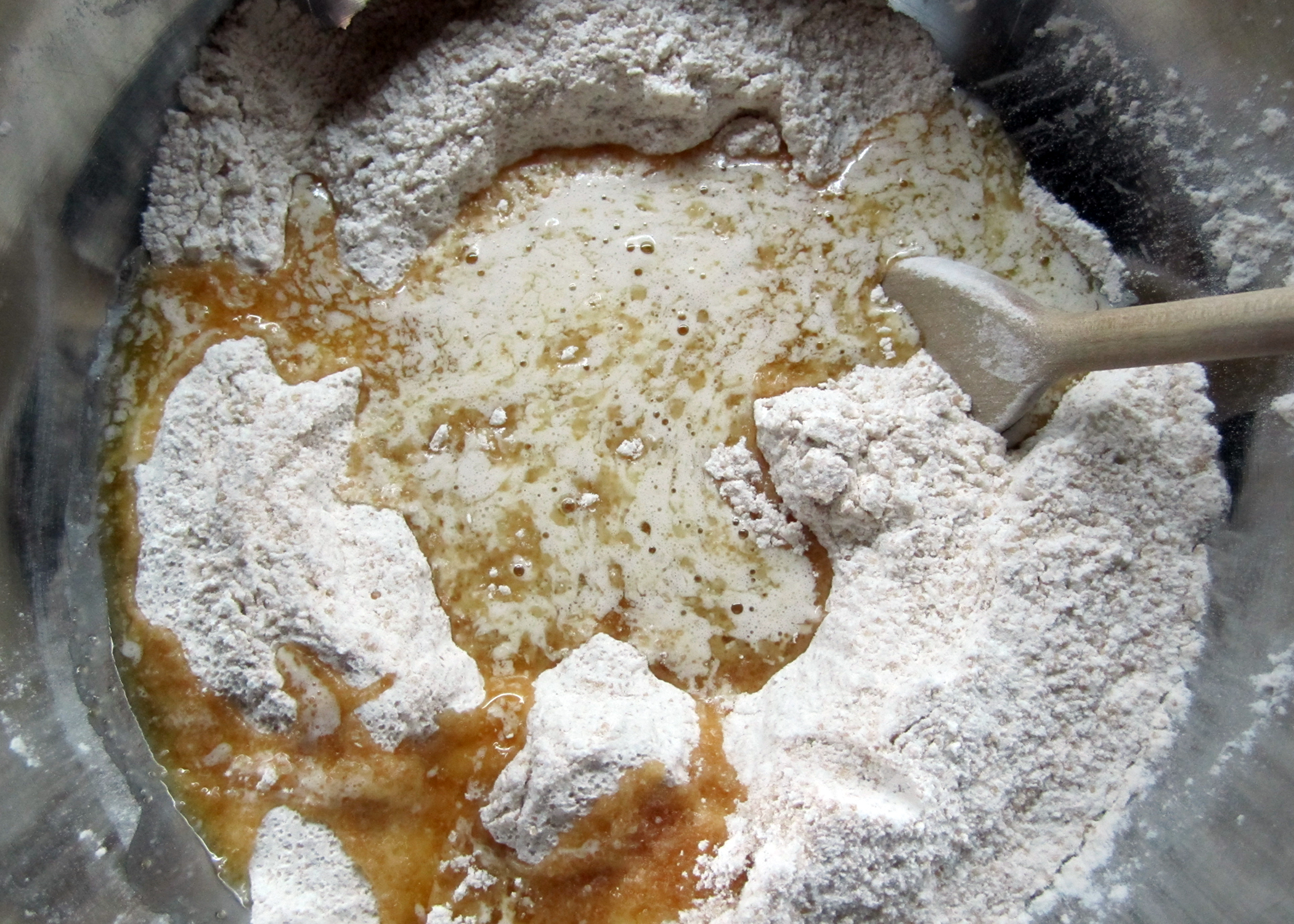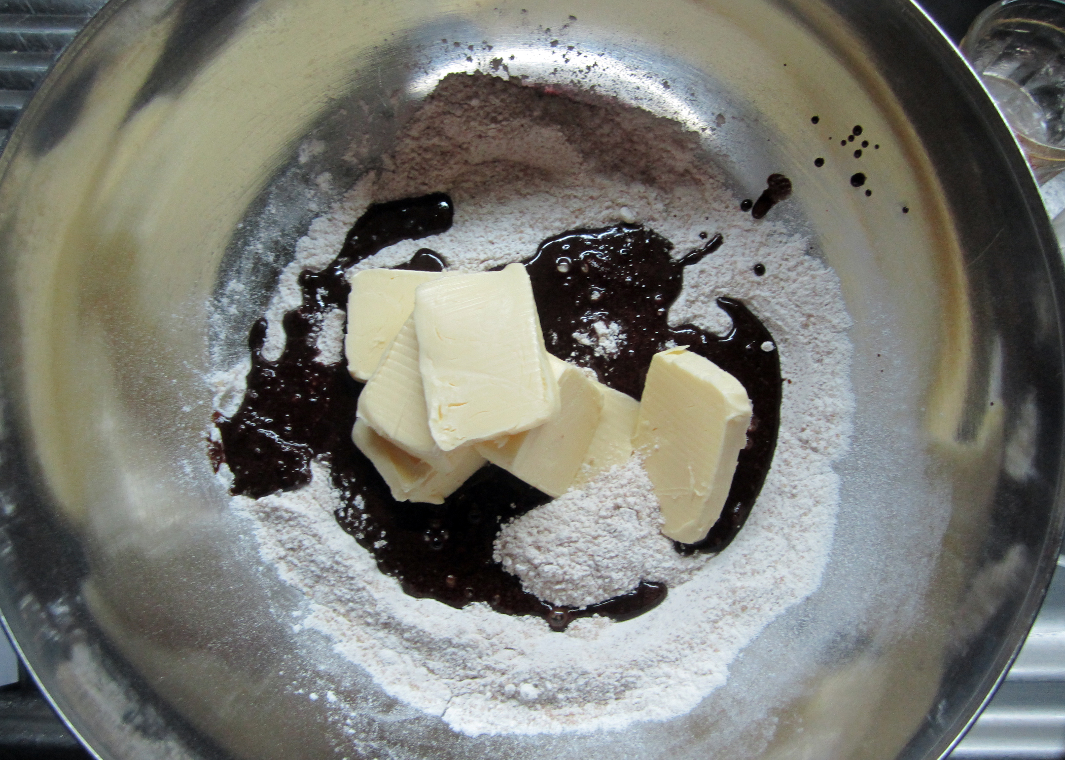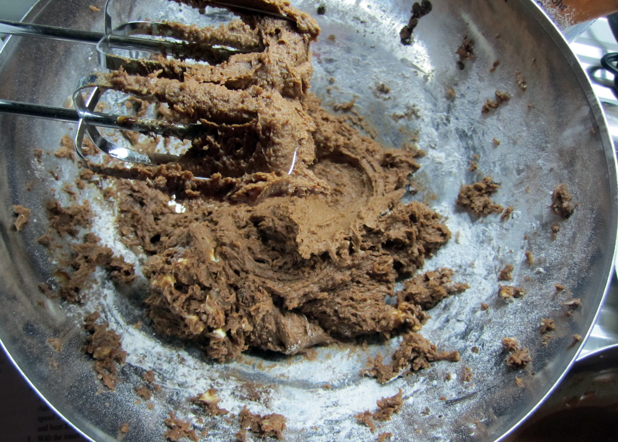 In einer dritten, grossen Schüssel Mehl, brauner Zucker, Natron und Salz vermischen. Die weiche Butter und die restliche Schokoladenmischung dazugeben und solange rühren, bis alles gut vermischt ist.