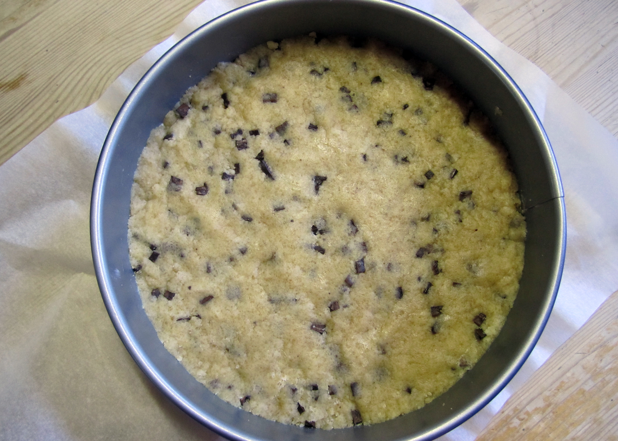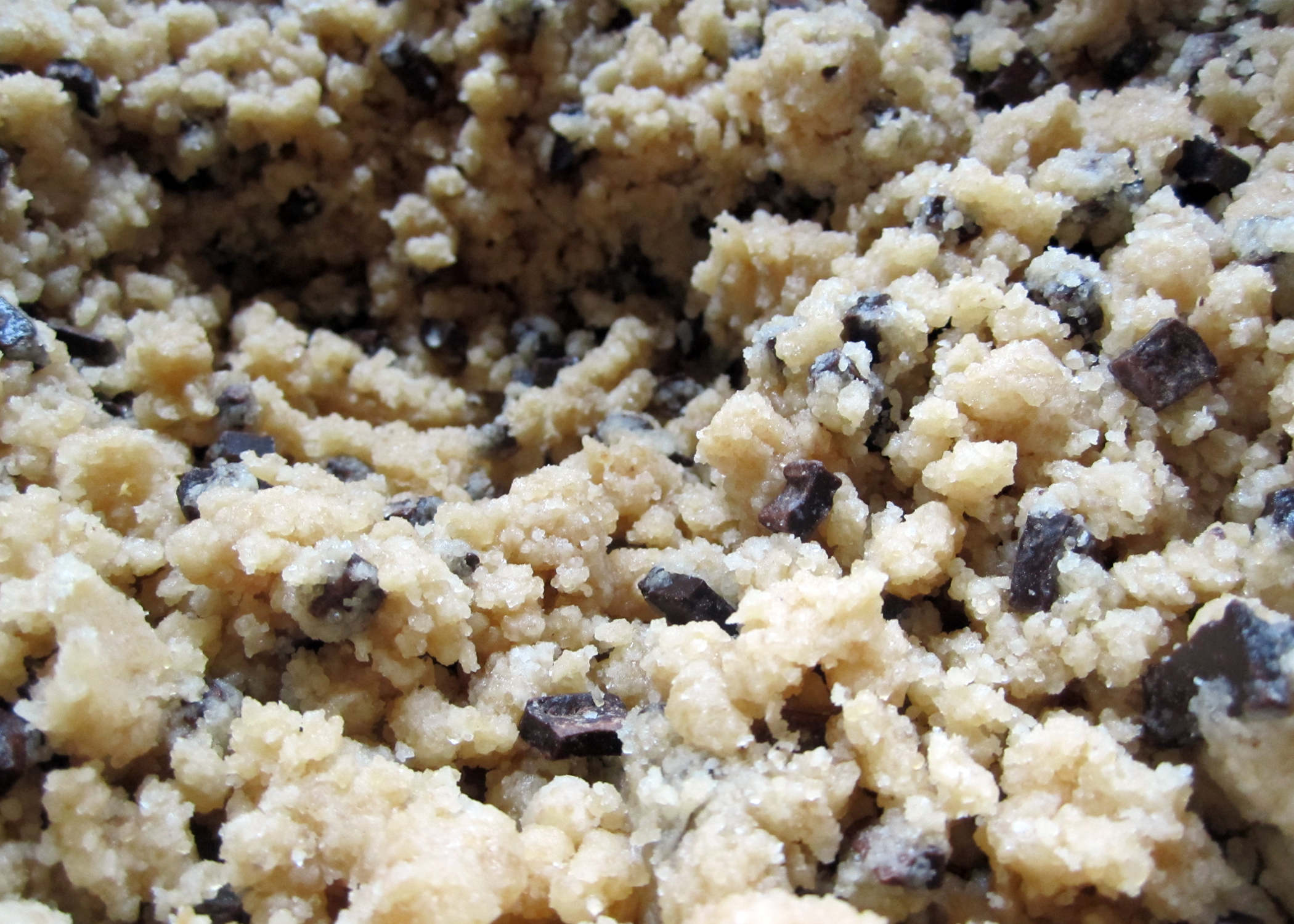 Für die Cookiedough-Schicht ein letztes mal eine Springform (ø24cm) einfetten. Bemehlen ist hier nicht zwingend nötig. Mehl, Salz, brauner und weisser Zucker in einer grossen Schüssel vermischen. Vanilleextrakt und geschmolzene Butter dazugeben und verrühren. Es soll ein trockener Teig entstehen. Nun die Schokoladenwürfelchen mit den Teigbröseln vermischen und nach und nach die Milch unterrühren.