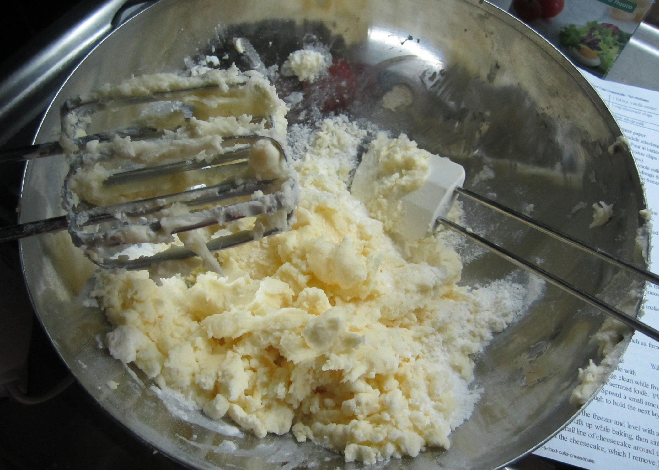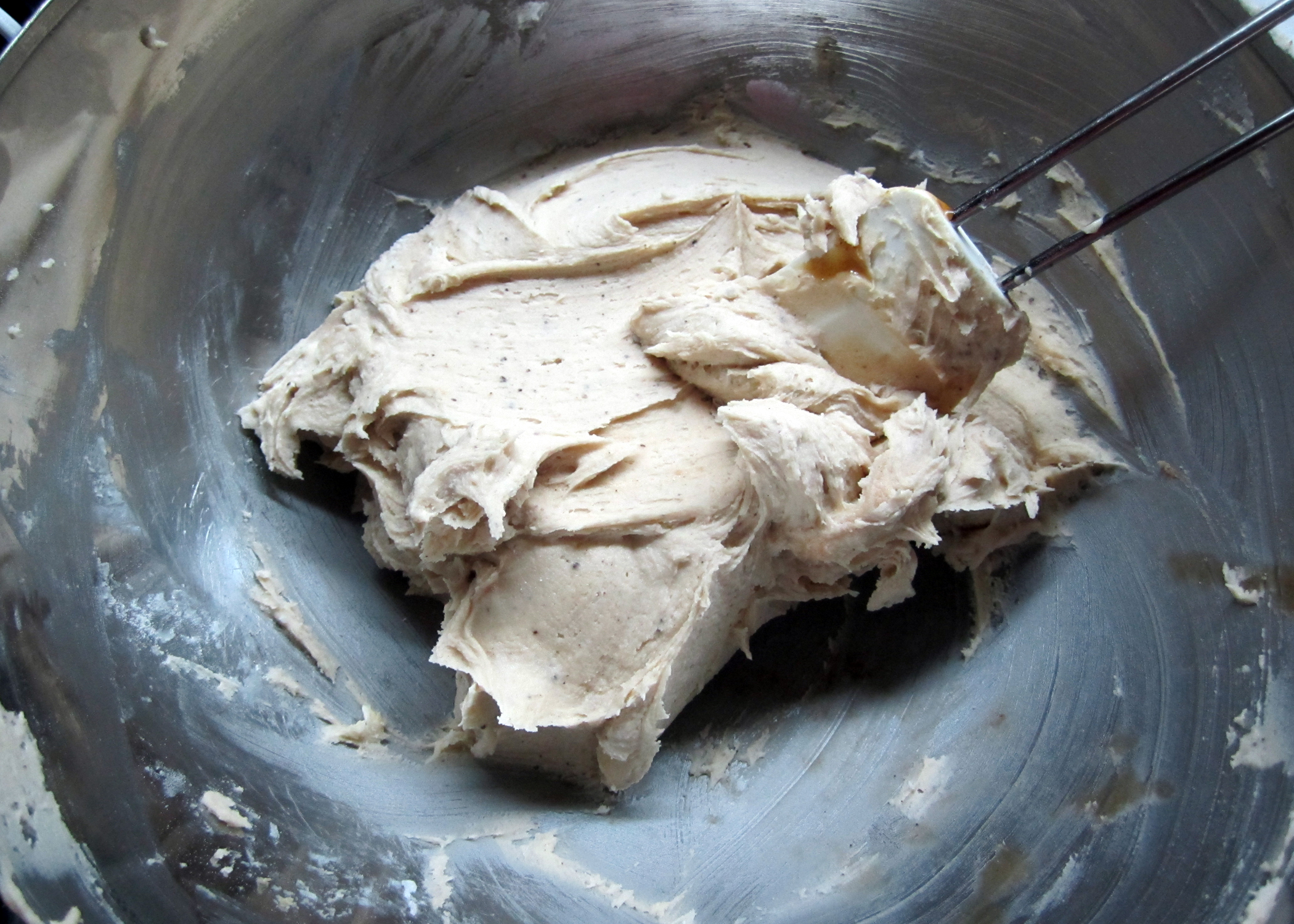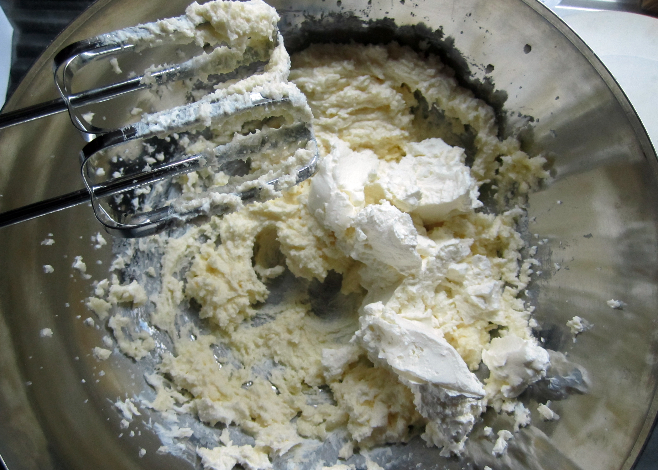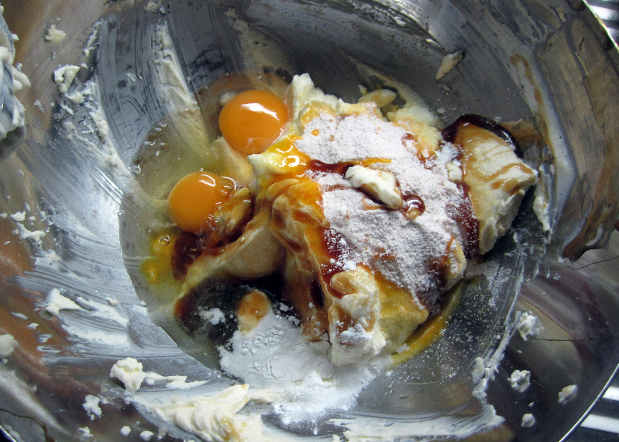 Frischkäse dazurühren bis keine Klümpchen mehr zu sehen sind. Eier, Vanillepuddingpulver, Melasse, Vanilleextrakt und Backpulver daruntermischen.