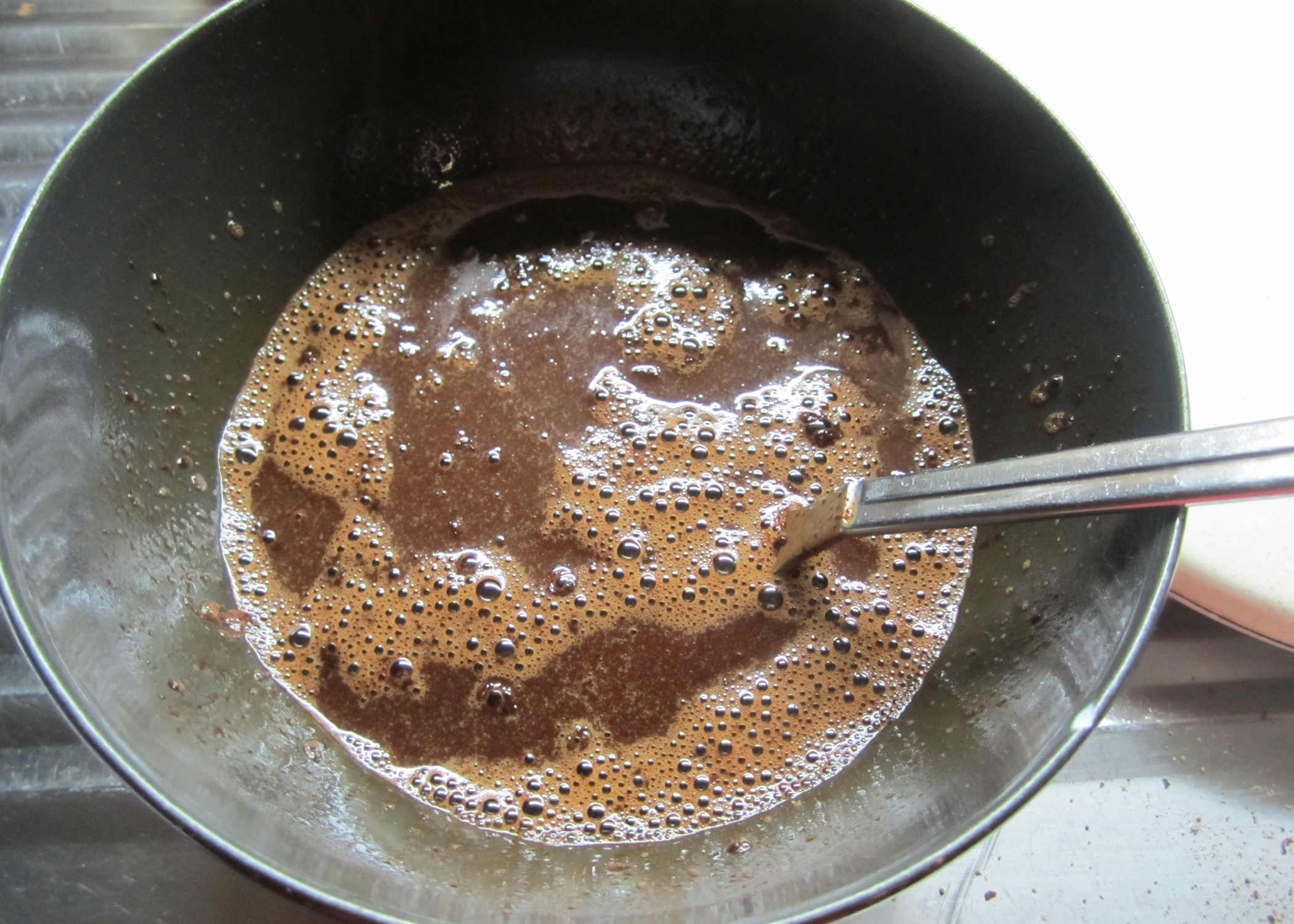Die Schokolade hacken und zusammen mit dem Schokoladenpulver und dem heissen Kaffee in einer kleinen Schüssel verrühren, bis die Schokolade geschmolzen ist.