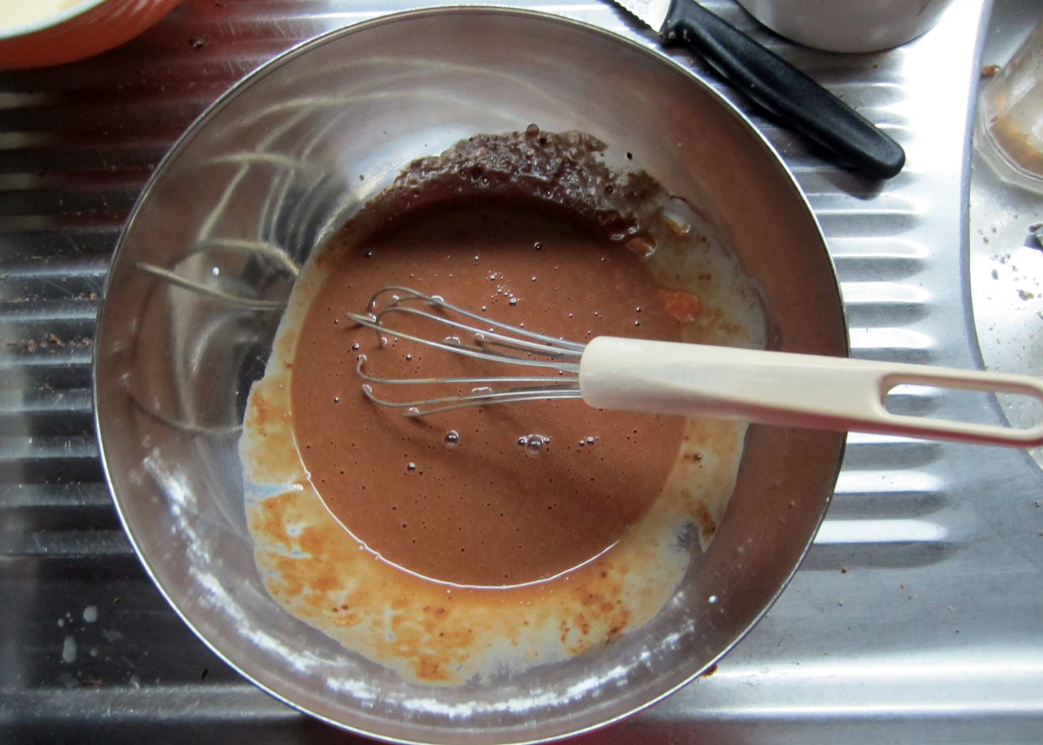 In einer anderen Schüssel Eigelb, Ei, Sauerrahm, Vanilleextrakt und die Hälfte der Schokoladenmischung mit einem Schwingbesen gut verrühren.