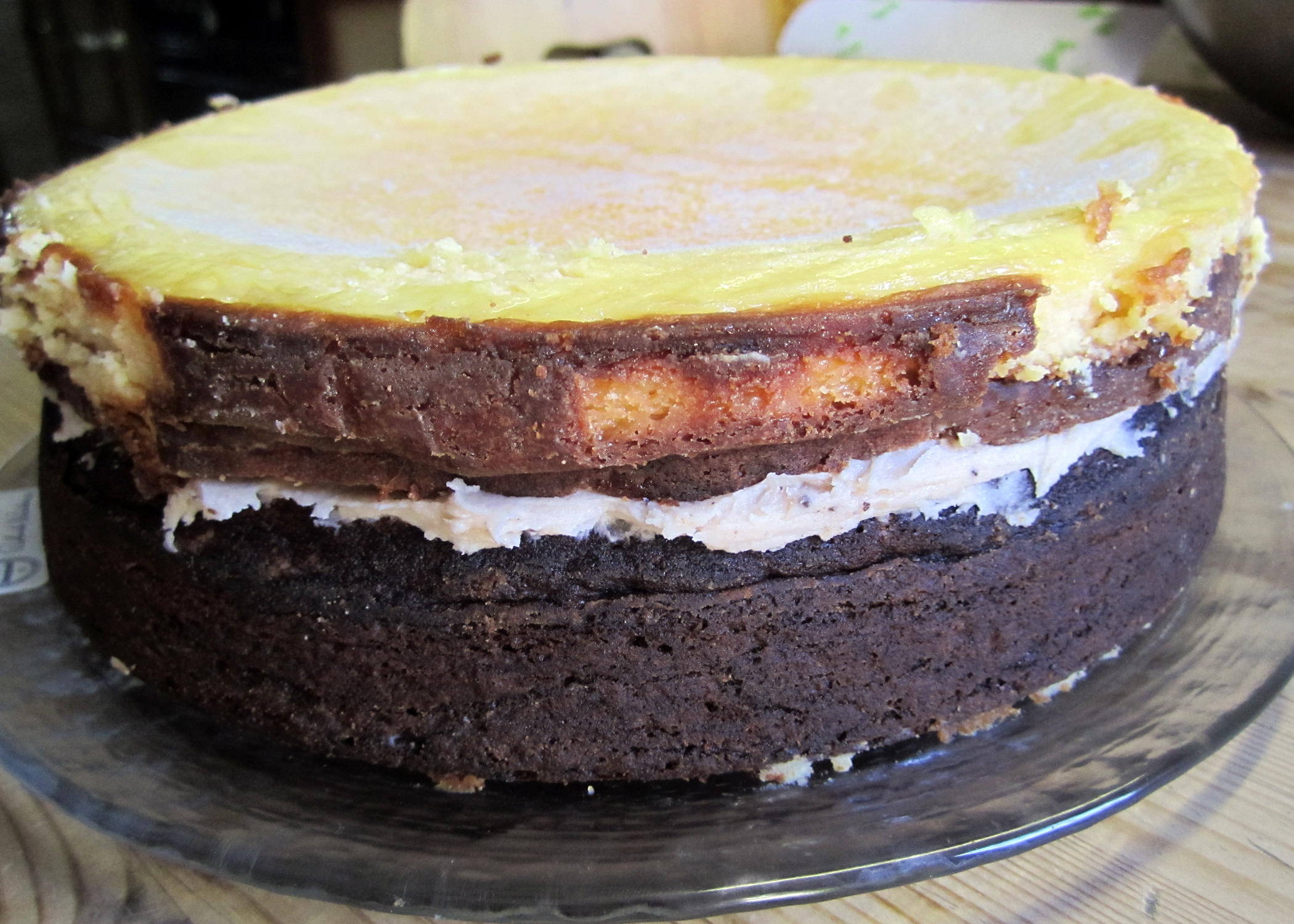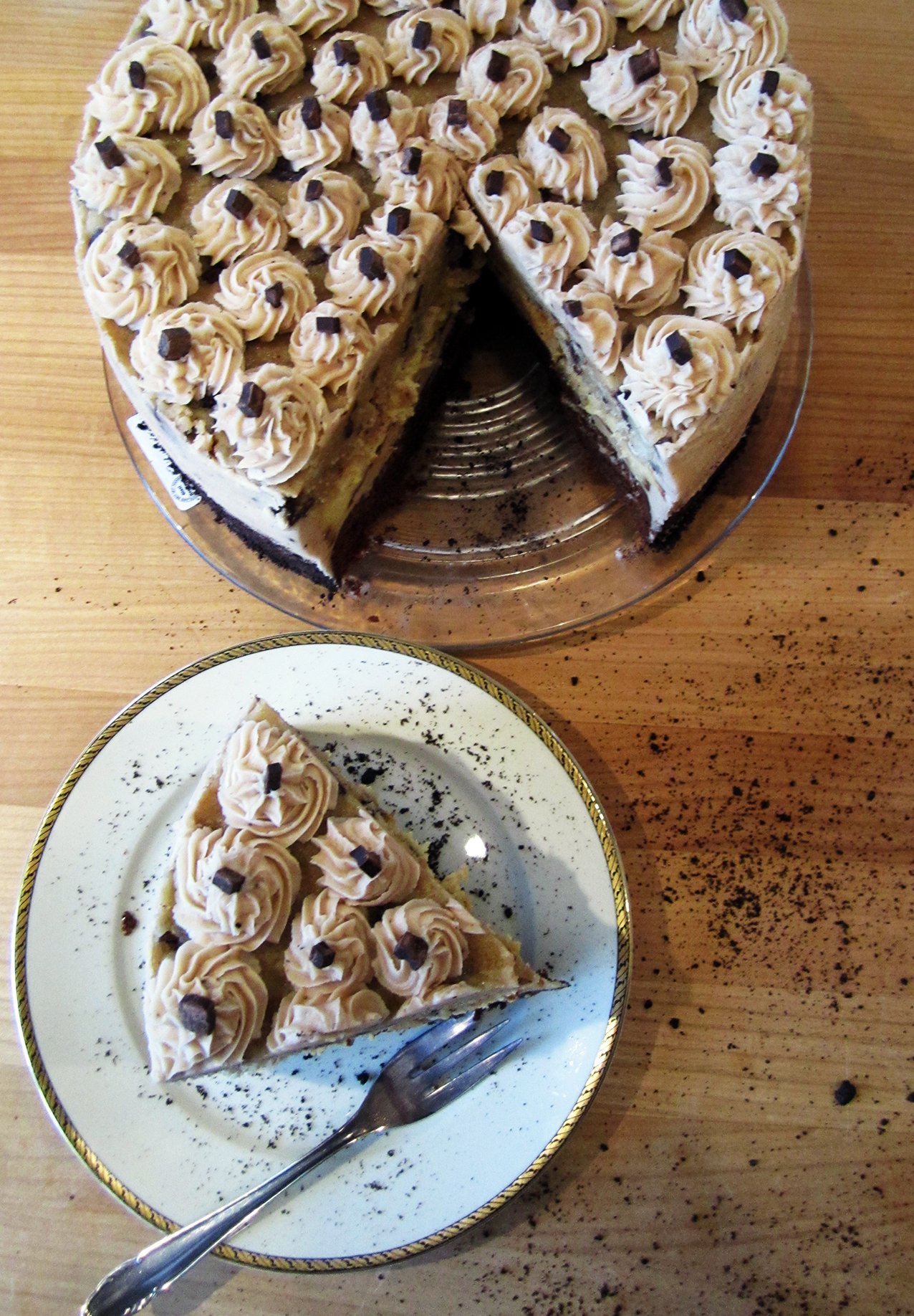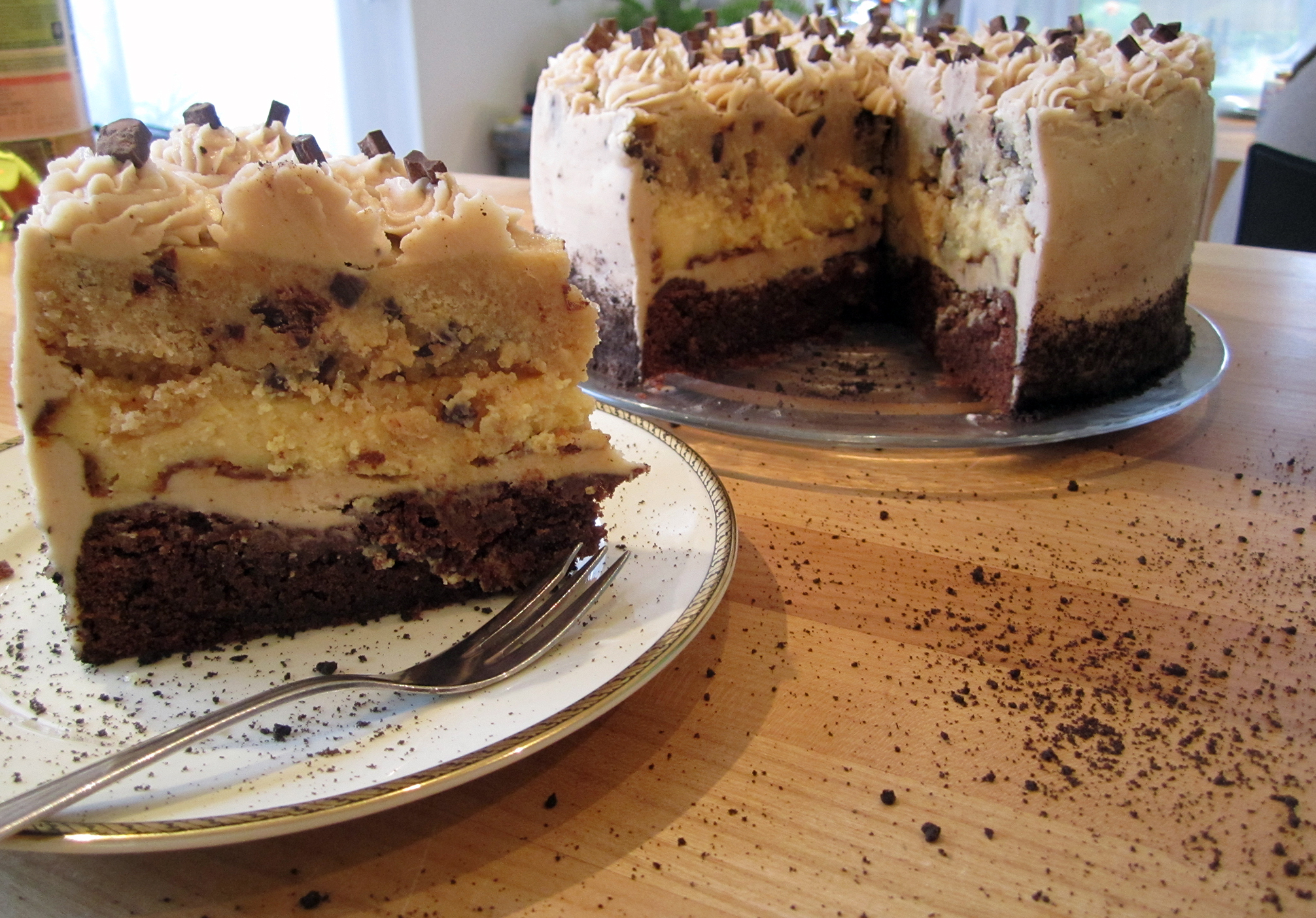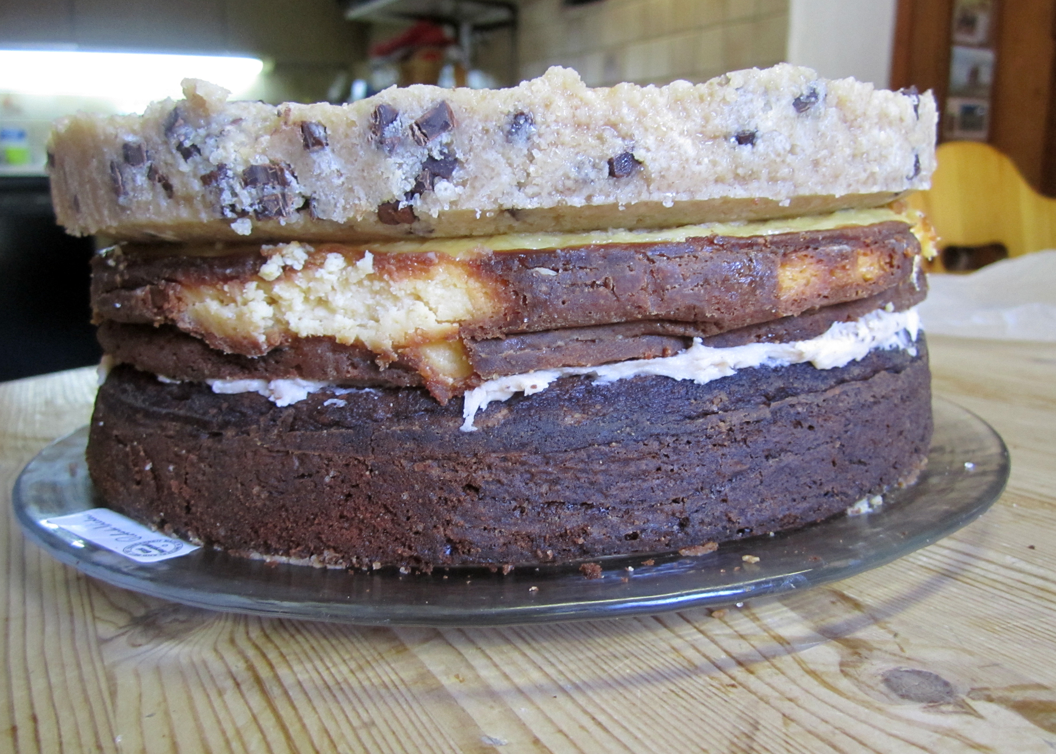 Diese Torte hat für jeden etwas dabei: Schokoladenkuchen, Cheesecake und Cookie alles in einem. Wer ein so grosses Stück wie es auf dem Bild zu sehen ist schafft, wird durch Himmel und Hölle gehen: Himmlischer Genuss und die Qual des überfüllten Magens.