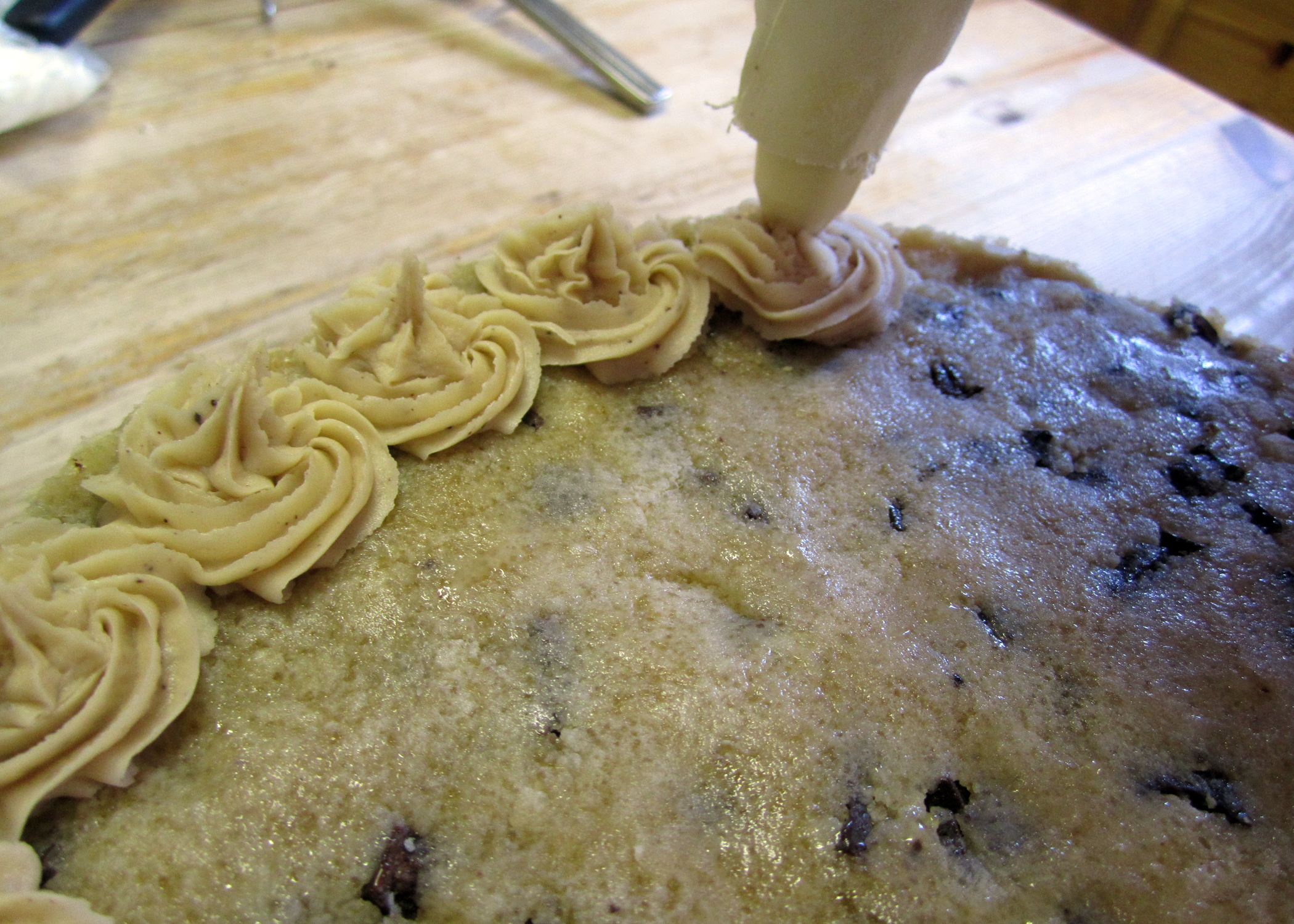 Die restliche Creme in einen Spritzsack füllen und kleine Tuffs auf die Cookiedough-Schicht spritzen. Je ein Schokoladenstückchen auf jedes Tuff setzen.