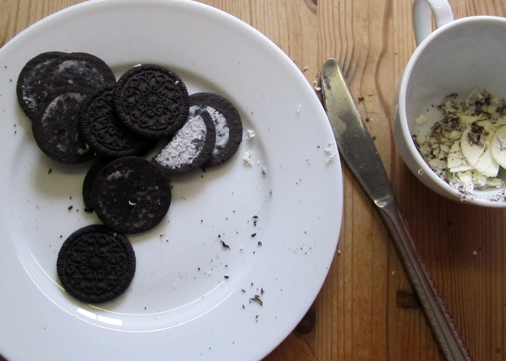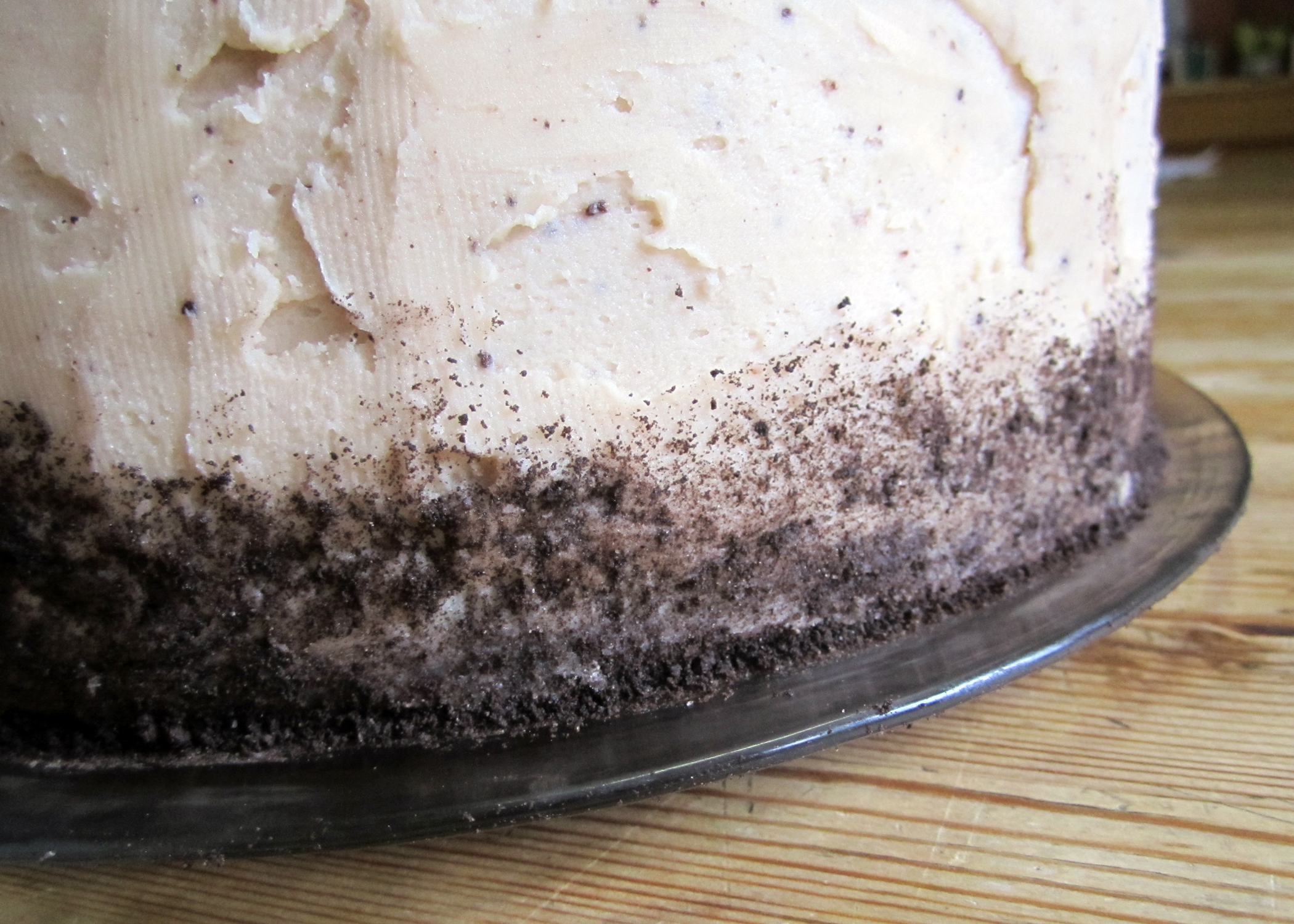 Zum Schluss fünf Oreos auseinandernehmen und die weisse Füllung herauskratzen. Die dunklen Biskuits in einen Gefrierbeutel füllen und mit einem Kartoffelstampfer fein zerstampfen, sodass kleine Brösel entstehen. Diese Brösel rund um das untere Drittel des Kuchens drücken.