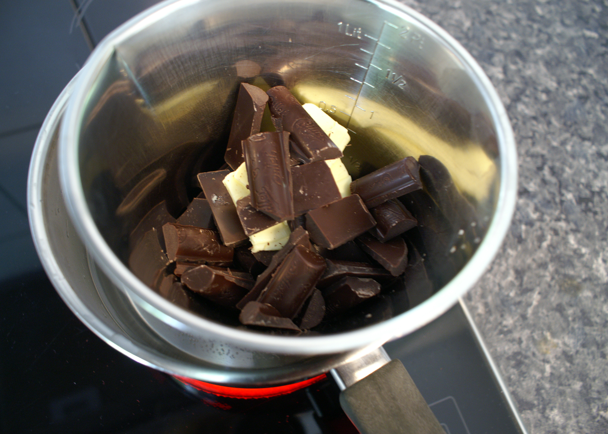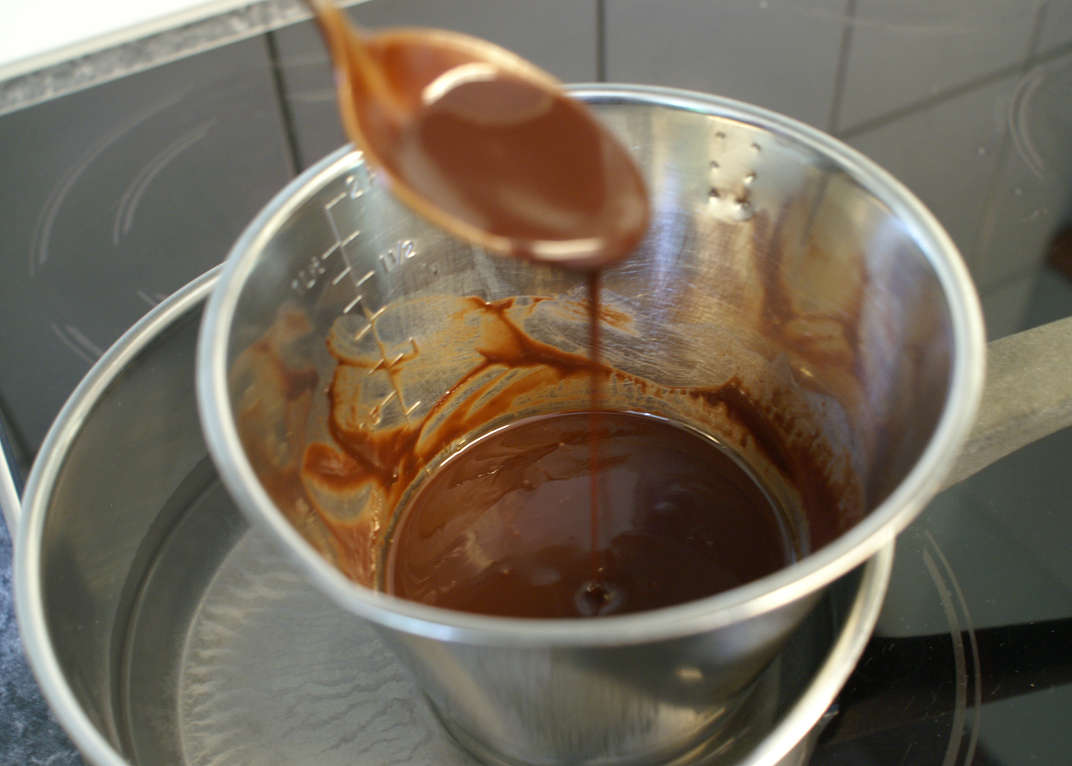 Die Butter und die Schokolade in kleinen Stücken in einem Wasserbad schmelzen und danach leicht auskühlen lassen.