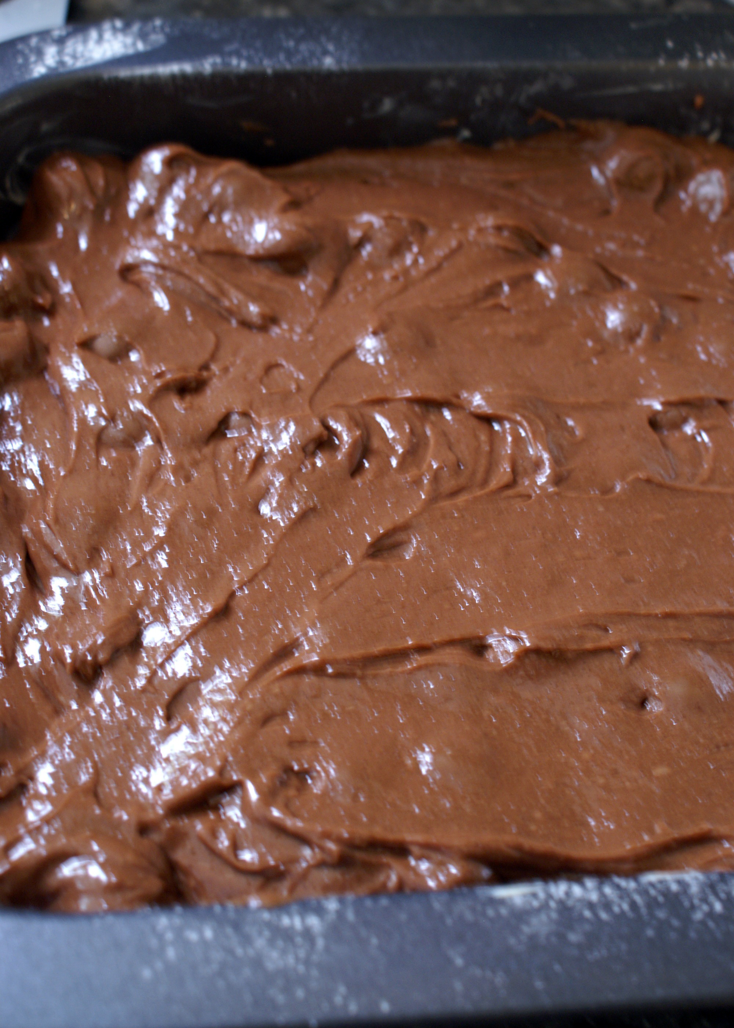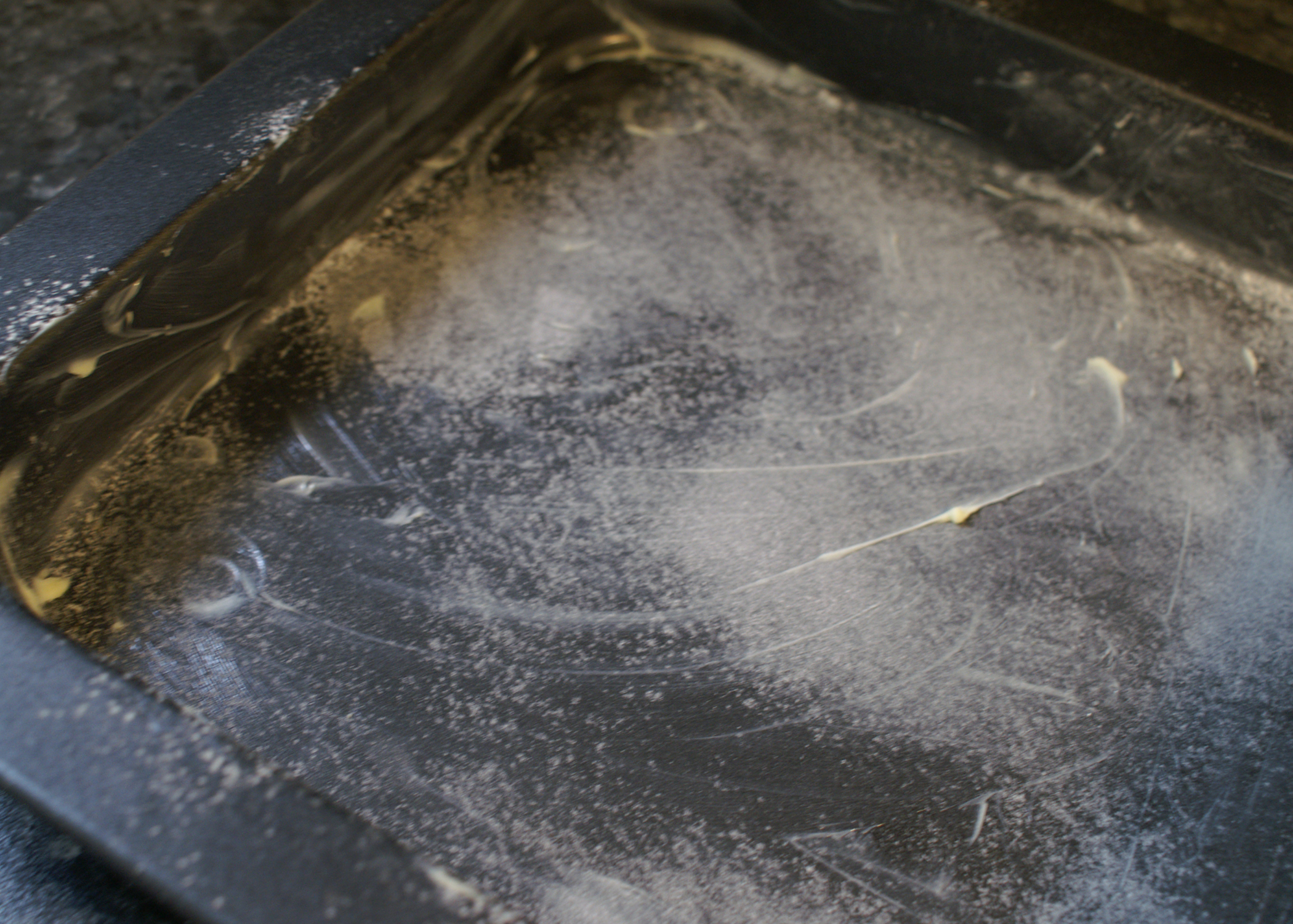 Den Ofen bereits auf 180°C Umluft vorheizen und eine quadratische Form (23cmx23cm) einfetten und bemehlen. Falls keine solche Form vorhanden ist, einfach ein Blech nehmen und mit Alufolie einen passenden Rand abkleben.