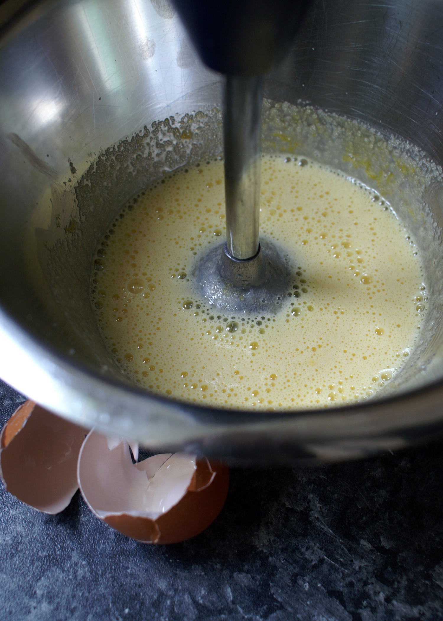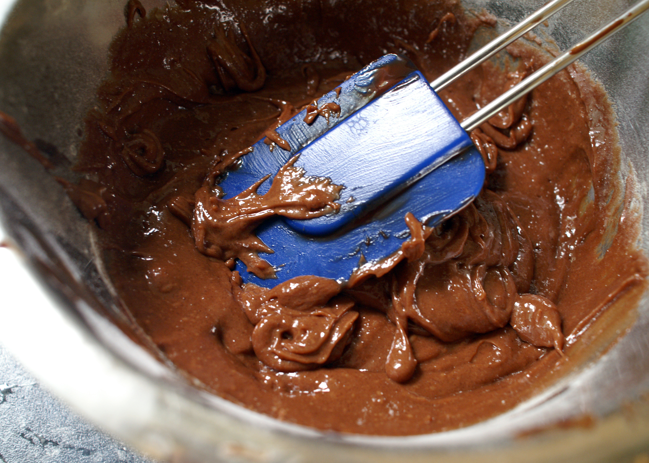 Jetzt das Mehl vorsichtig unterziehen. Die Masse wird dabei ziemlich dickflüssig.