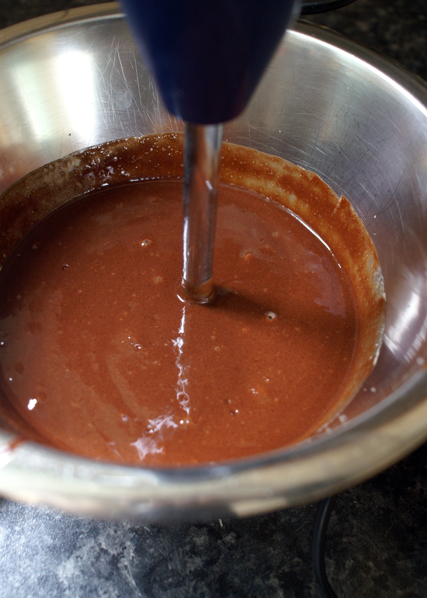 Nun die geschmolzene Schokolade hinzugeben und alles mischen.