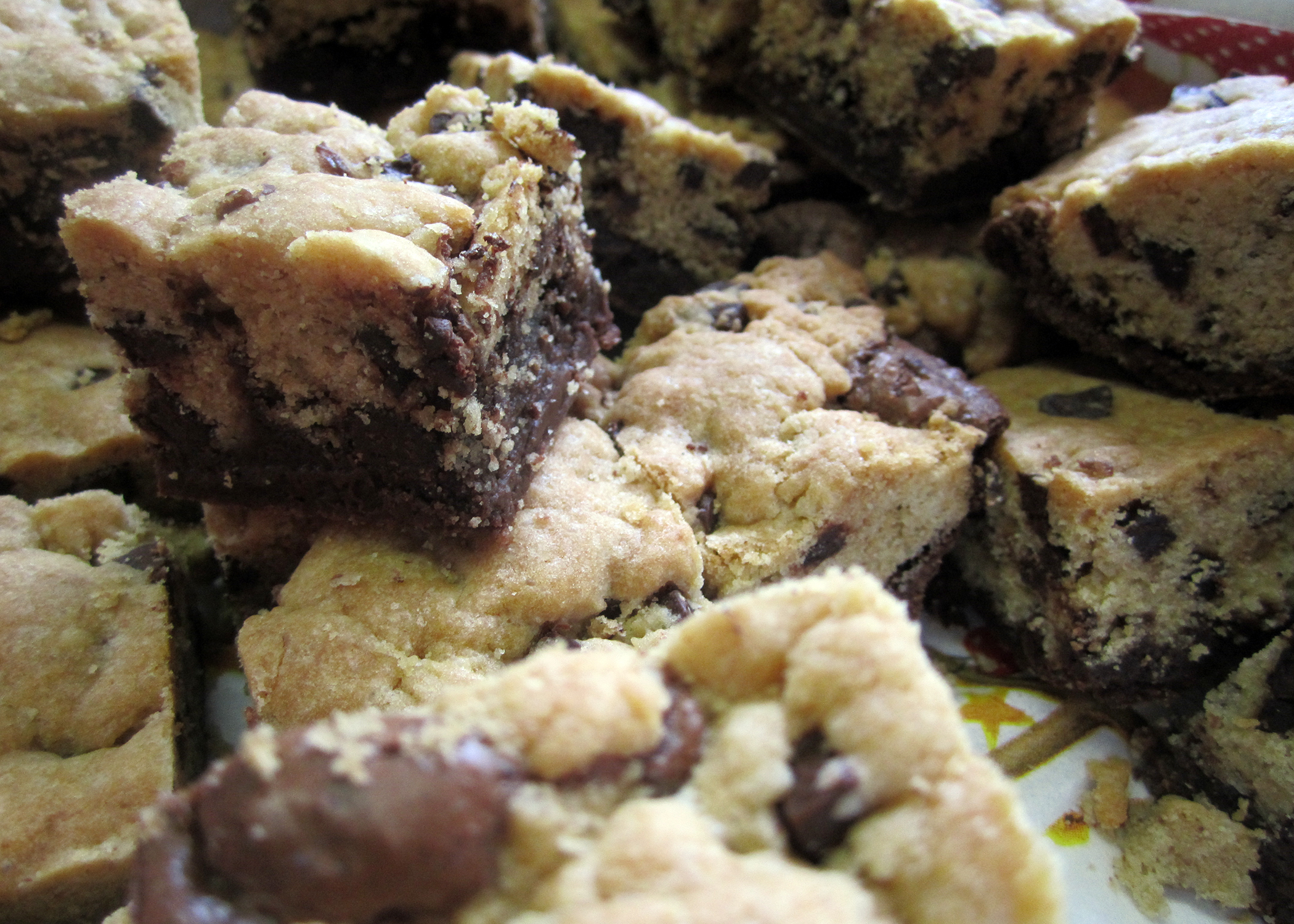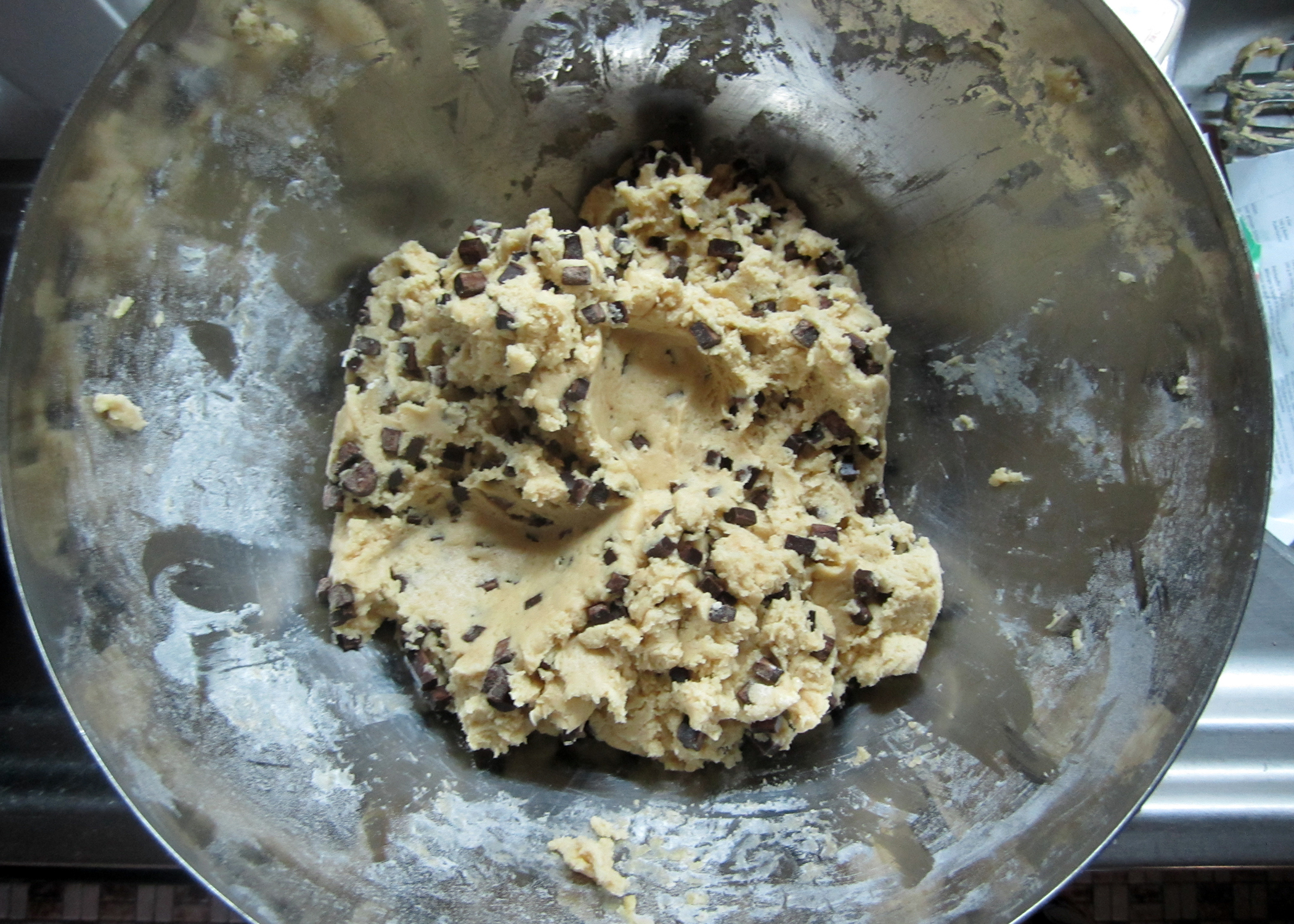 Mehl, Backpulver, Natron und Salz in einer separaten Schüssel vermischen und dann unter die Masse rühren bis die weisse Mehlmischung komplett untergehoben ist. Zum Schluss die Schokoladenwürfelchen von Hand unterrühren und die Schüssel beiseitestellen.