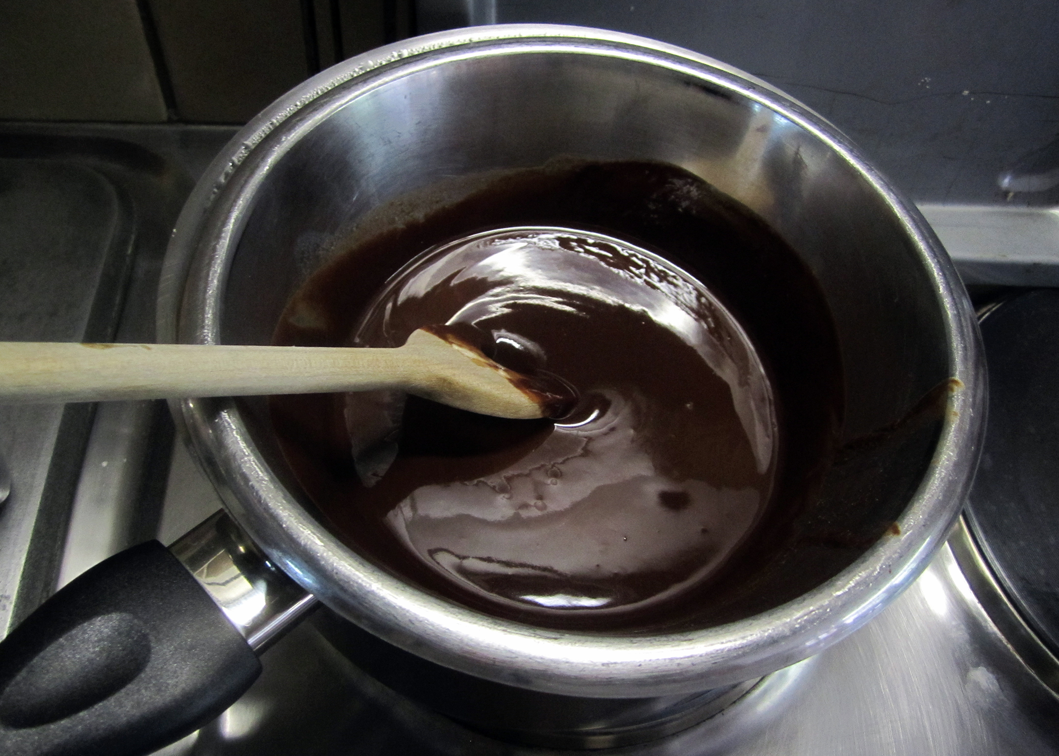 Für den Brownie-Teig Butter und Schokolade im Wasserbad schmelzen und vom Herd ziehen.