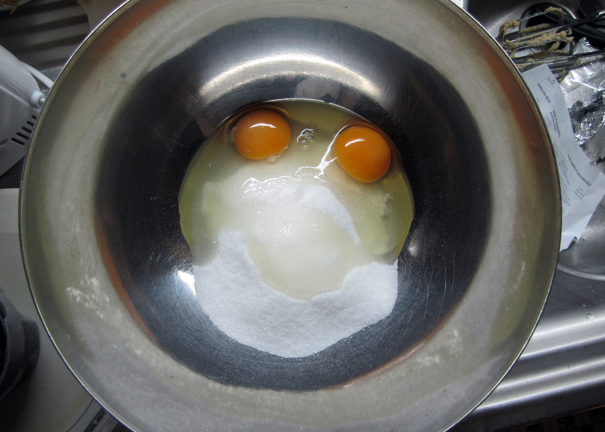 Zucker, Eier und Vanilleextrakt in einer Schüssel verrühren und Schokolade dazugeben.