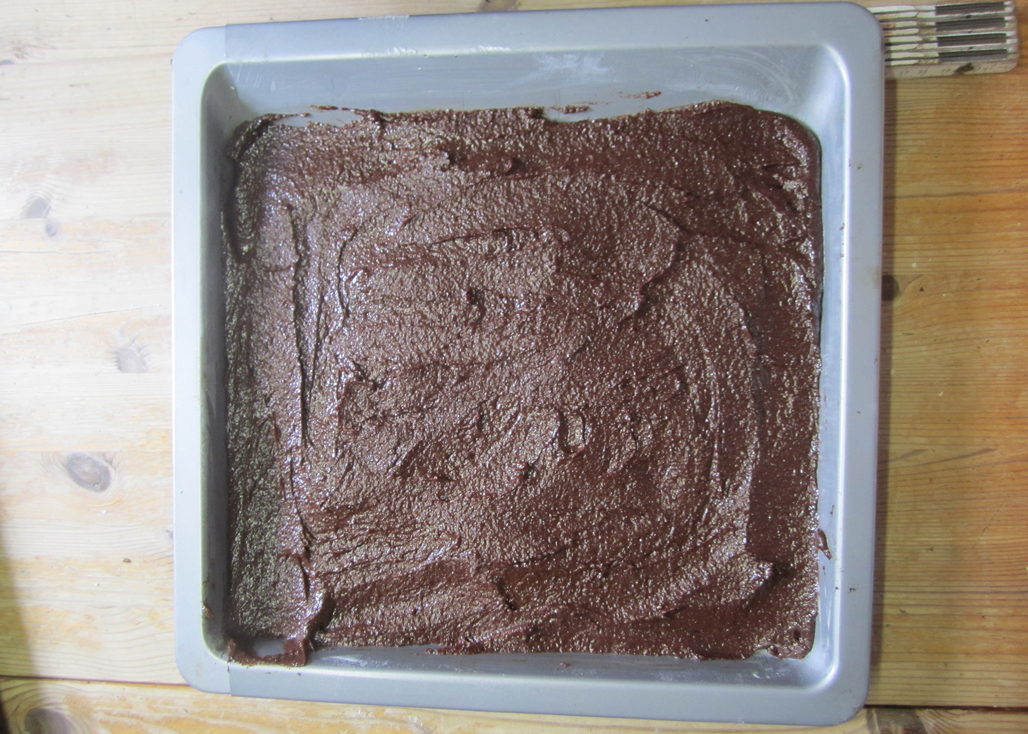 Nun den Brownieteig auf das Blech geben und gleichmässig verteilen.