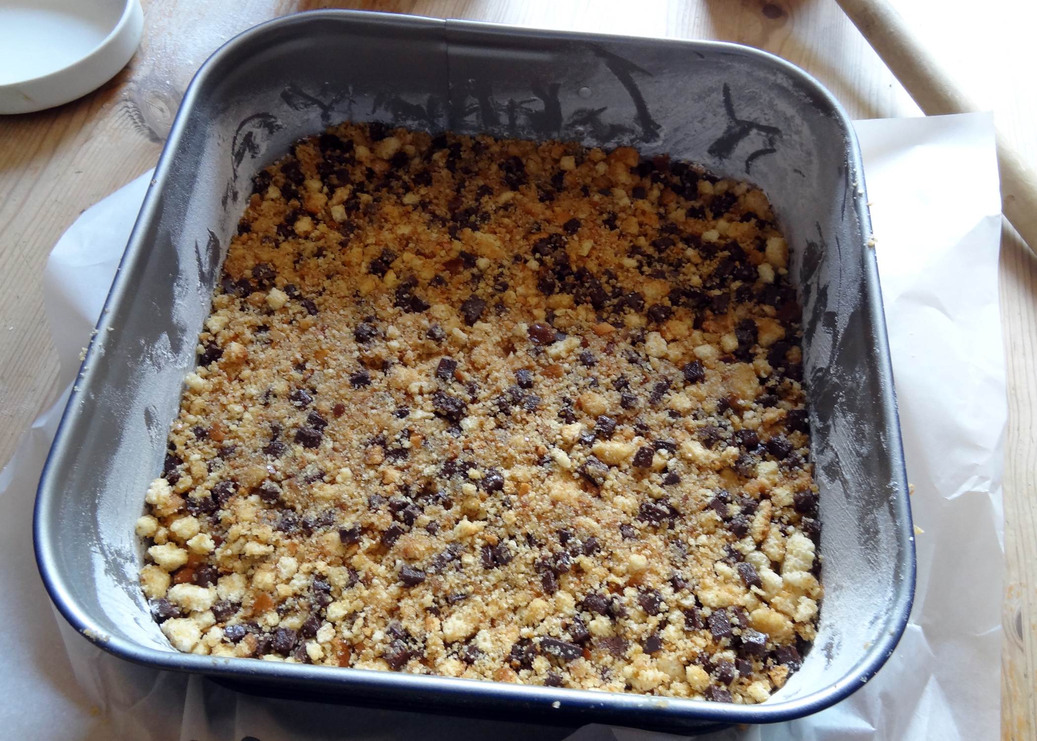 Zum Schluss die Schokolade unterrühren und das ganze in der Form verteilen. SEHR SEHR FEST andrücken und während 6 Minuten im Ofen vorbacken. Danach die Form zum kühlen auf ein Gitter stellen.