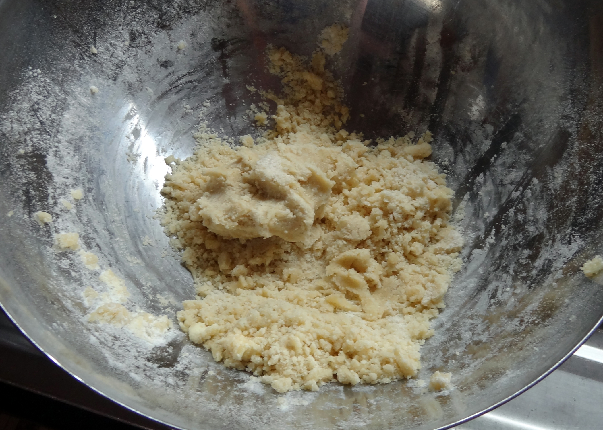 Die Butter dazugiessen und solange umrühren bis eine feuchte Mischung entstanden ist.