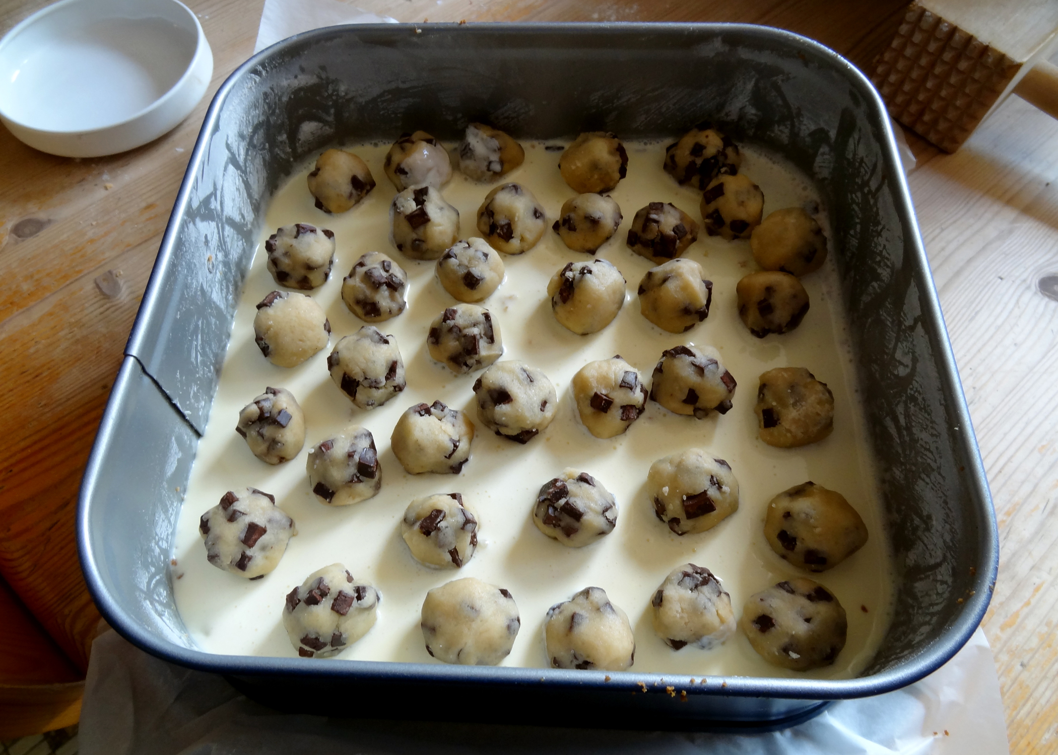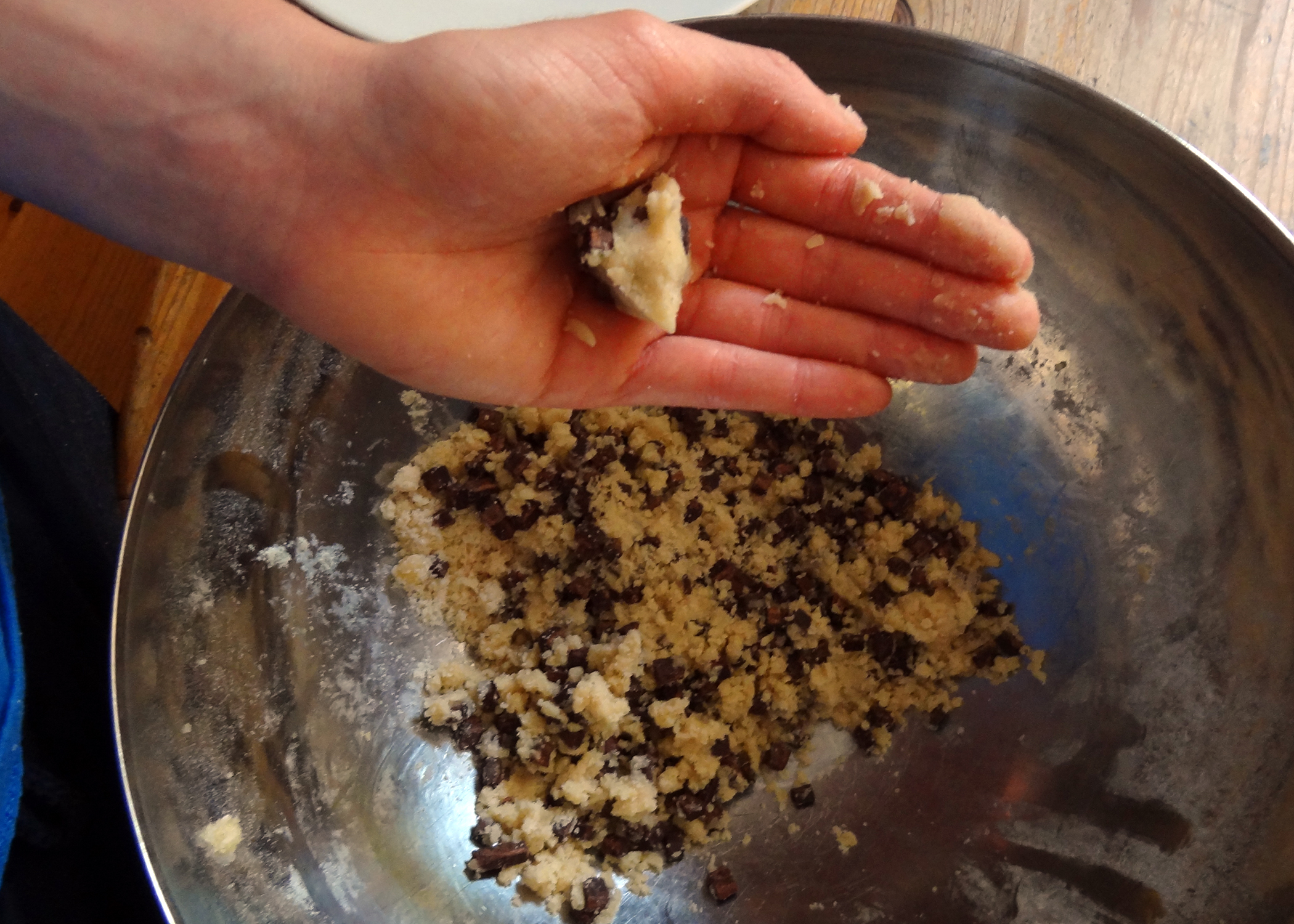 Die Schokoladenwürfel von Hand unterheben. Anschliessend von Hand kleine Klumpen/Kugeln formen.(etwa teelöffelgross) Der Teig ist etwas krümelig, darum gut zusammendrücken, sodass die Kugeln nicht auseinanderfallen. Sobald sämtlicher Teig verarbeitet ist, die Kugeln in den Kühlschrank stellen.