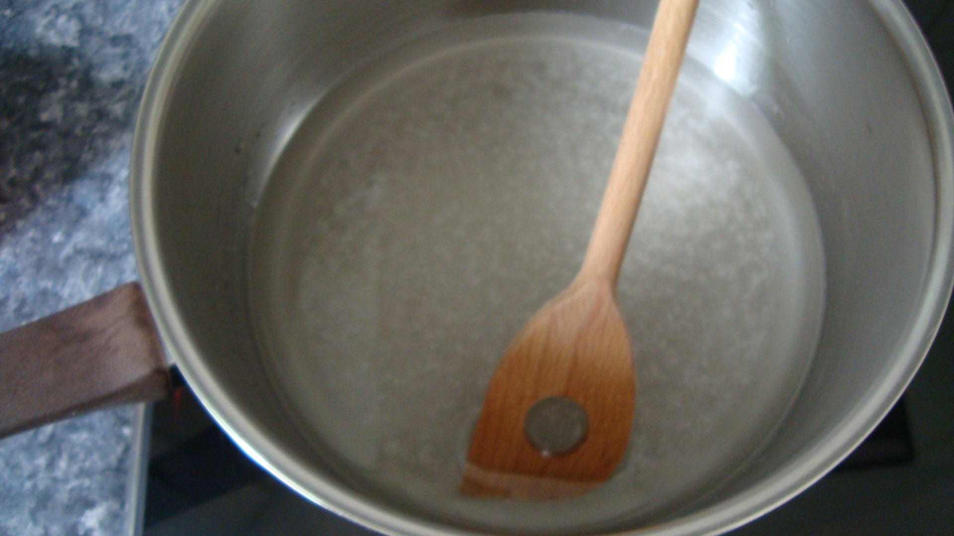 Wasser, Zucker und Vanillezucker in einem weiten Topf aufkochen.