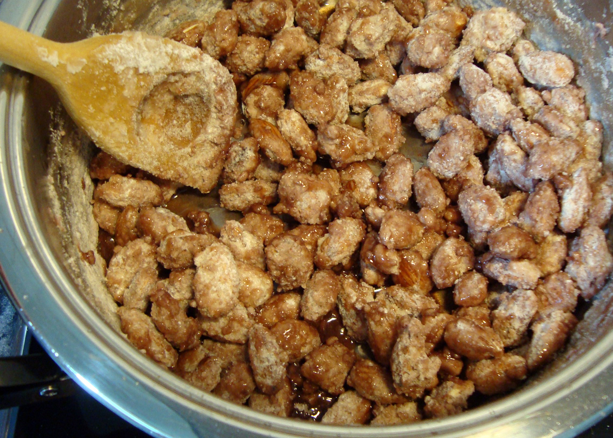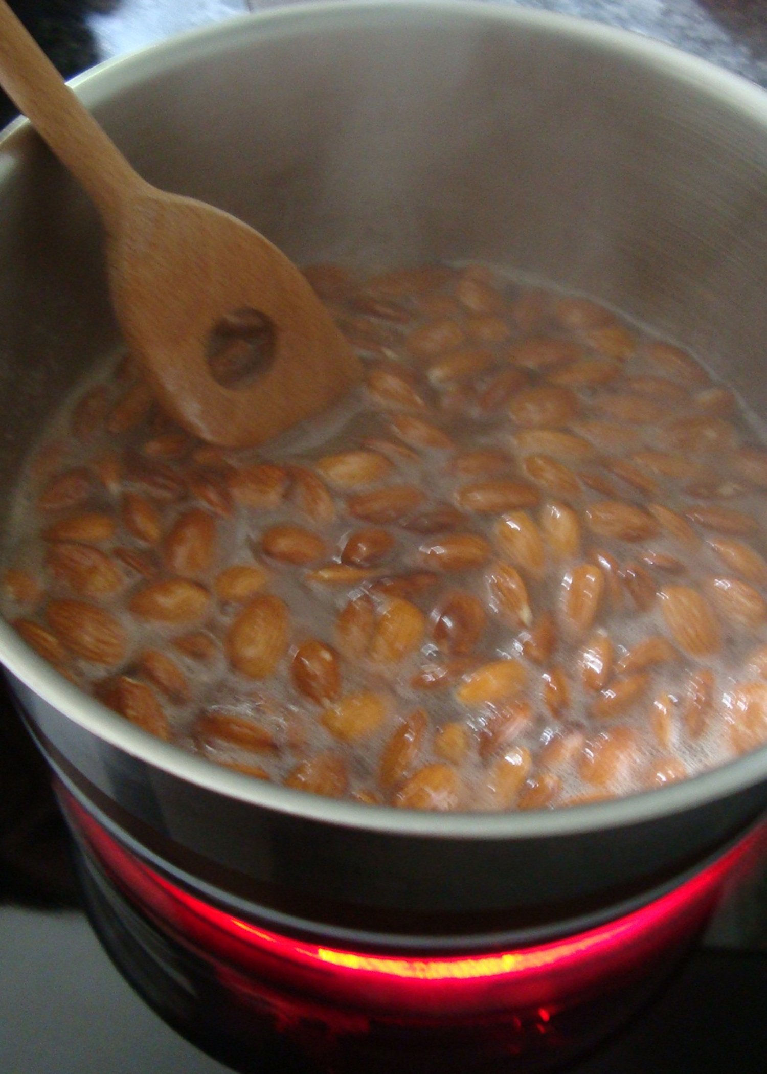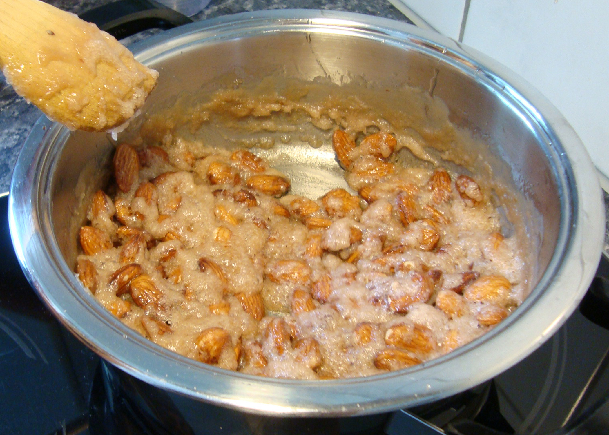 Nun die Hitze zurückschalten, Mandeln dazugeben und unter mittlerer Hitze den Zucker einkochen. Dabei nie aufhören zu rühren.