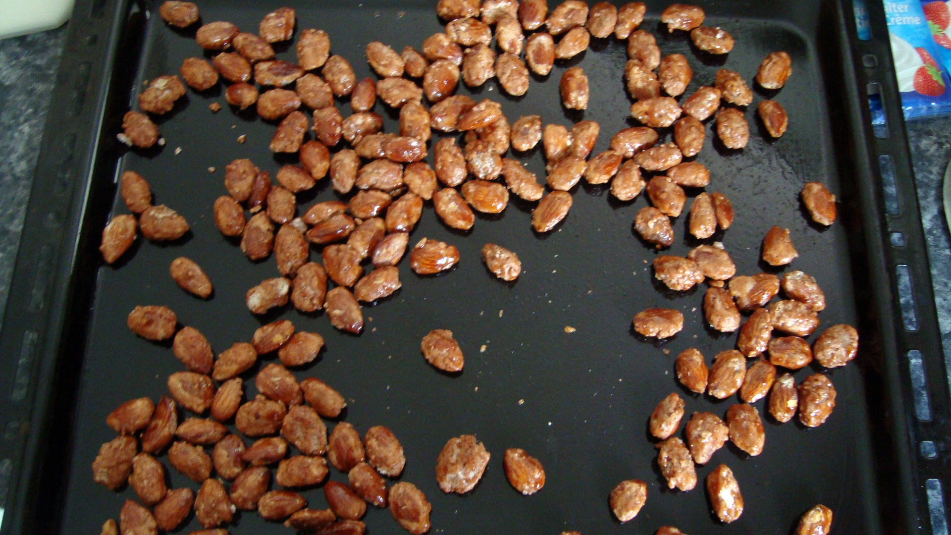 Nach einer Weile wird der Zucker ganz trocken und braun. Immer noch weiter rühren bis der Zucker wieder leicht zu schmelzen beginnt und leise Krachlaute der Mandeln zu hören sind. Schlussendlich sollten sie leicht glänzen.