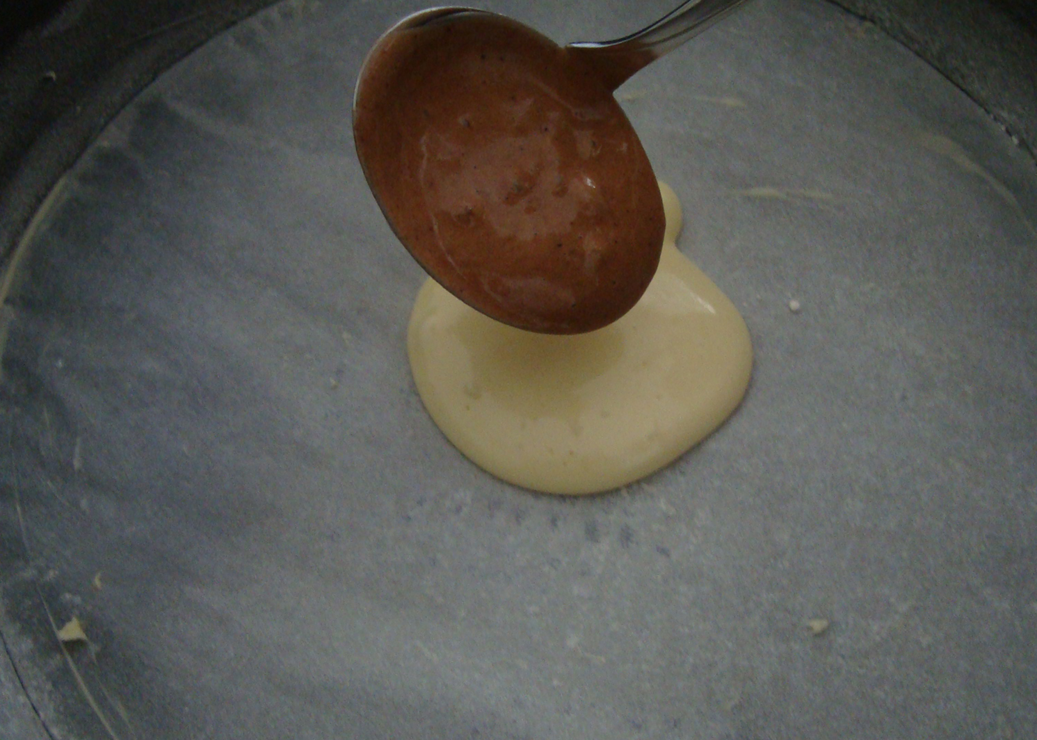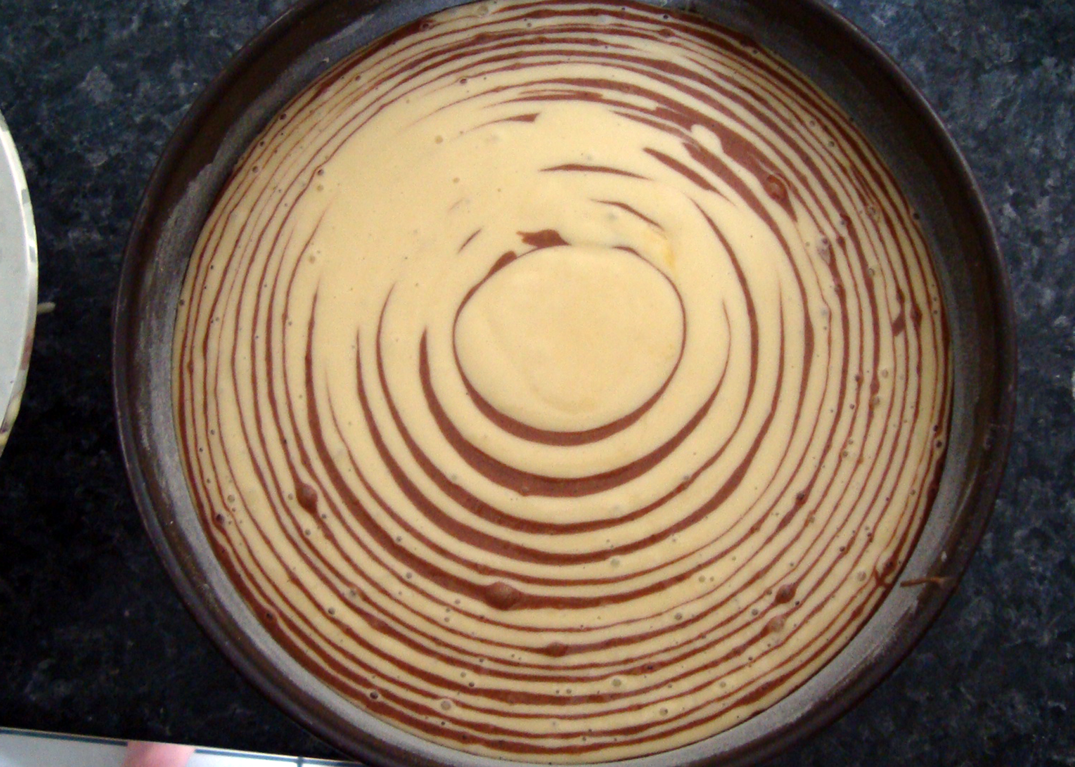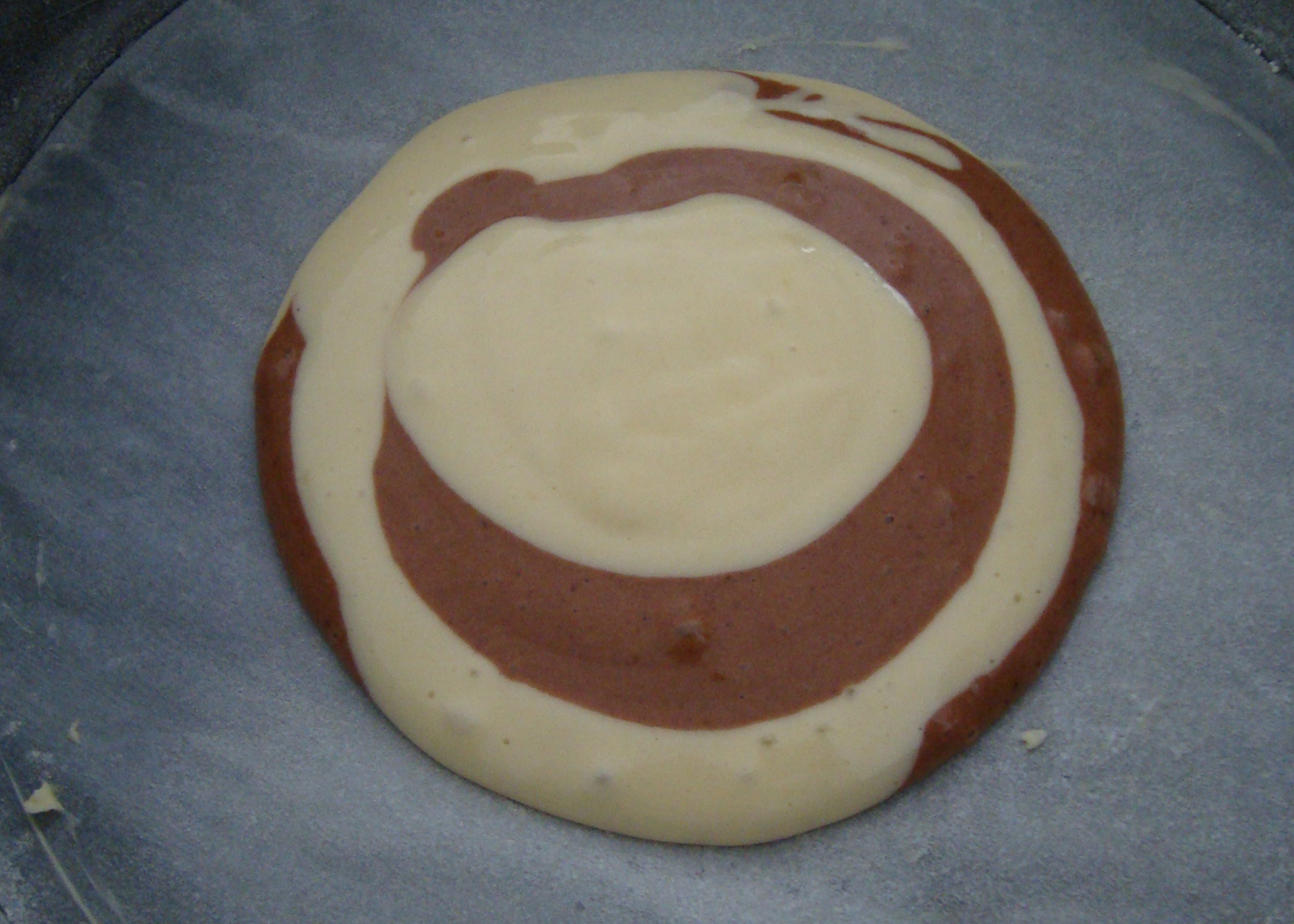 Nun folgt der etwas kompliziertere Teil. Dieser benötigt eine ordentliche Portion Geduld und gelingt besser in Partnerarbeit als alleine. Zuerst für beide Massen einen gleich grossen Löffel bereitstellen. Eine Person ist dabei für die dunkle und eine für die helle Masse zuständig. Abwechselnd gibt jetzt jede Person einen Löffel der seinigen Masse ganz genau in die Mitte der Springform. Die Massen fliessen so immer mehr auseinander und das gewünschte Muster entsteht.