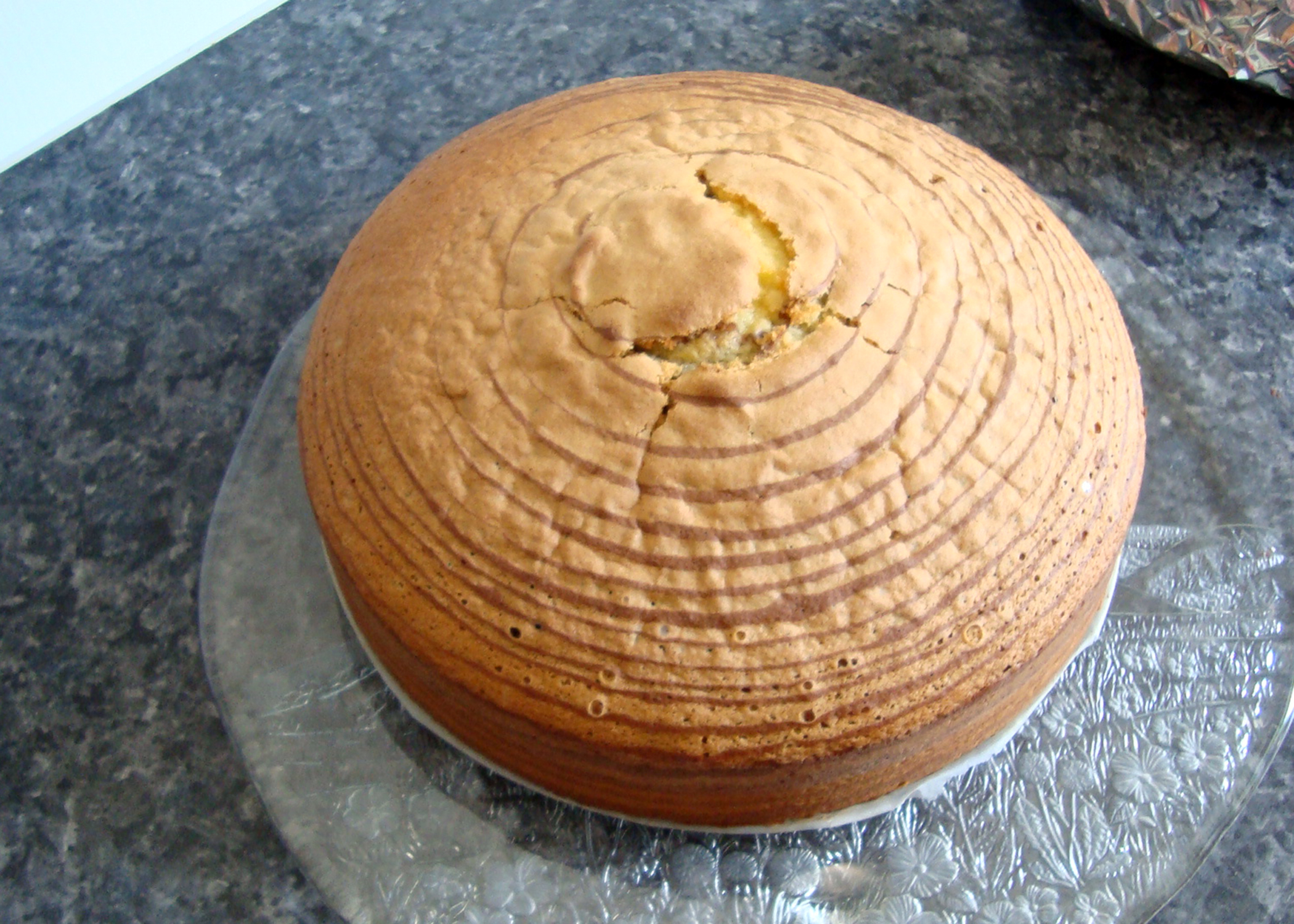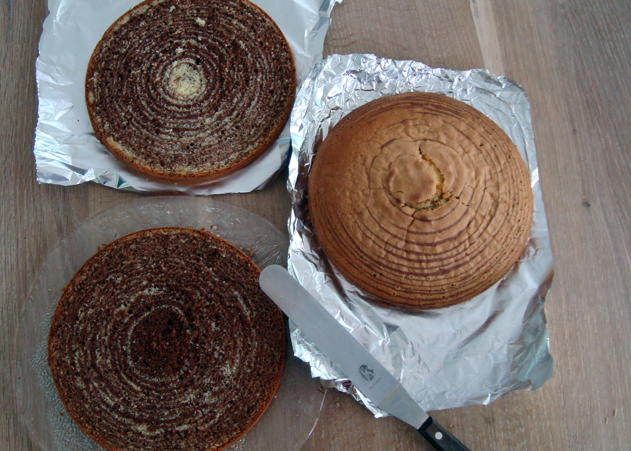 Als nächstes den ausgekühlten Biskuitboden zweimal vorsichtig waagrecht durchschneiden.
