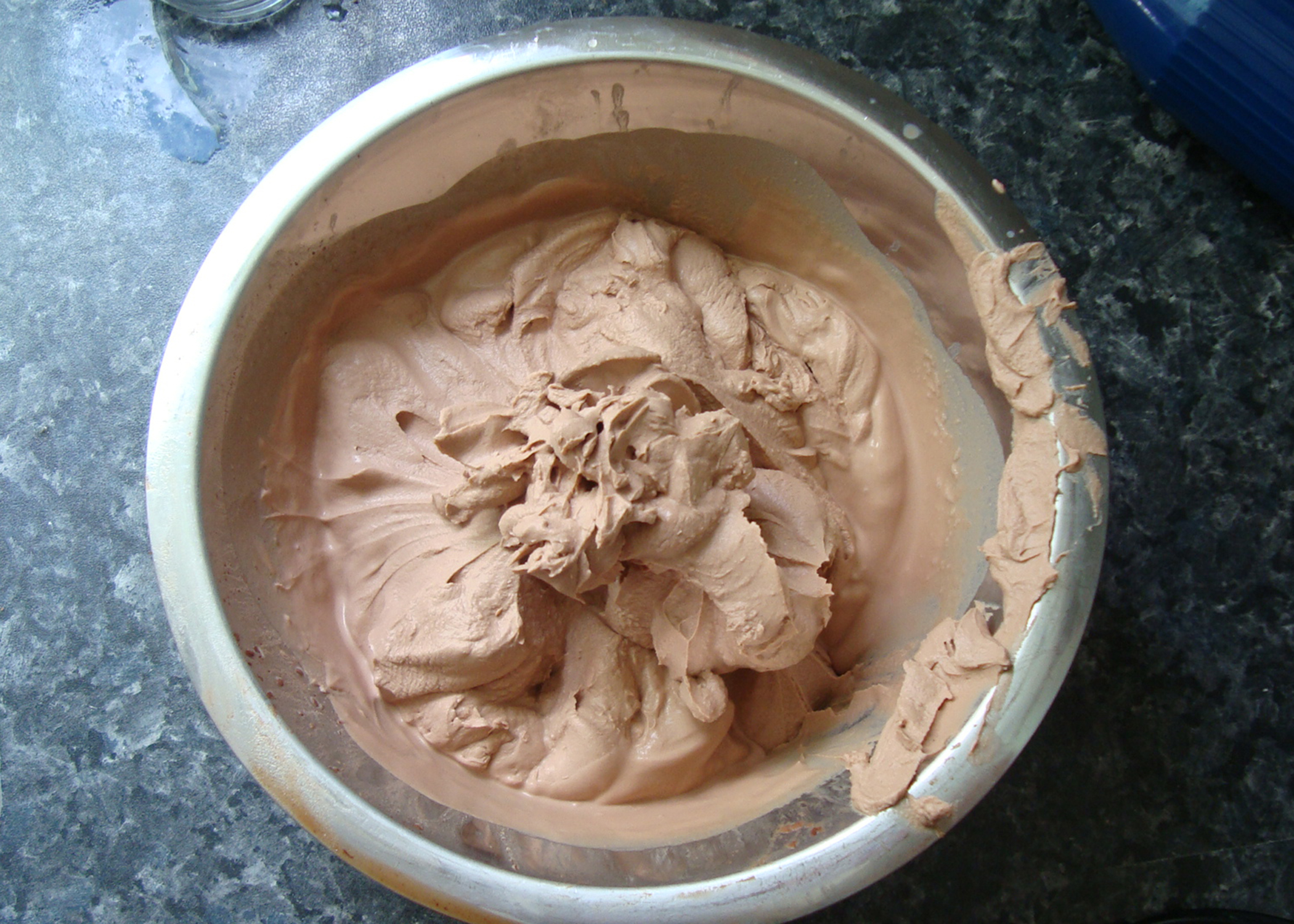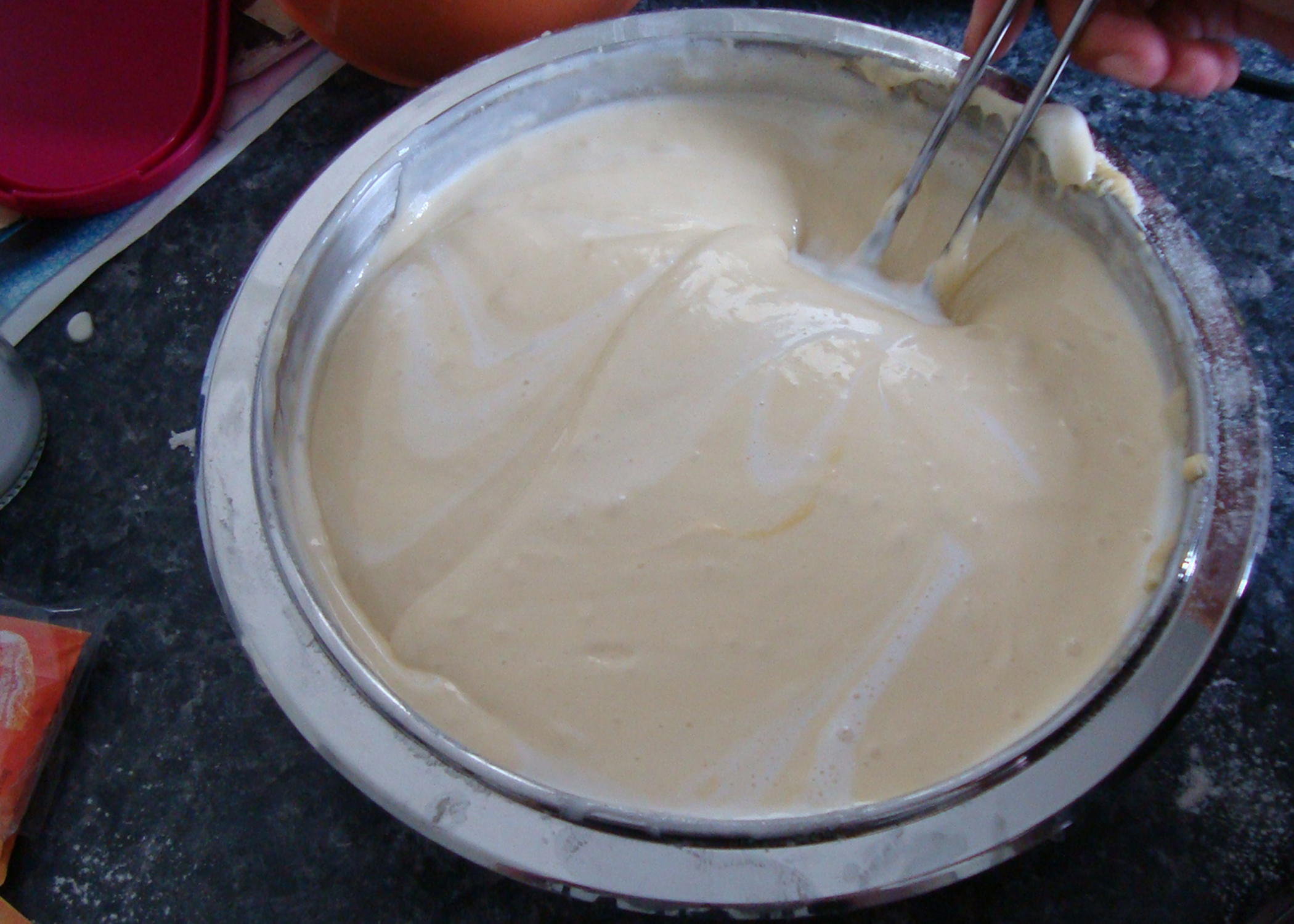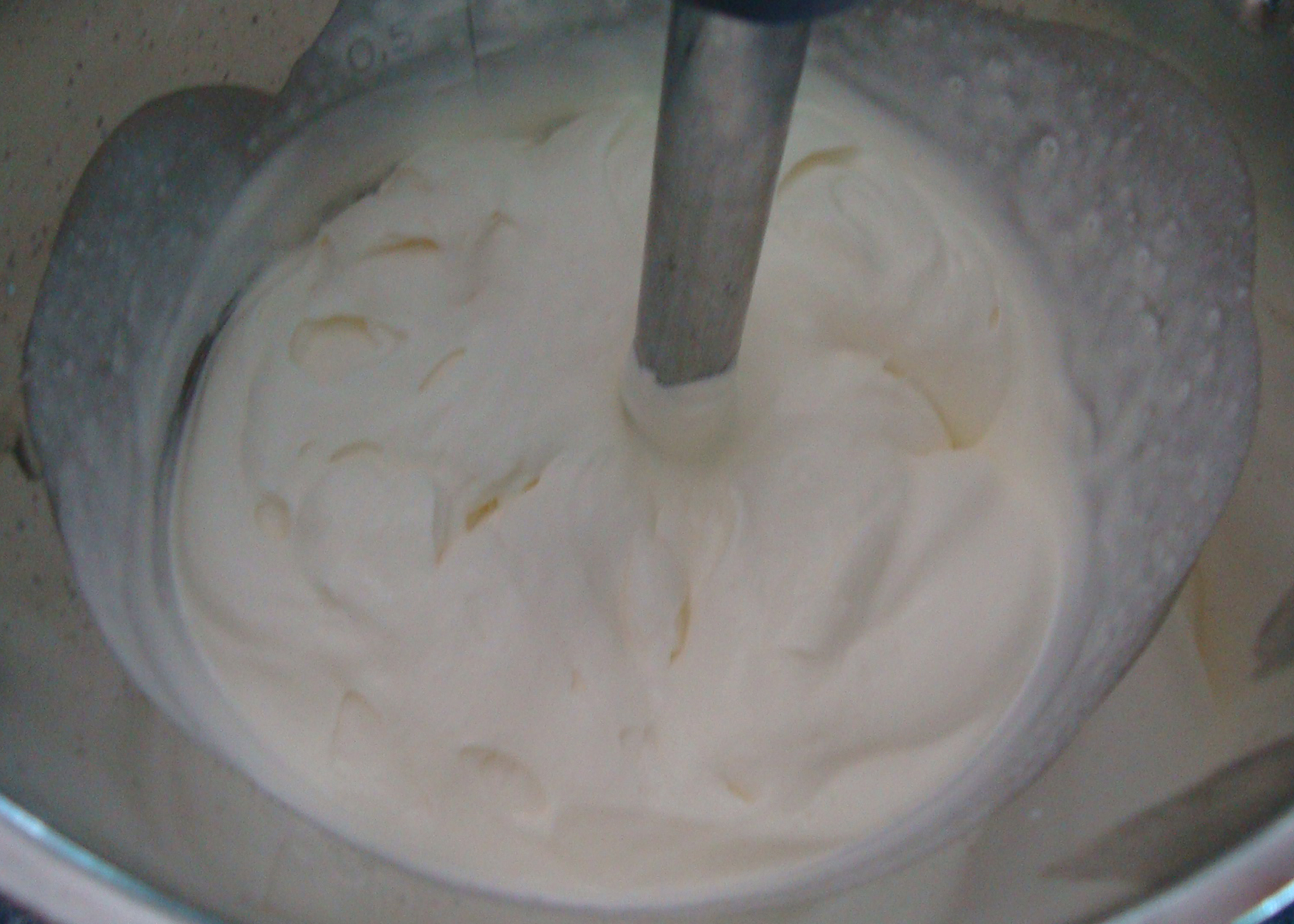 Die am Vortag vorbereitete Füllung aufschlagen damit sie fest wird. Wiederum mit Hilfe einer Waage halbieren und die eine Hälfte noch einmal halbieren. So hat man also drei Schüsseln vor sich: ¼,¼ und ½ der Masse. Die Schüssel mit der Hälfte dient als Überzug und die anderen beiden braucht man jetzt für als Füllung.