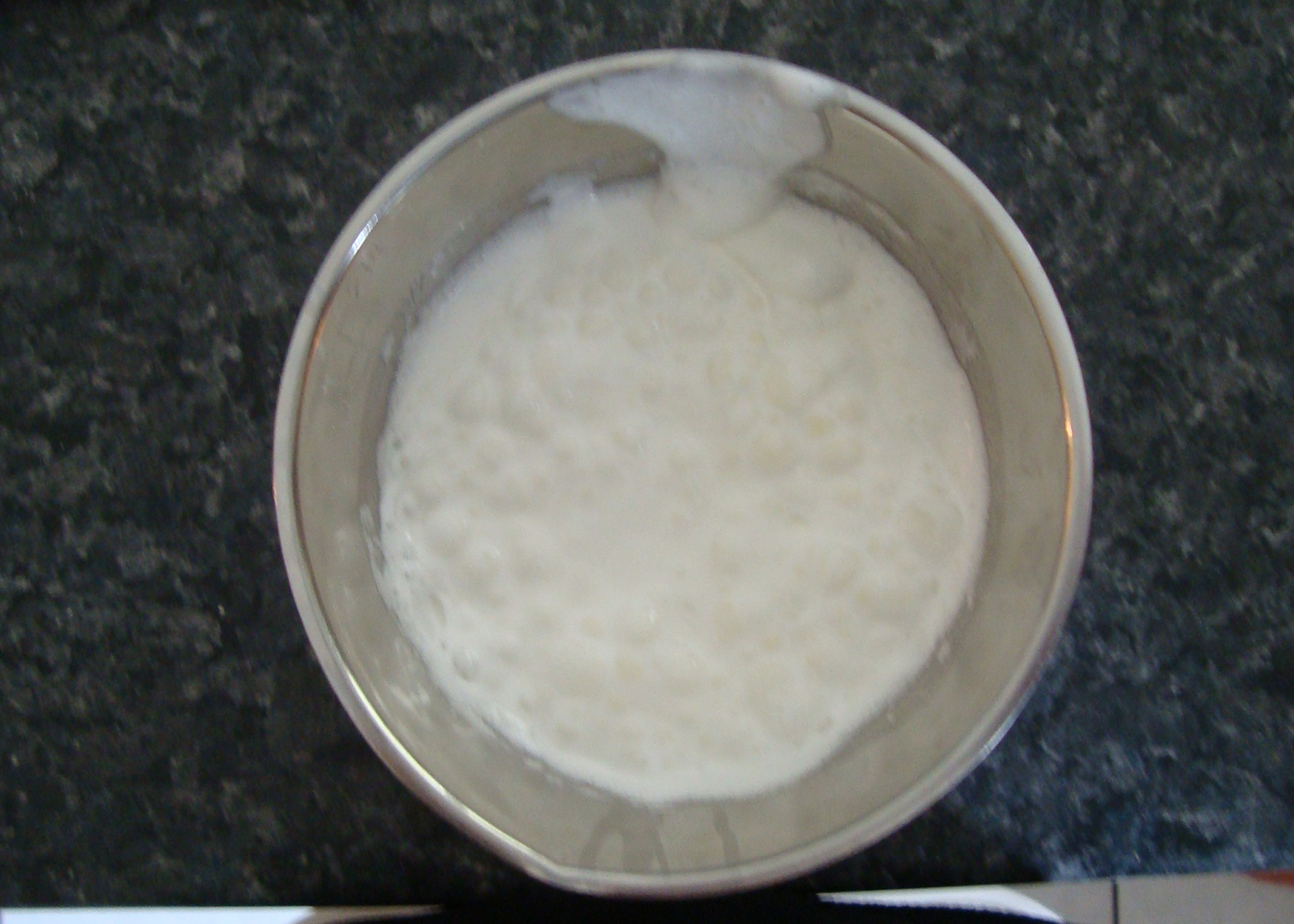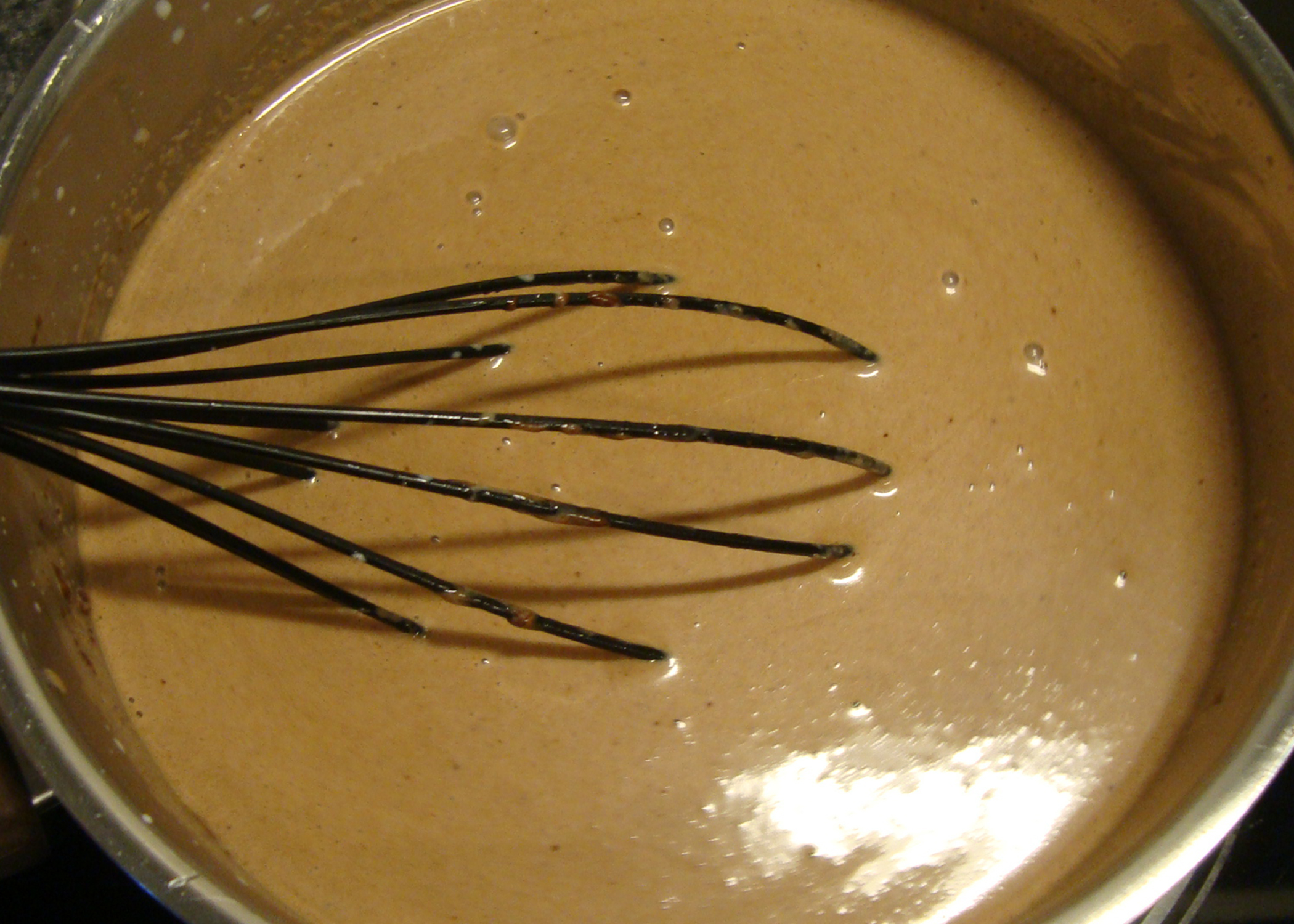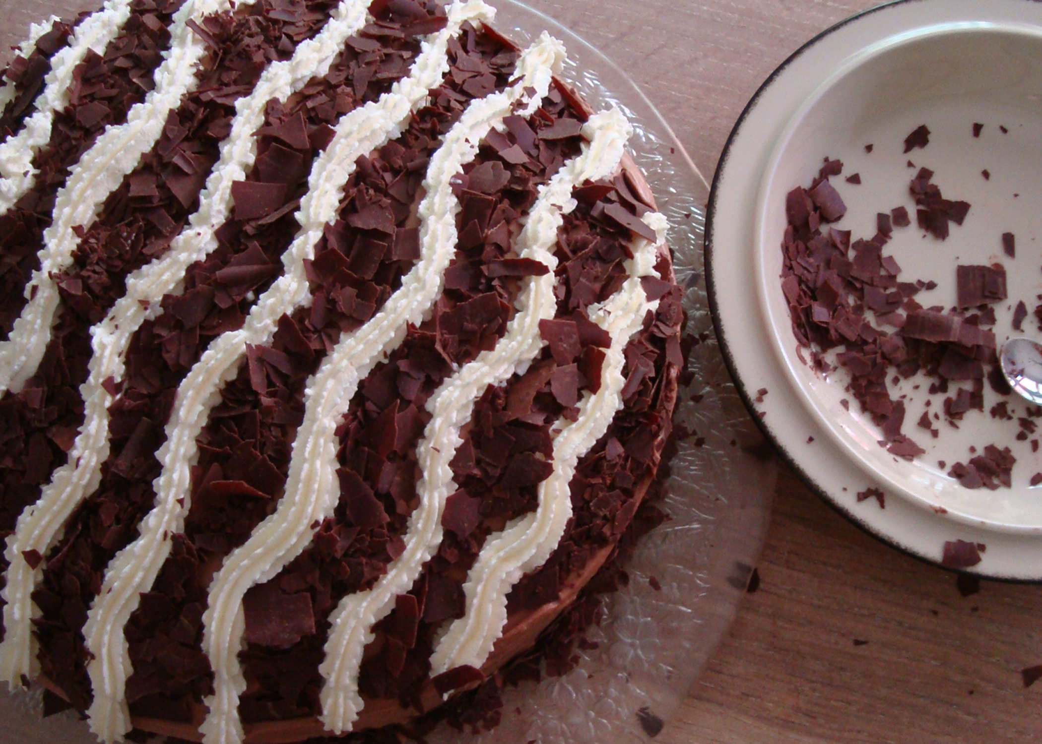 Die am Vortag vorbereitete Füllung aufschlagen damit sie fest wird. Wiederum mit Hilfe einer Waage halbieren und die eine Hälfte noch einmal halbieren. So hat man also drei Schüsseln vor sich: ¼,¼ und ½ der Masse. Die Schüssel mit der Hälfte dient als Überzug und die anderen beiden braucht man jetzt für als Füllung.
